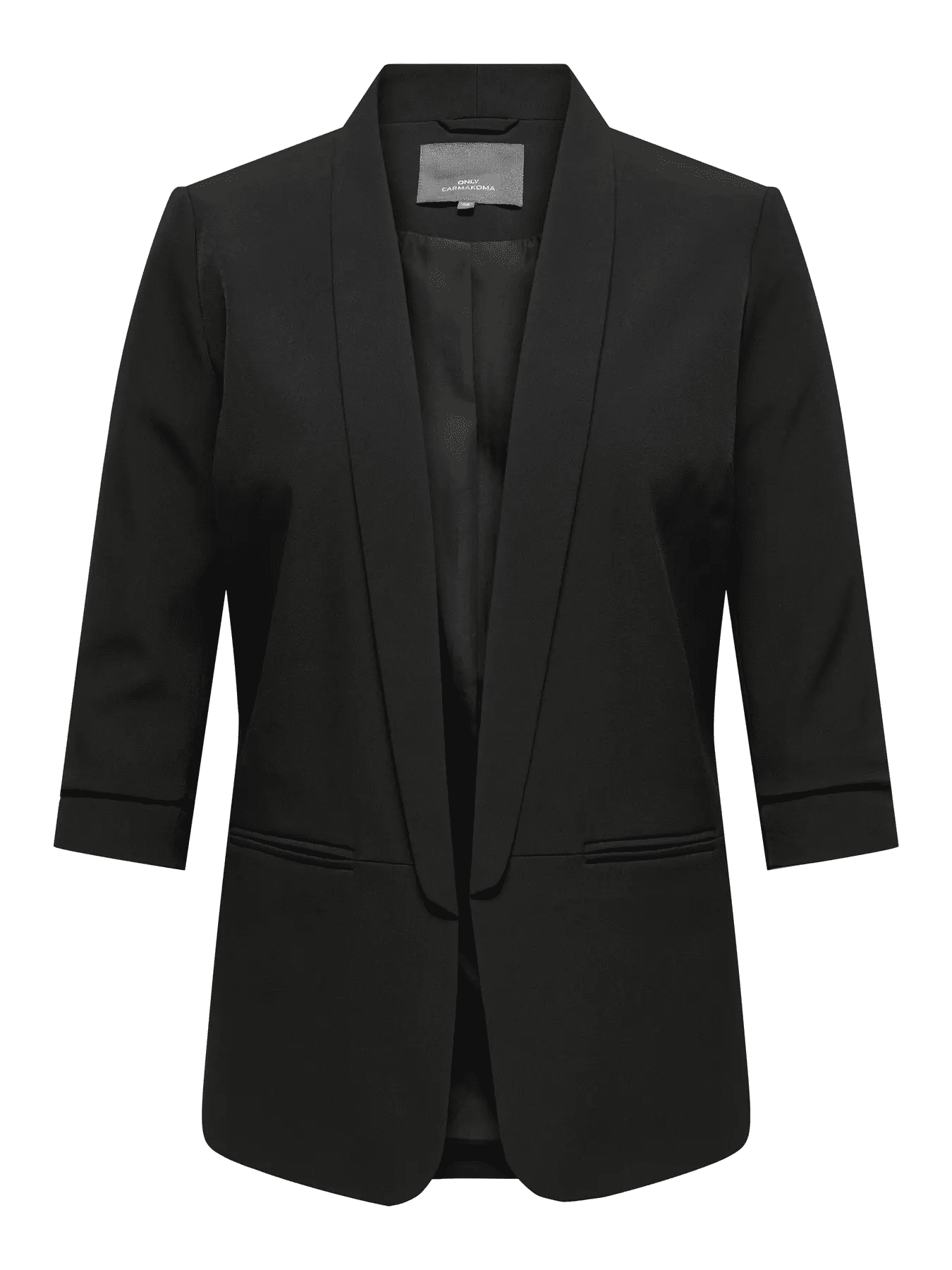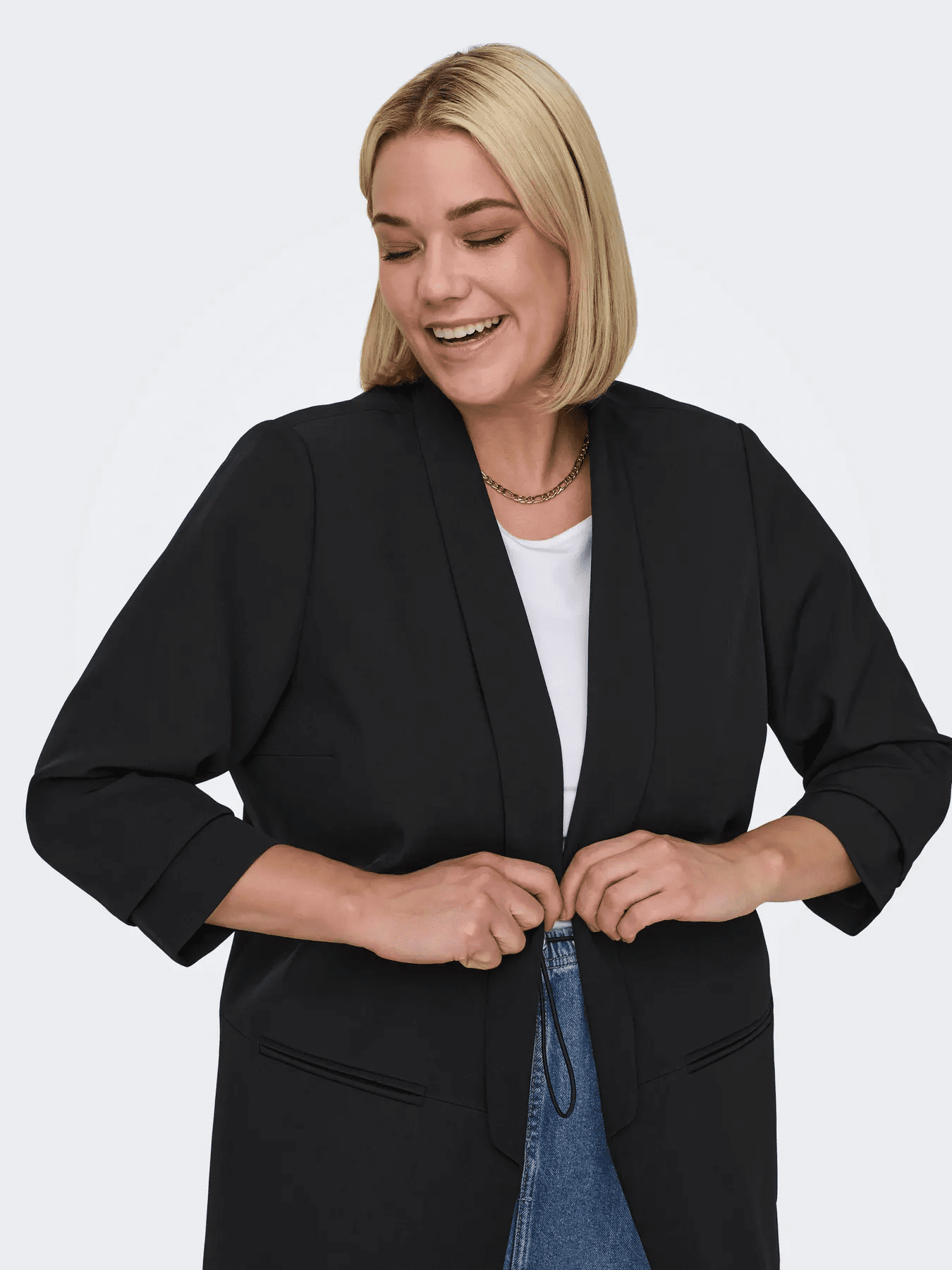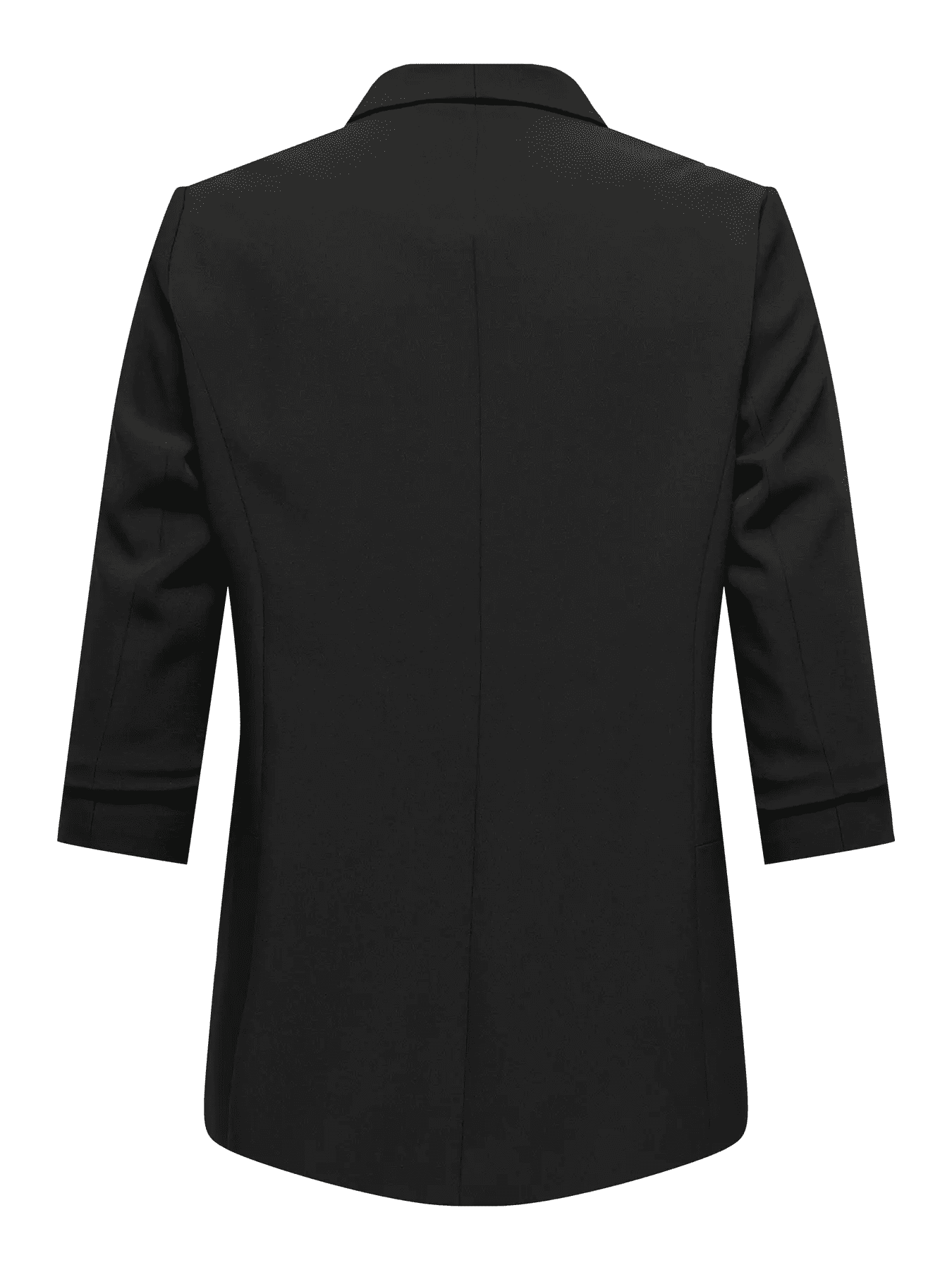 Blazer com manga a 3/4, na cor preto, de comprimento pela anca.