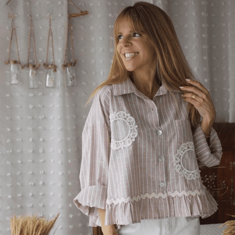 Blusa bege tipo camisa, com risca branca e detalhes em renda cru à frente e atrás, assim como no cós. Manga comprida.