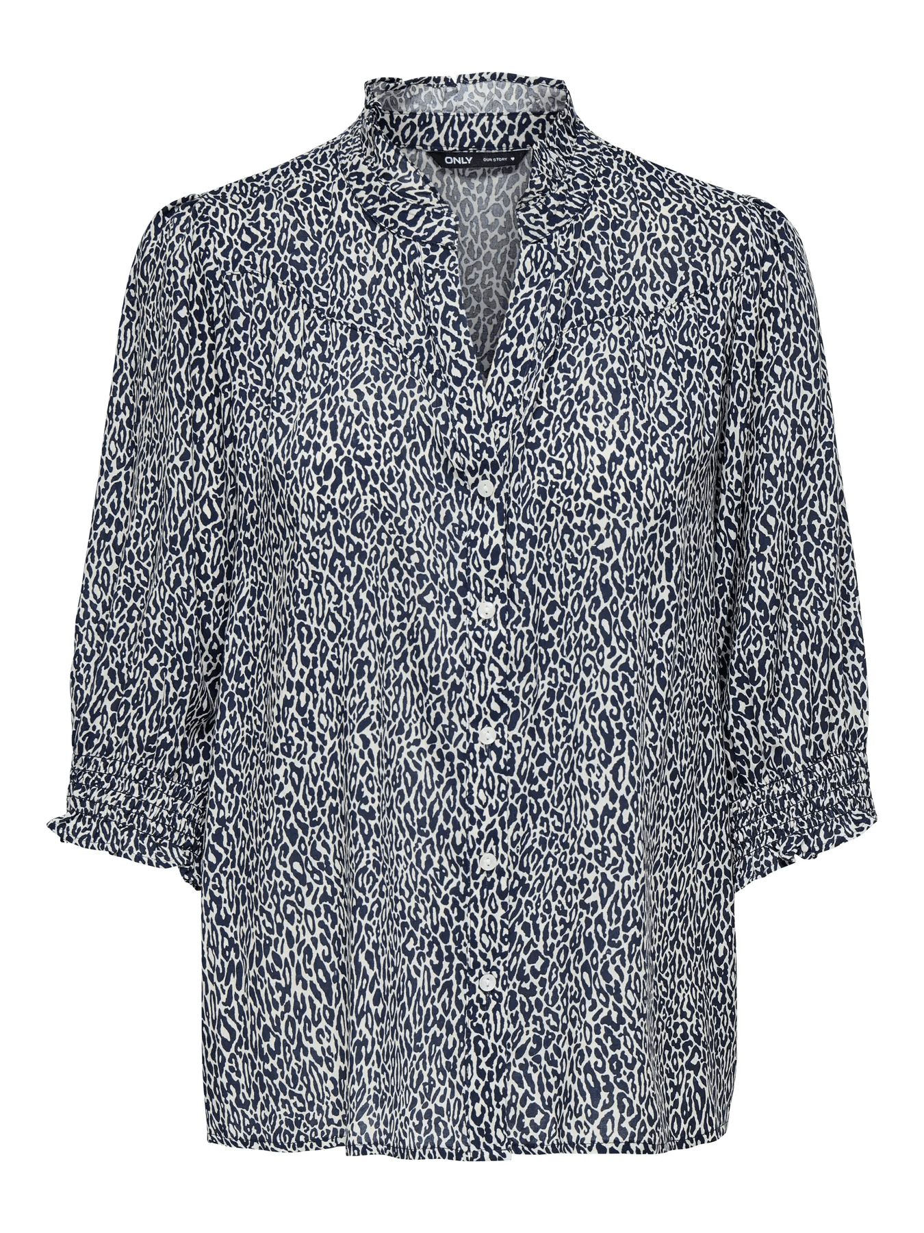 Blusa/camisa animal print azul, com manga a 3/4 com elástico no punho. Gola subida com folho.