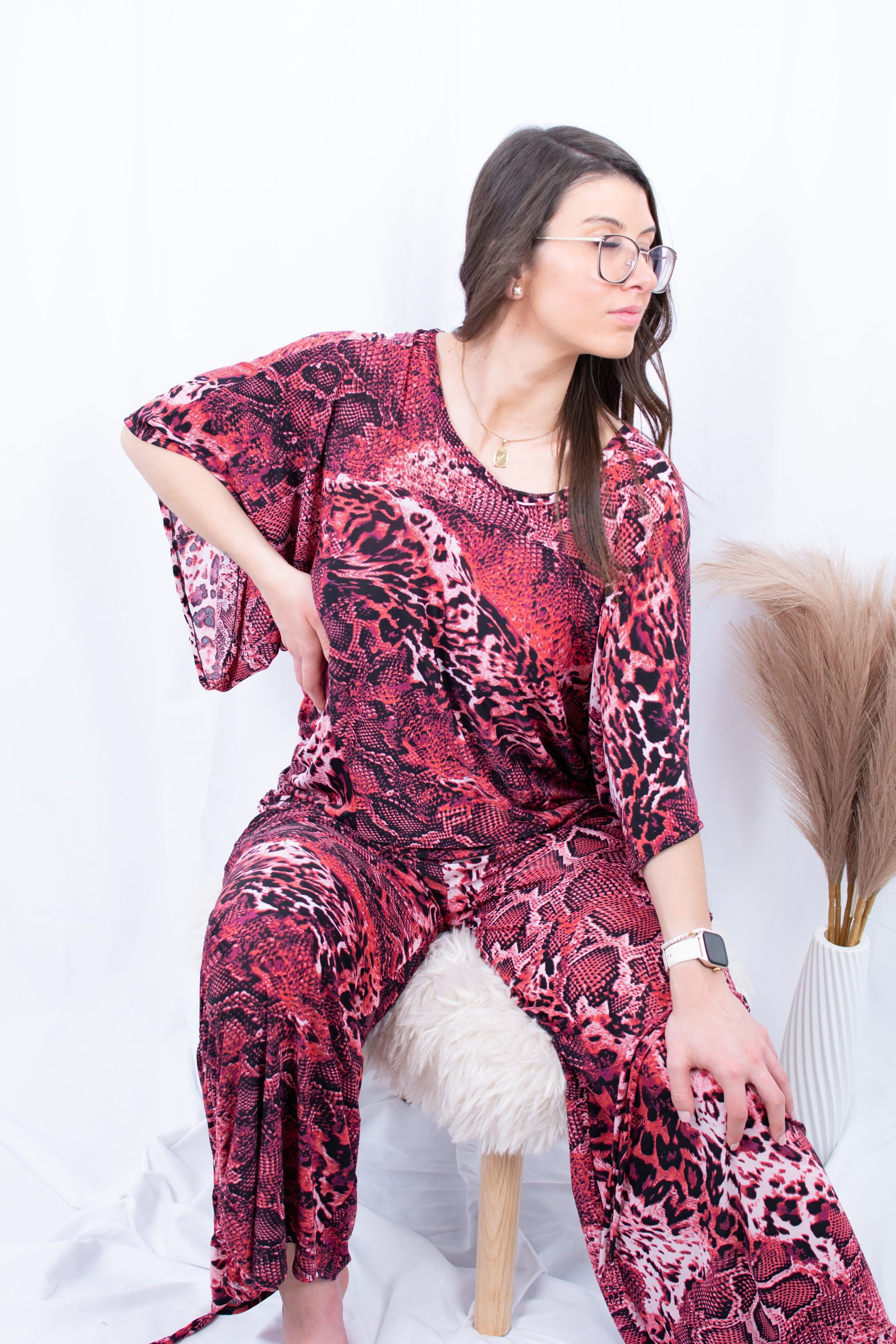 Blusa/capa, padrão animal rosa e preto, manga kimono.