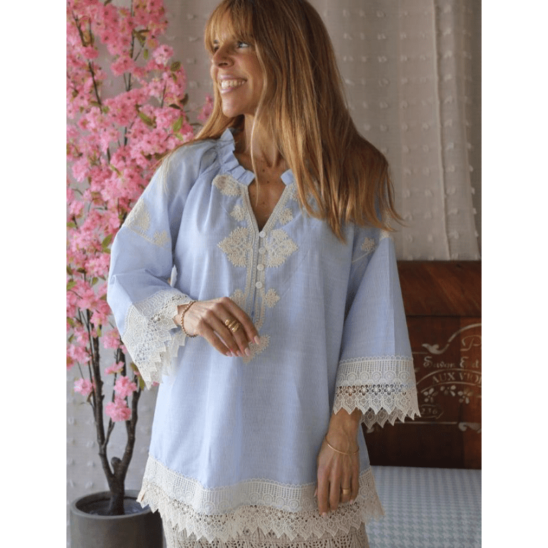 Blusa tipo túnica, azul claro com risca quase imperceptível. Decote em V com folho e detalhes em renda bege na zona do peito, punhos e cós.