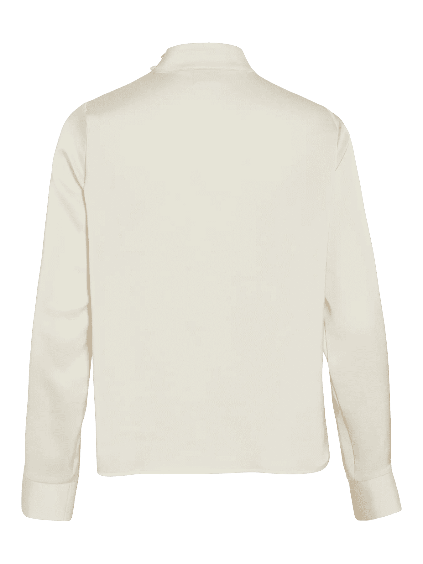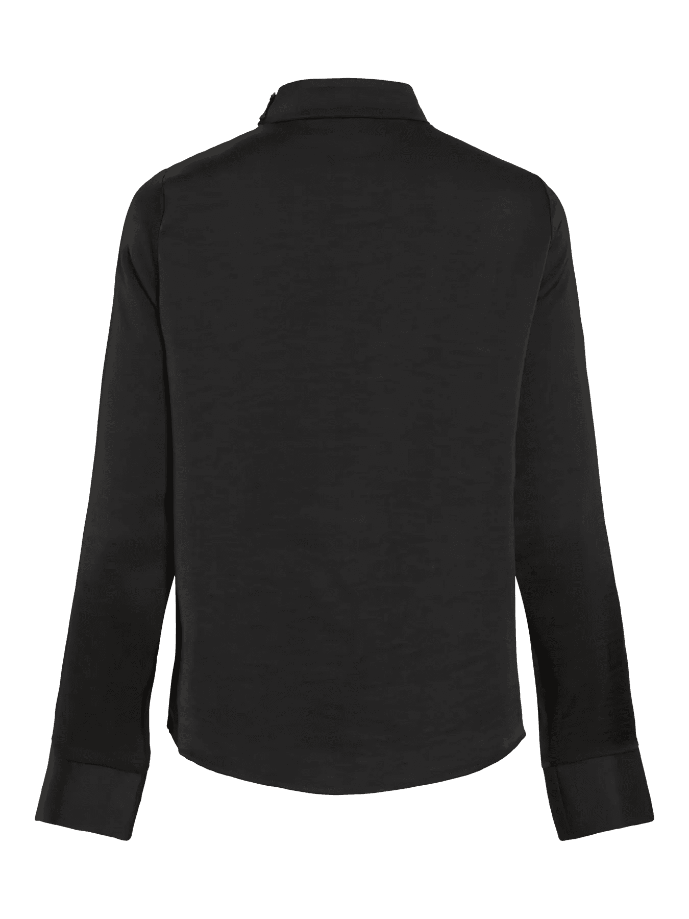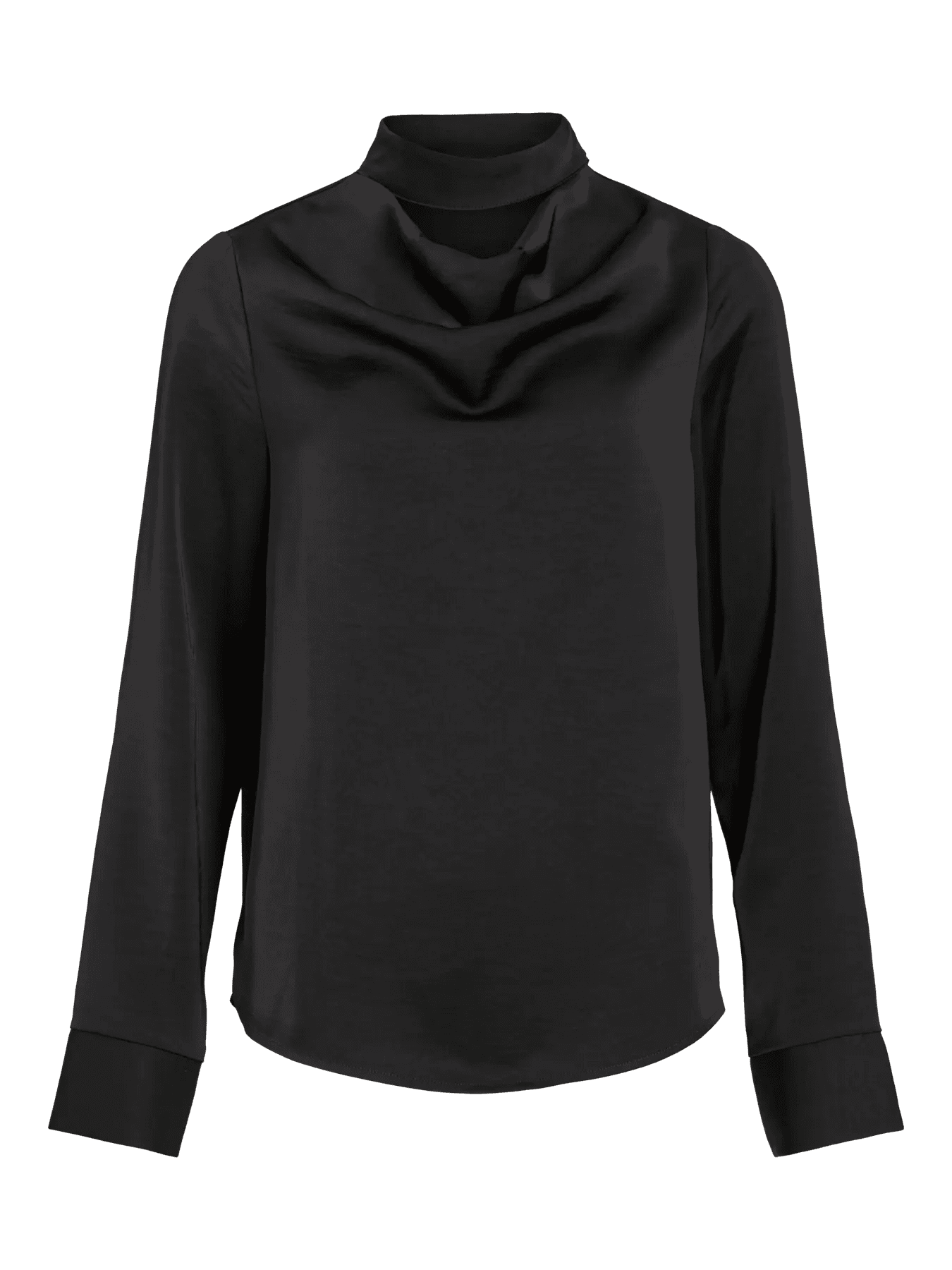 Blusa elegantíssima, acetinada, de manga comprida fluída, com punho de camisa. Decote ligeiramente drapeado com efeito de meia gola no pescoço.