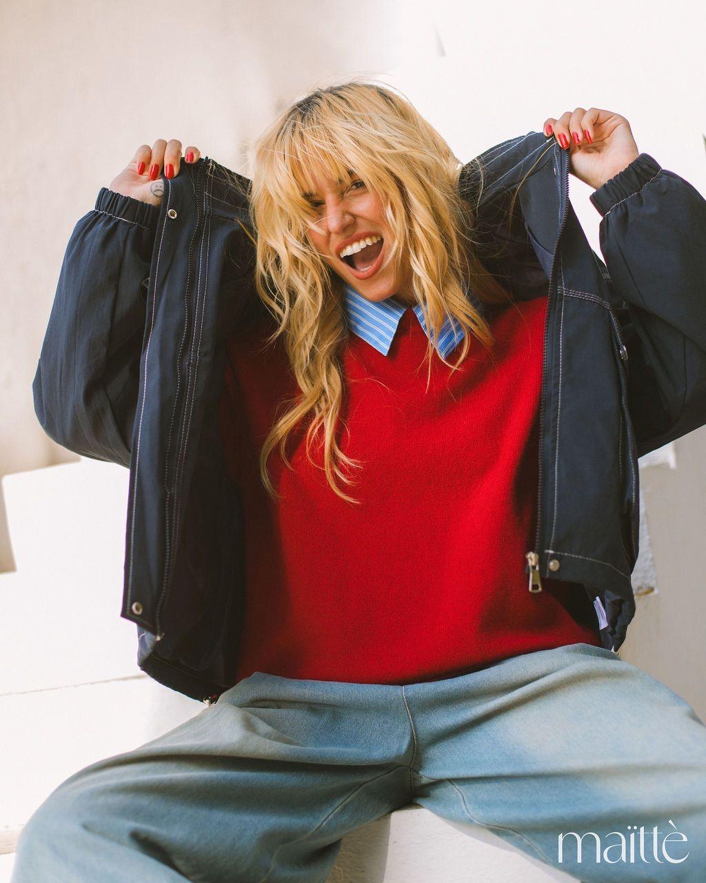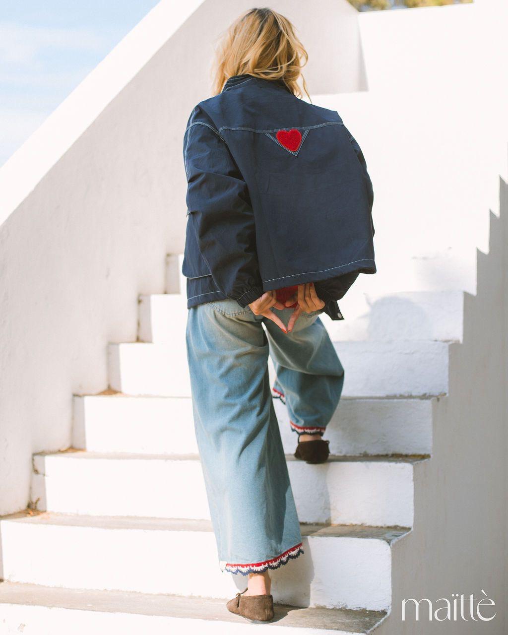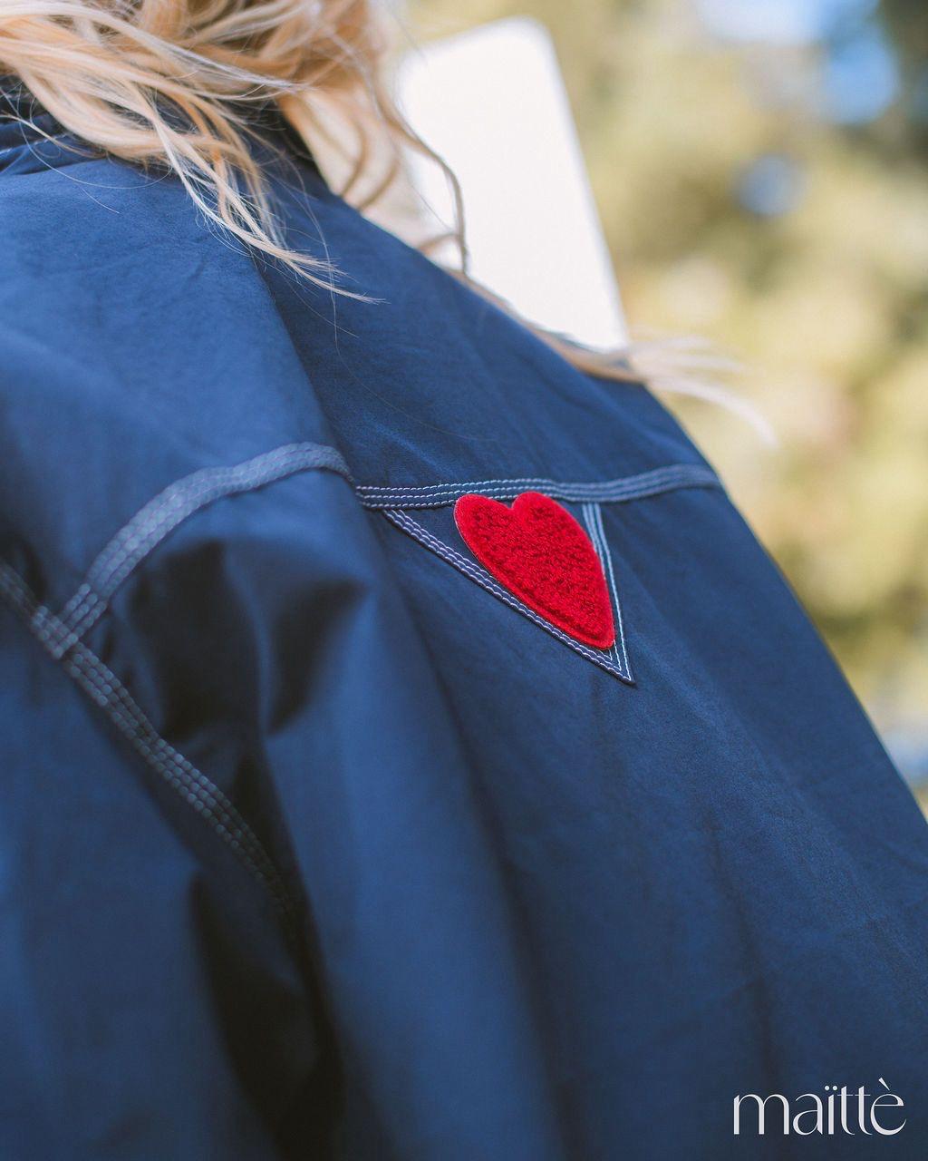 Blusão oversize, azul escuro, com coração vermelho nas costas.