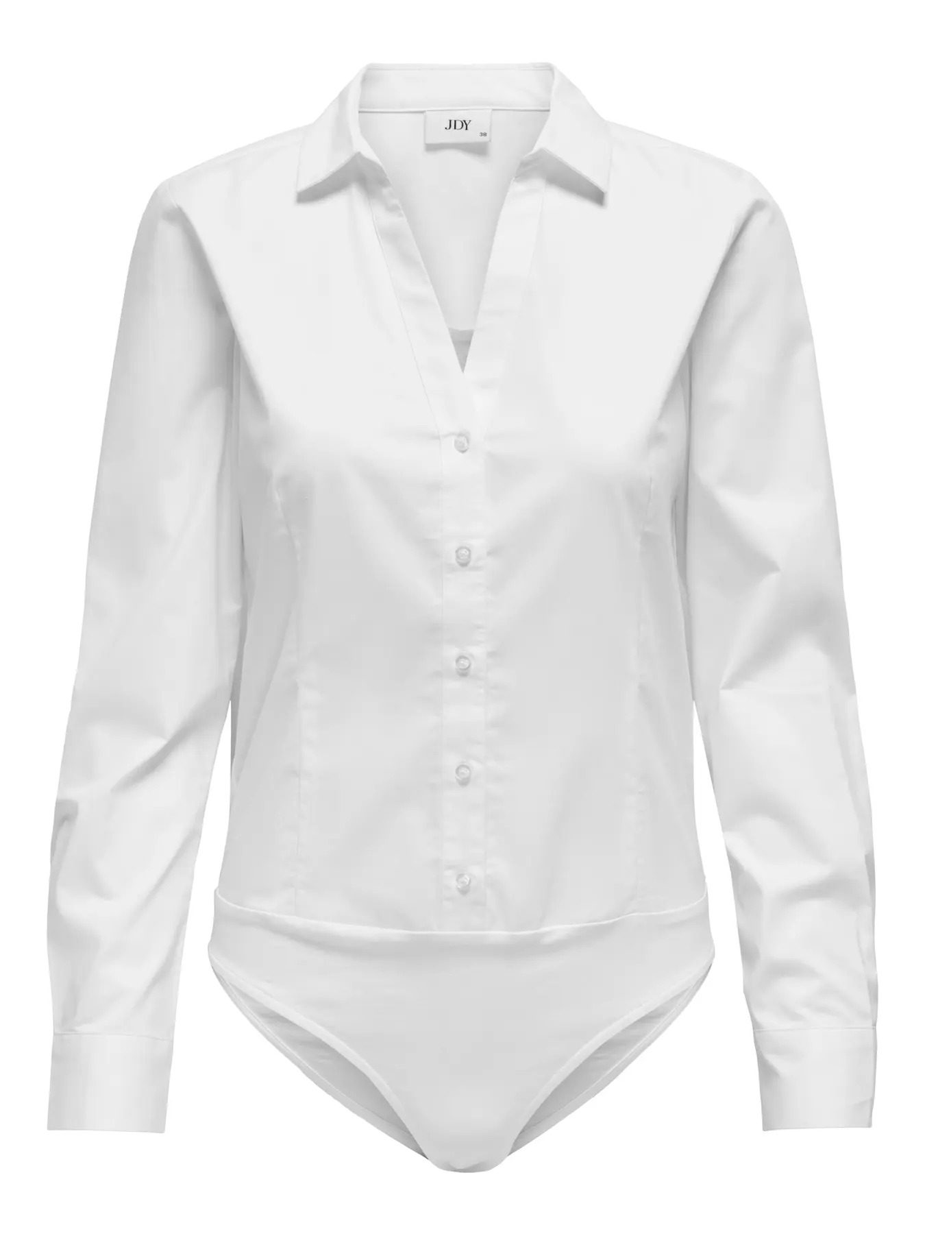 Body estilo camiseiro, de manga comprida. Decote em V. Perfeito para usar com um fato completo ou mesmo com uma calça de ganga.