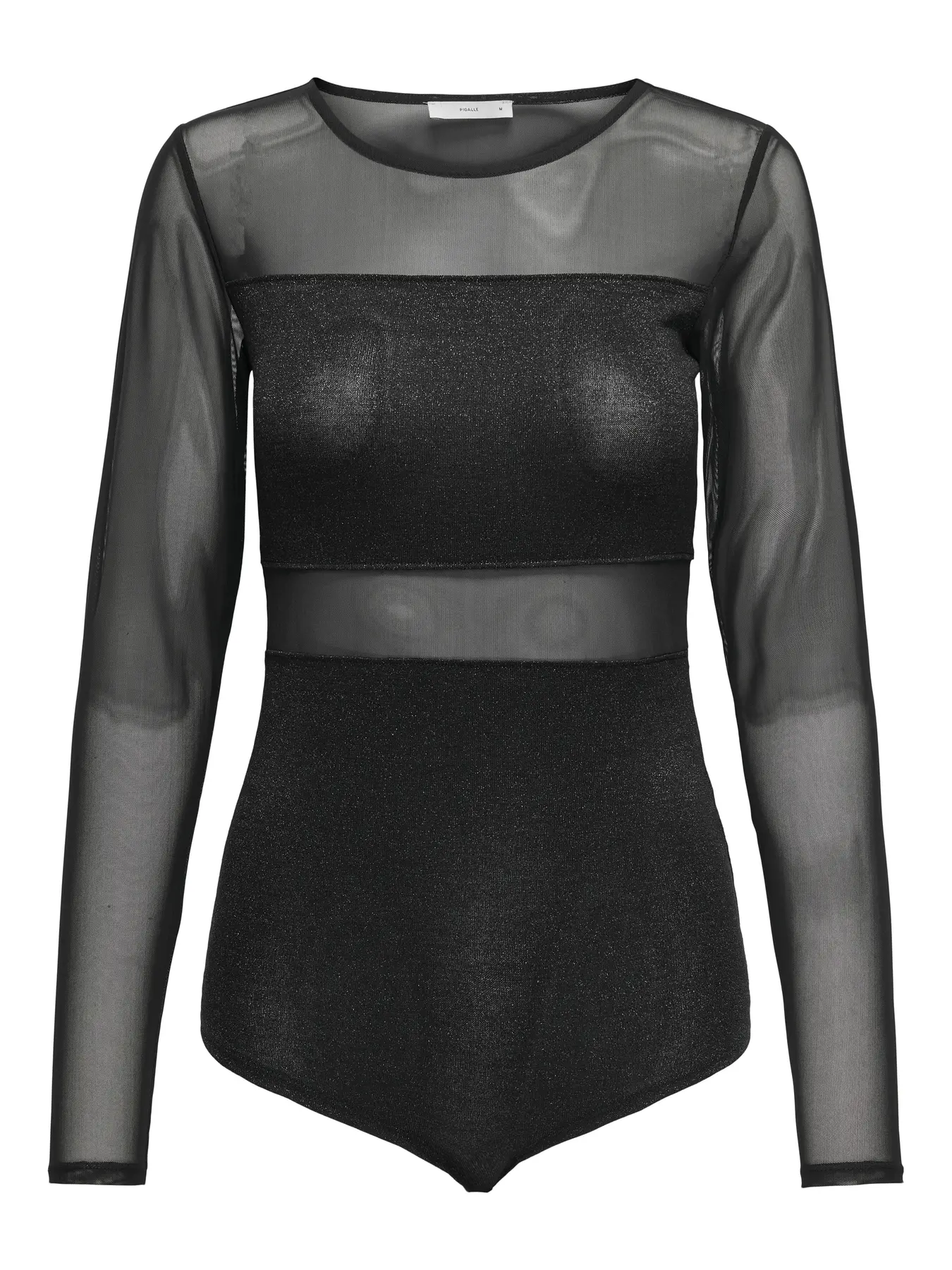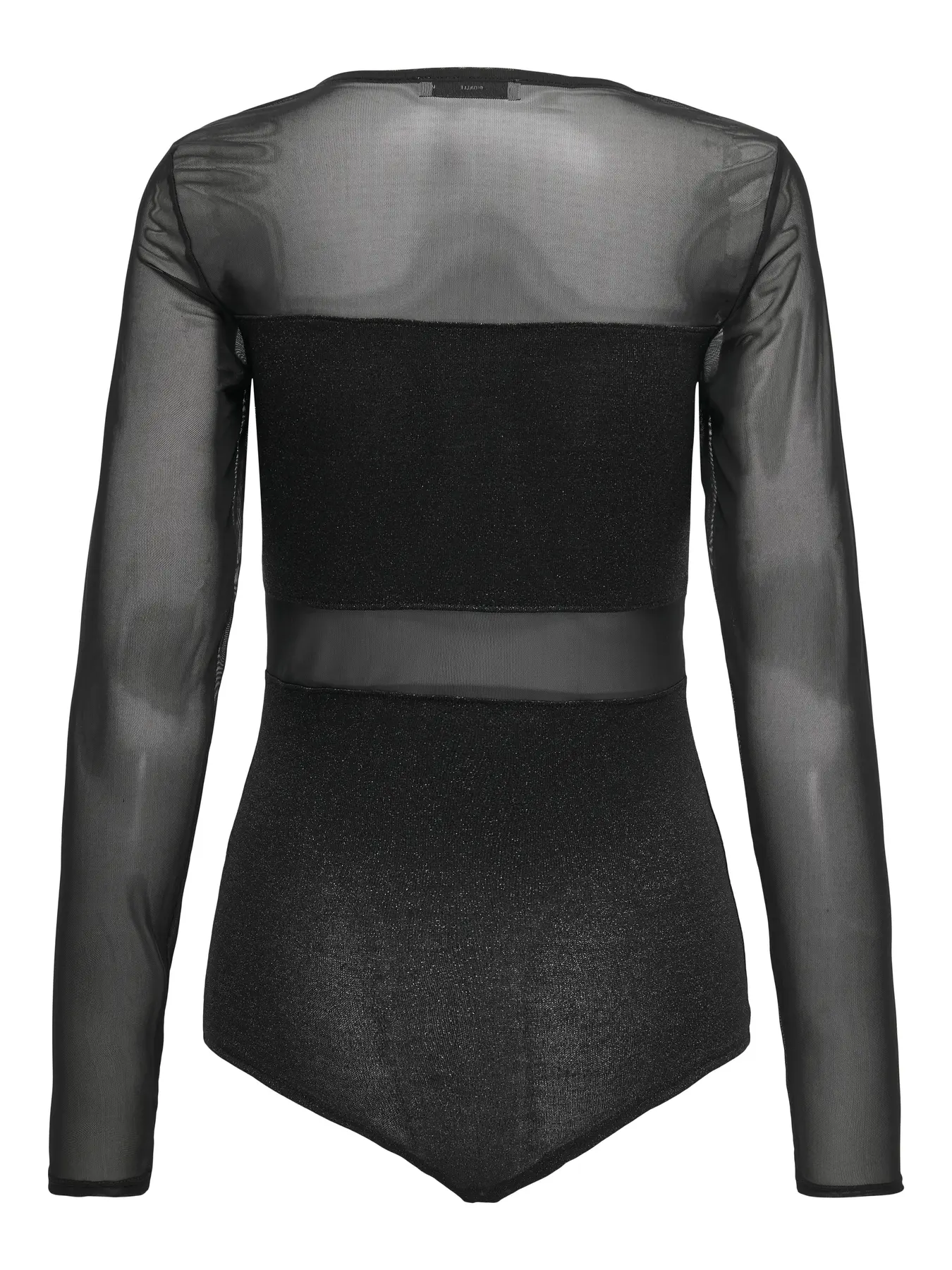 Body em tom preto, de manga comprida. Decote subido, redondo. Alterna entre a transparência e o fosco.