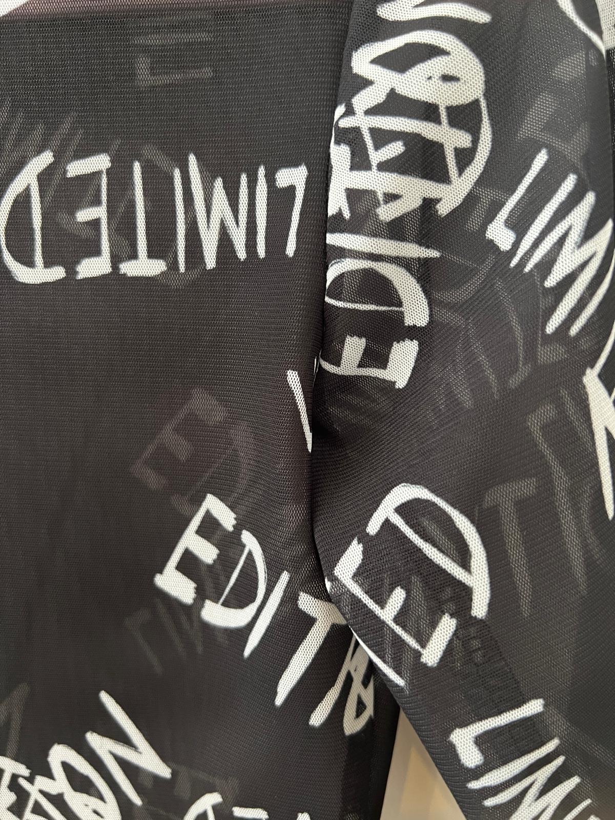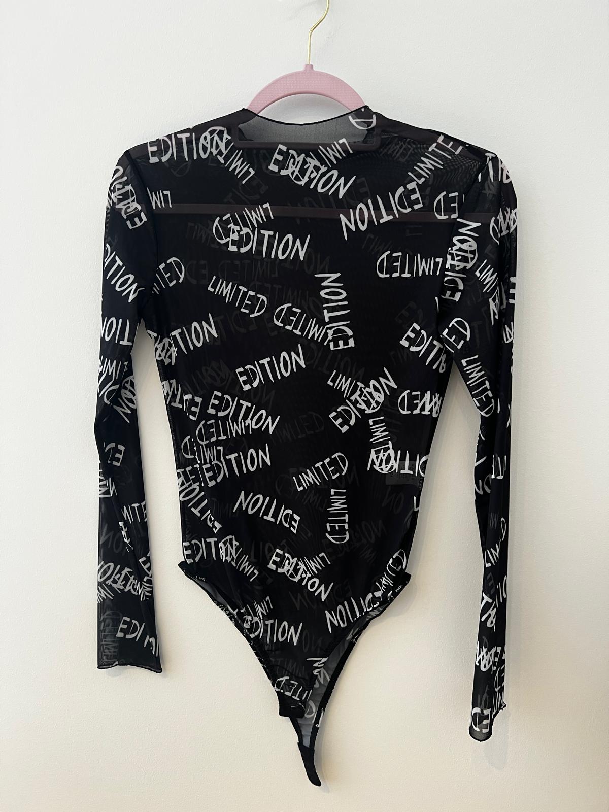 Body transparente, preto e branco com letras “LIMITED EDITION”, de manga comprida.