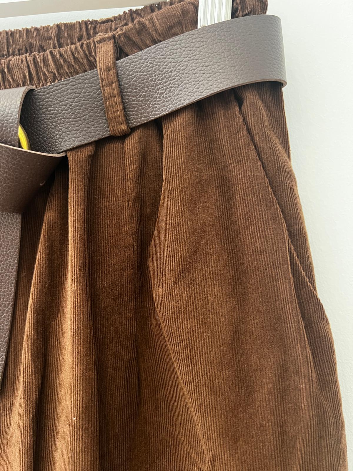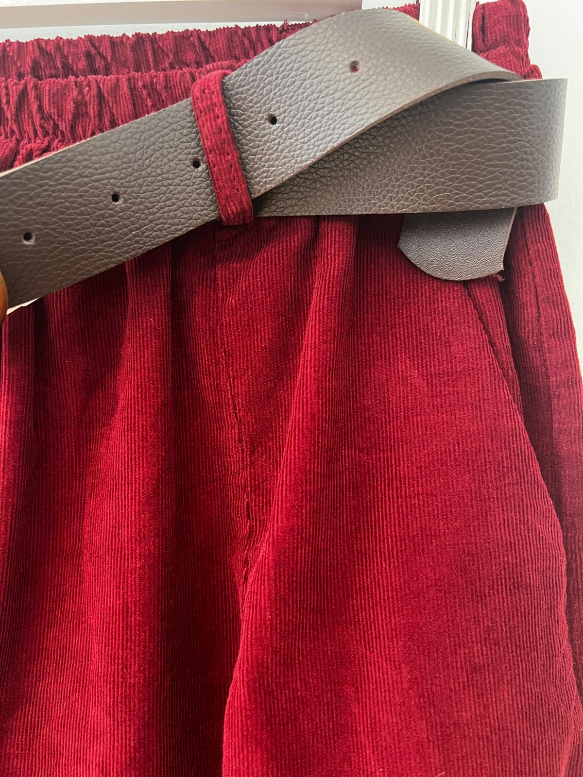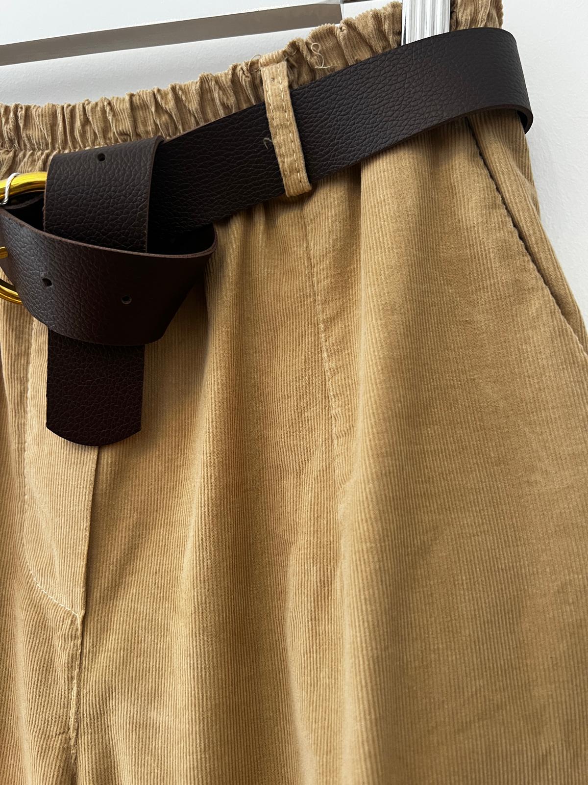 Calça tipo culote, em bombazina fina. Cintura subida com elástico, para melhor ajuste. Cinto castanho incluído.