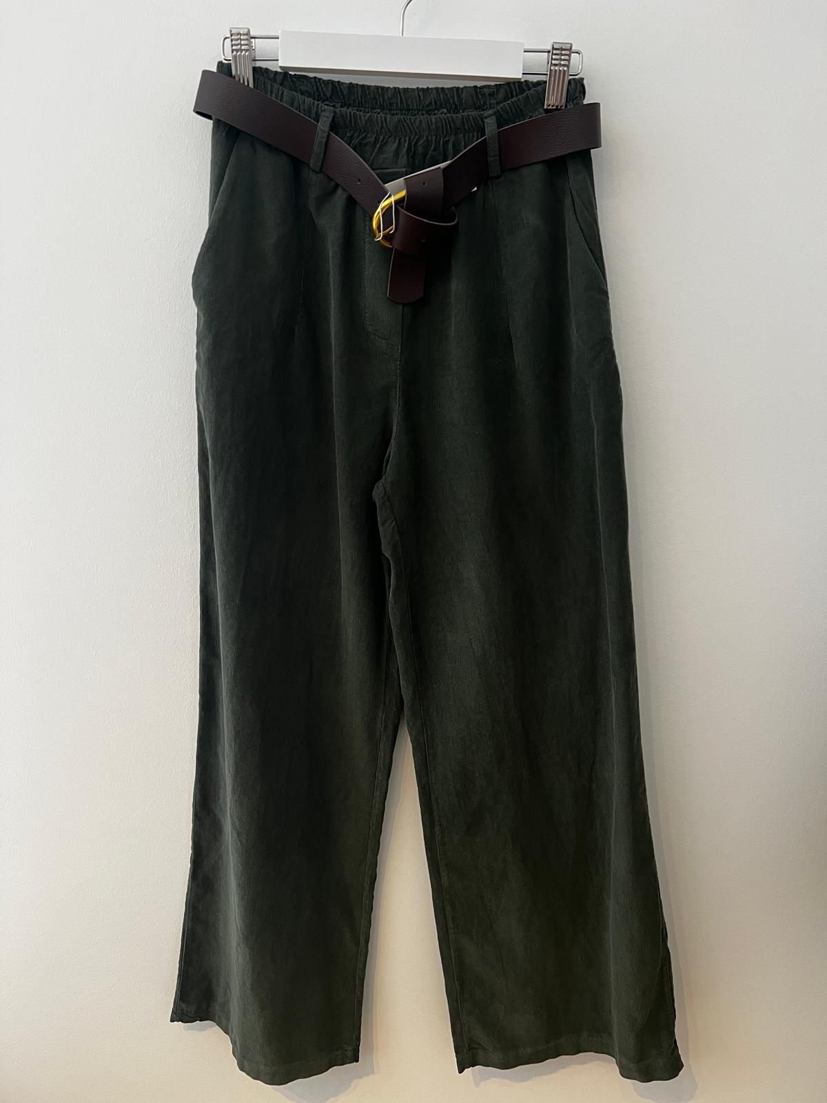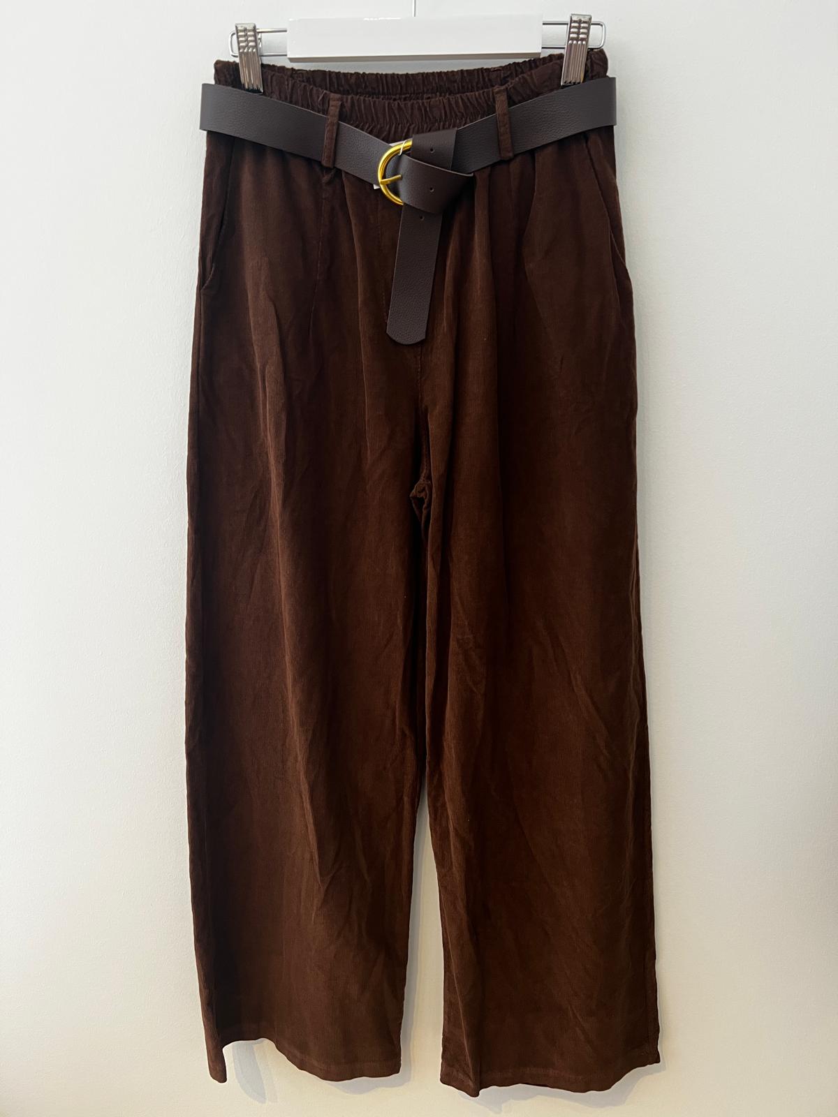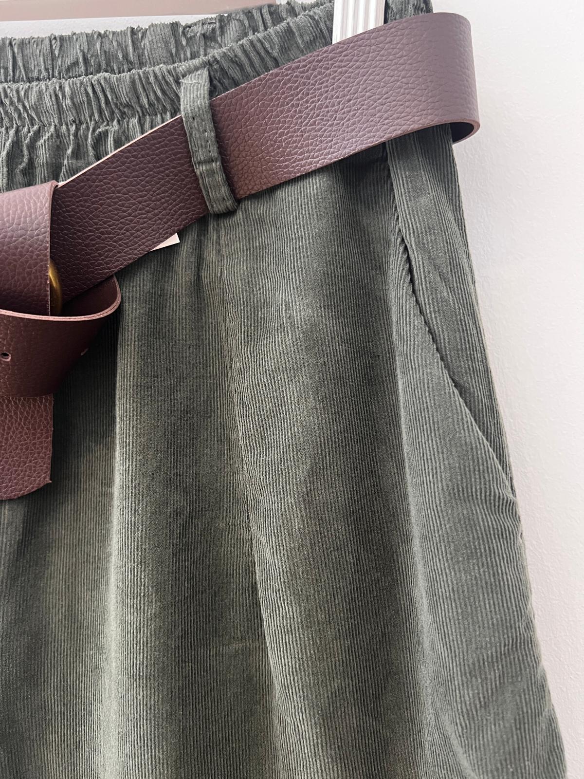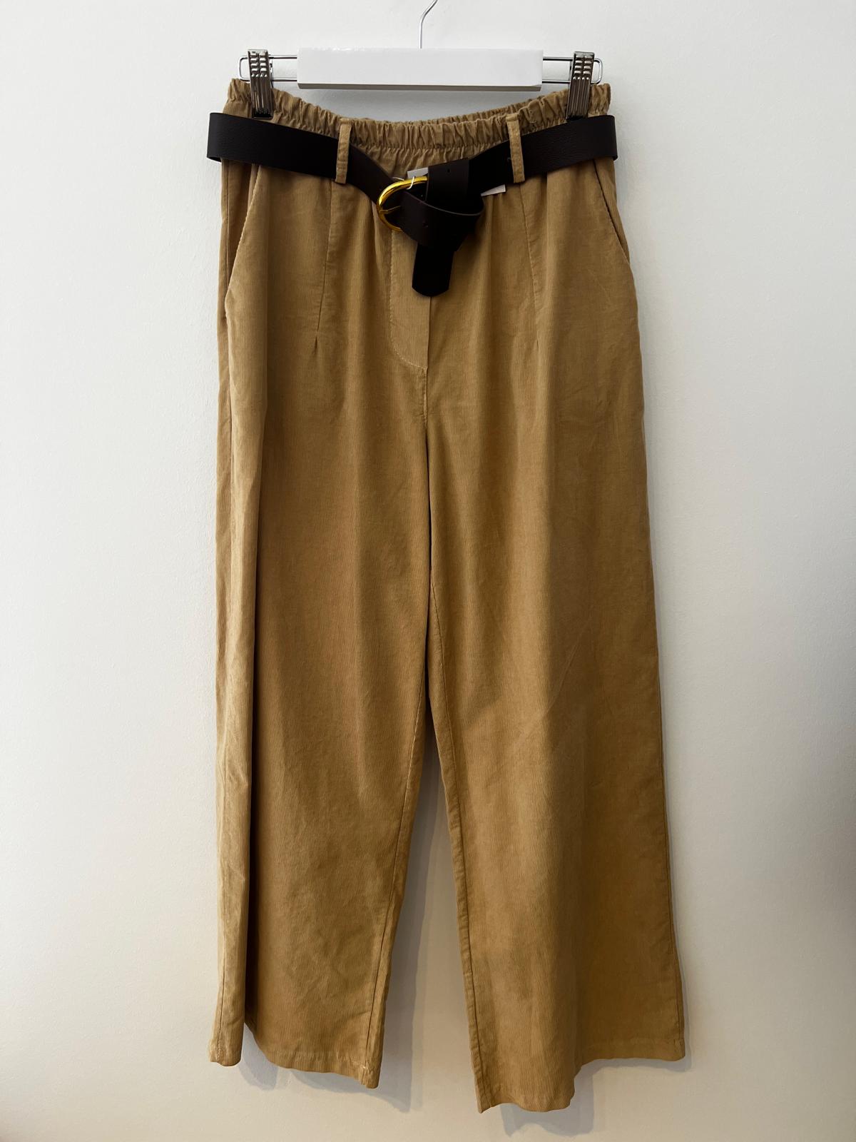 Calça tipo culote, em bombazina fina. Cintura subida com elástico, para melhor ajuste. Cinto castanho incluído.