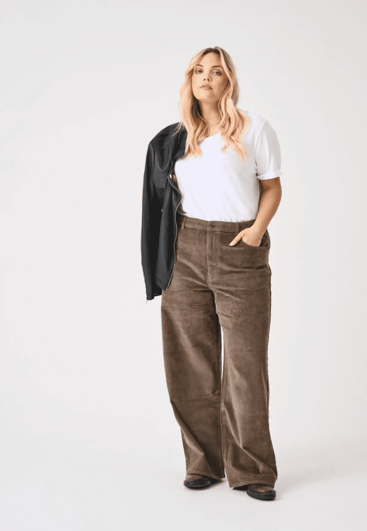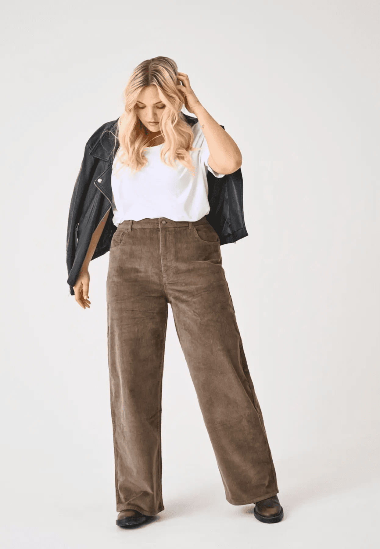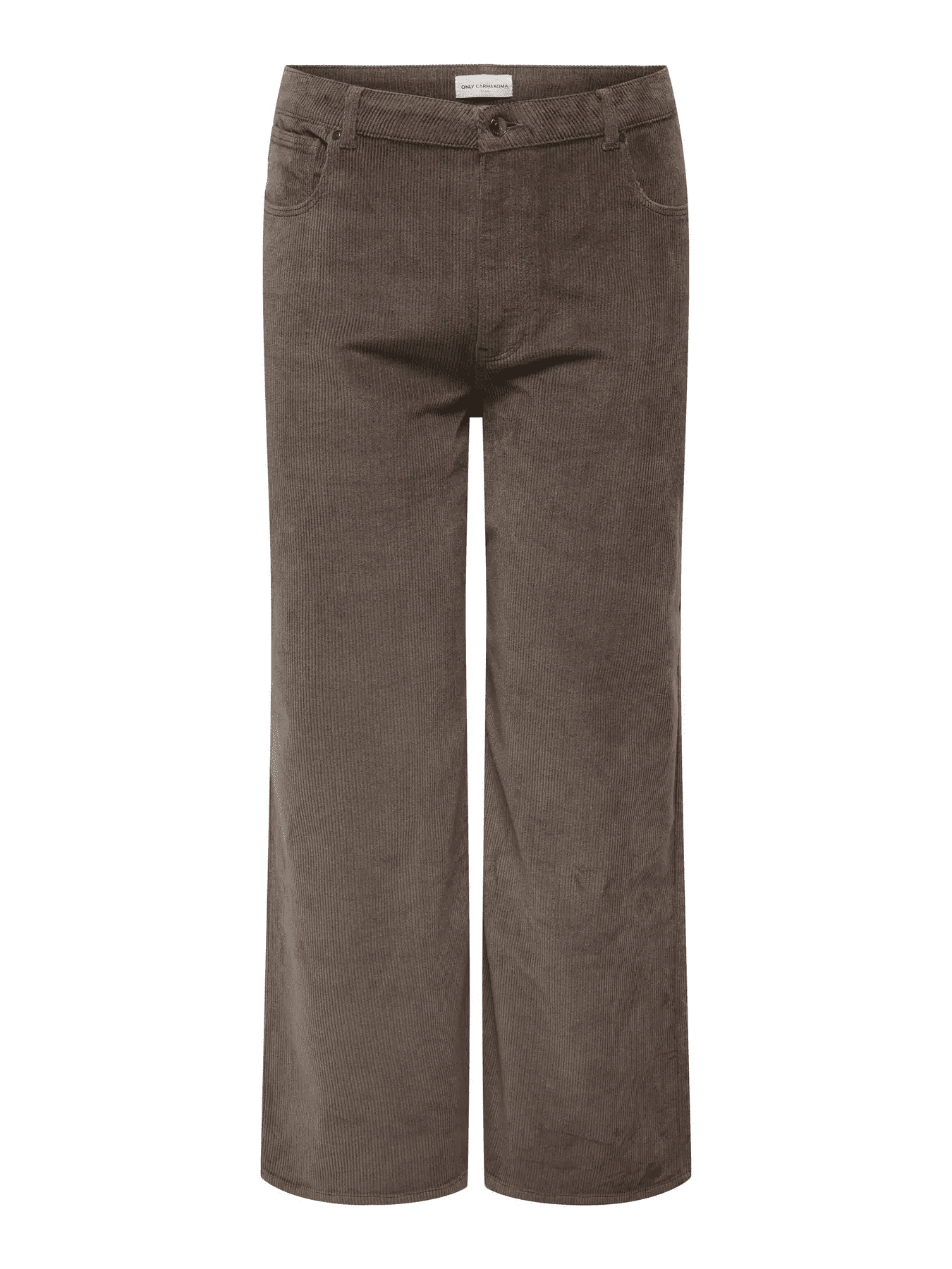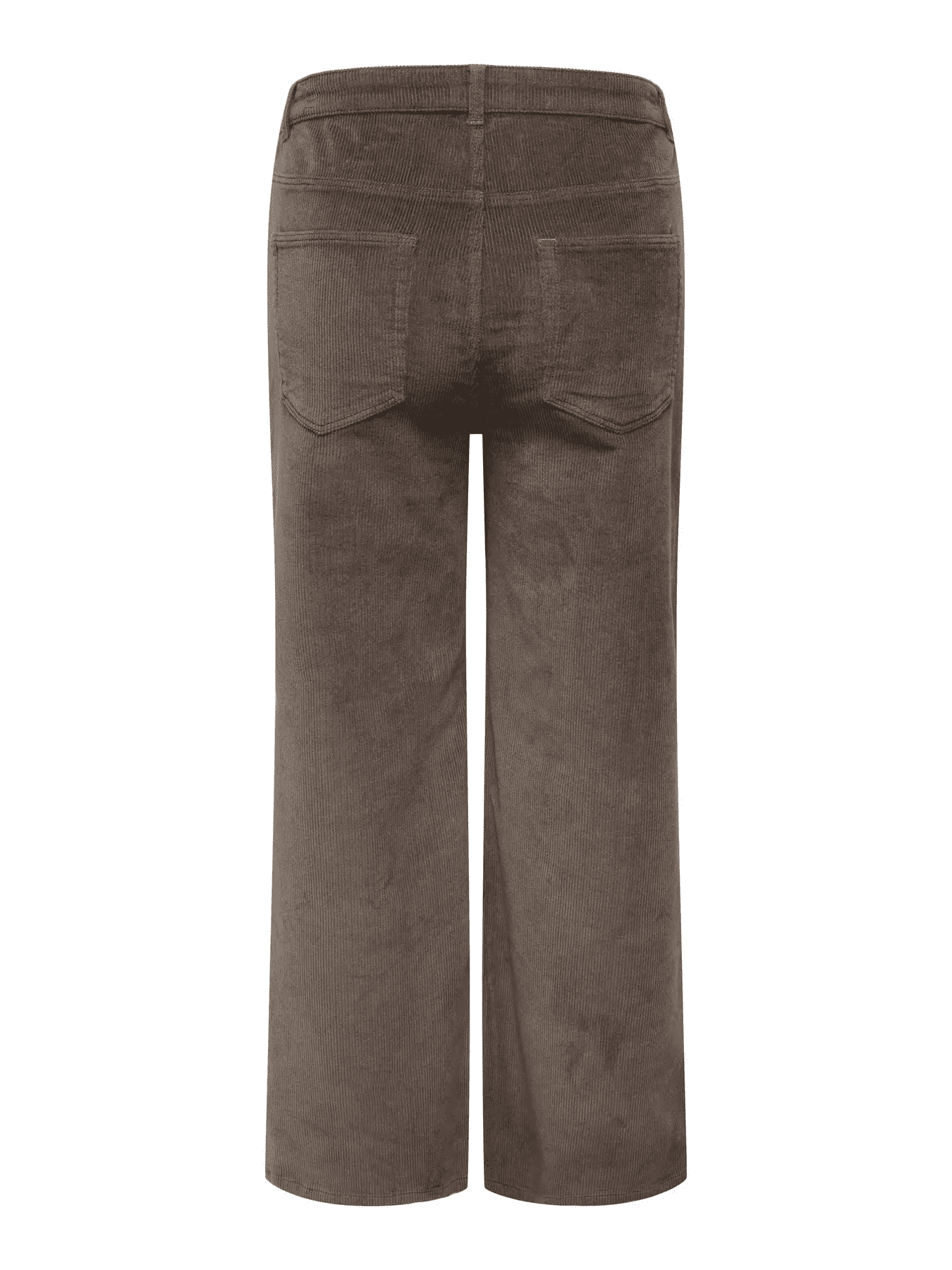 Calça de cintura subida, de corte direito em bombazina castanha.