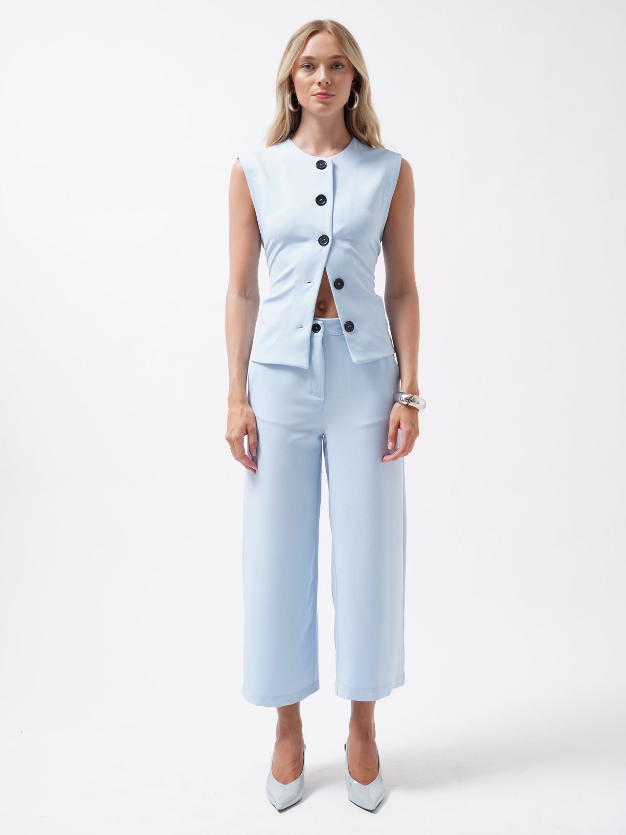 Calça de fato, estilo culote, corte direito largo, de cintura subida. Bolsos laterais.