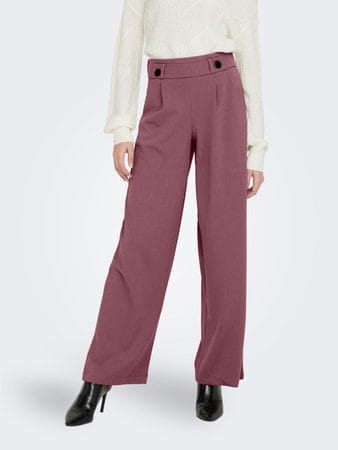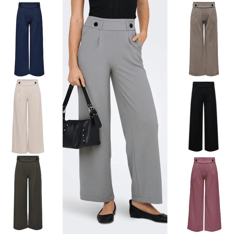 Calça tipo malha, com elástico na cintura. Detalhe de botões pretos na cintura em todas as cores de calça. Perna larga.