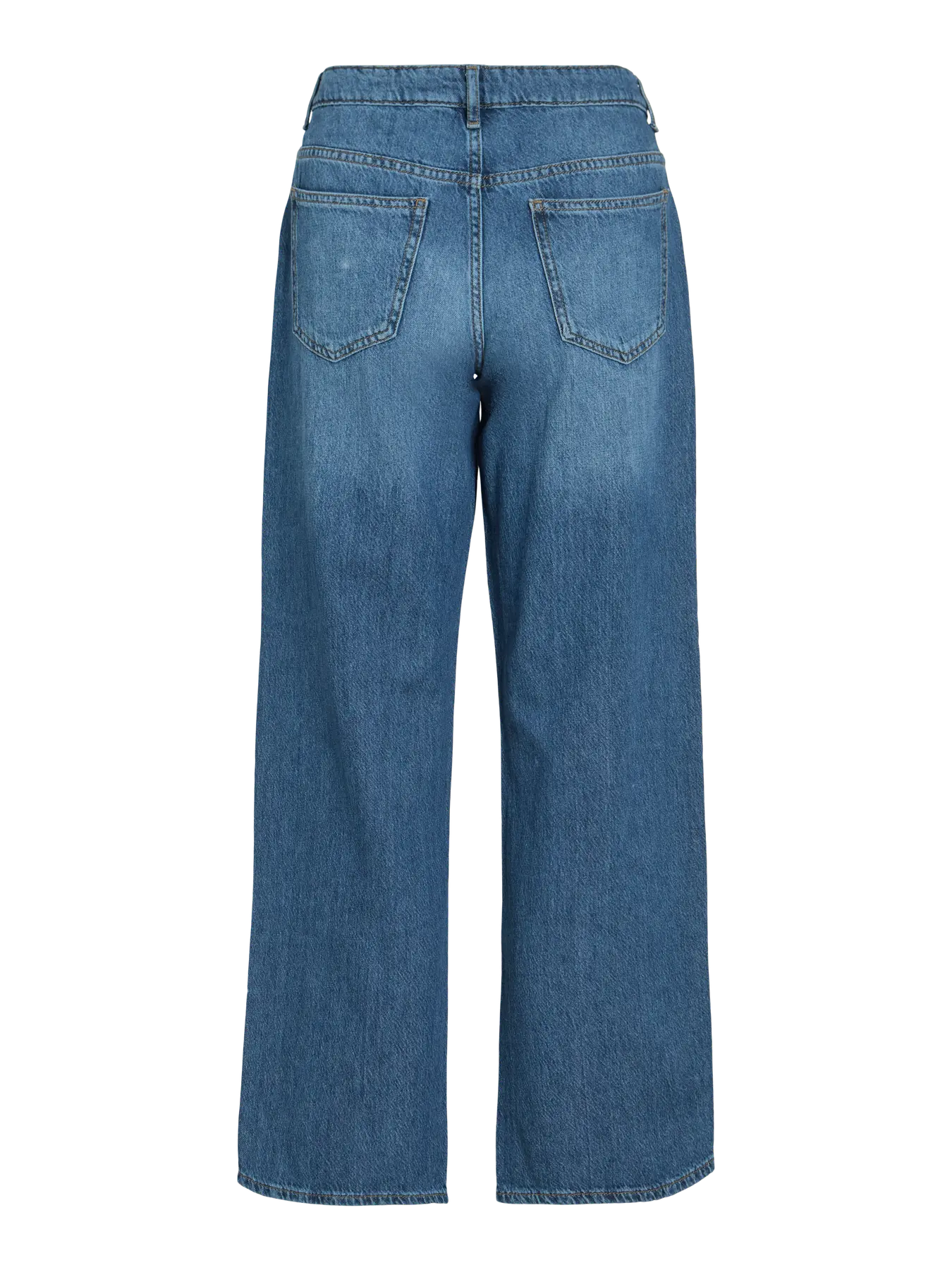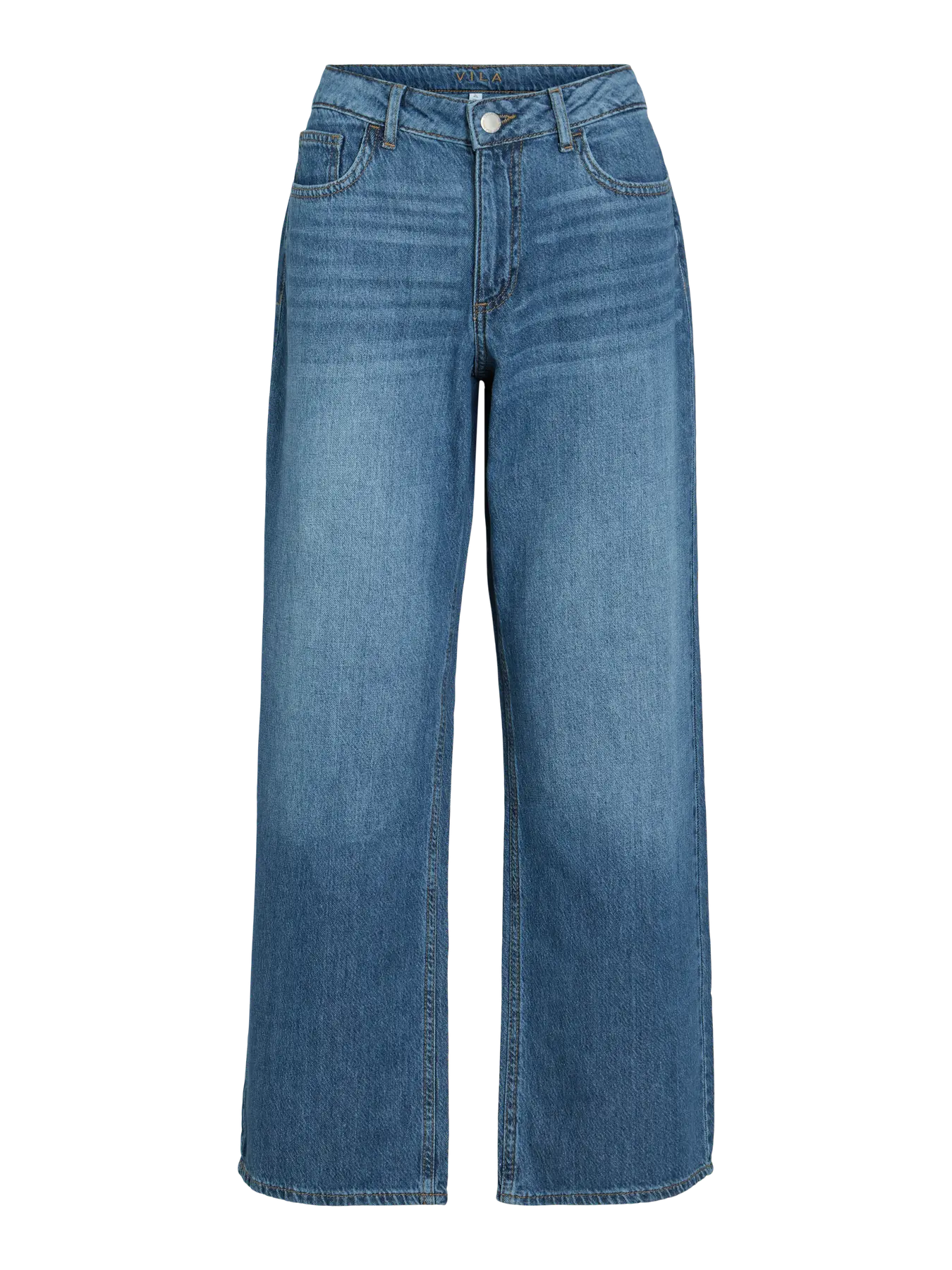Calça jeans, lavagem média, de cintura subida, wide leg.
