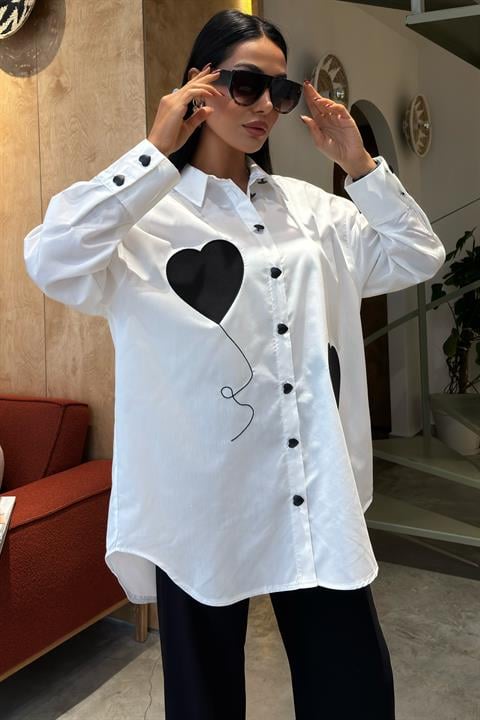 Camisa oversize branca, estilo túnica, assimétrica, com corações pretos na frente. Os botões frontais e dos punhos, são em forma de coração, pretos.
