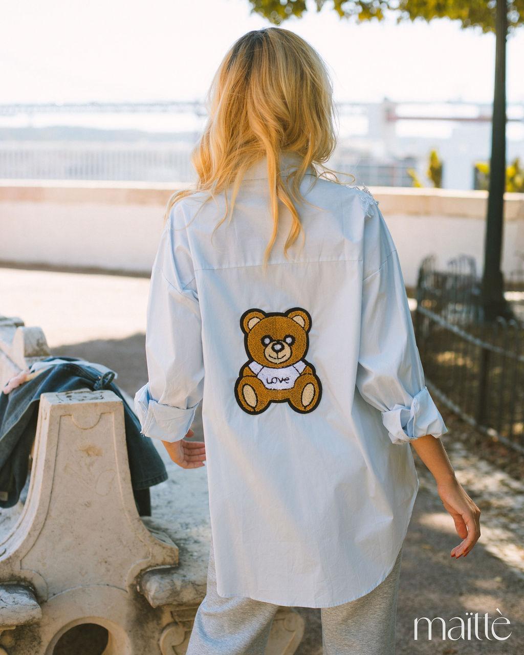Camisa oversize azul bebé, cheia de detalhes frontais (flores, botões beges, etc), sendo o maior detalhe atrás : um urso em tom caramelo.