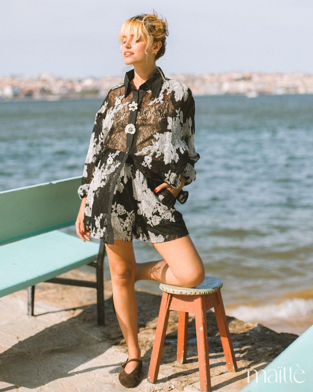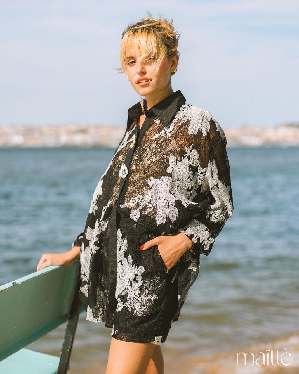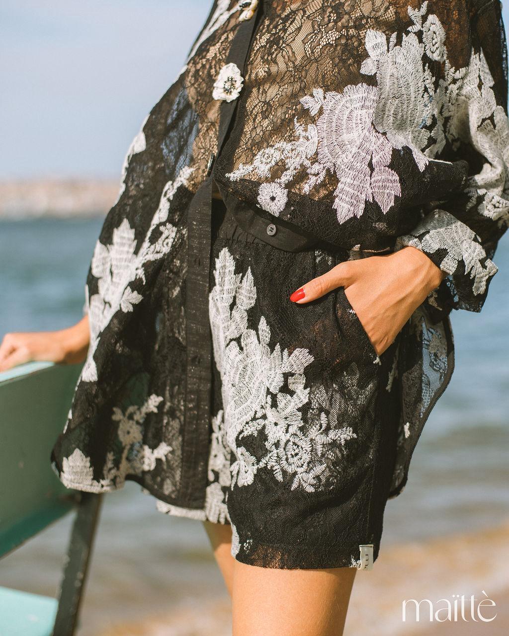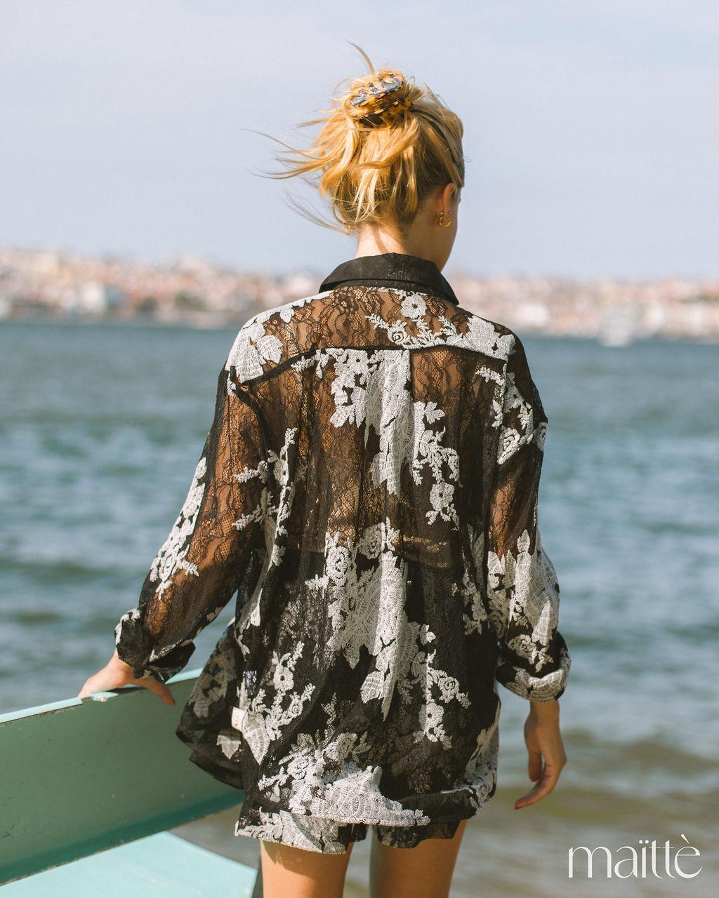 Camisa oversize preta, toda em transparência, cheia de detalhes rendados. Botões maxi trabalhados.