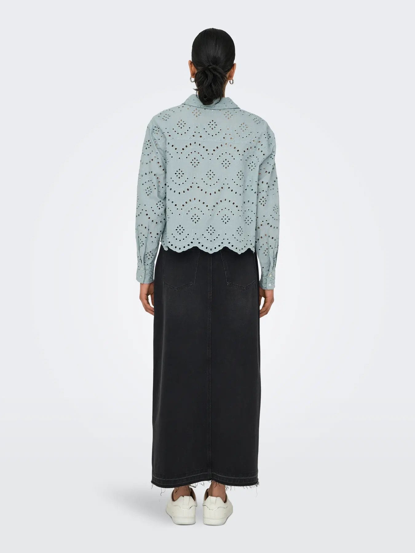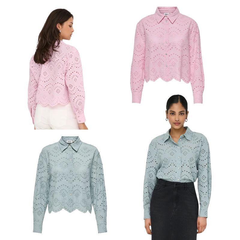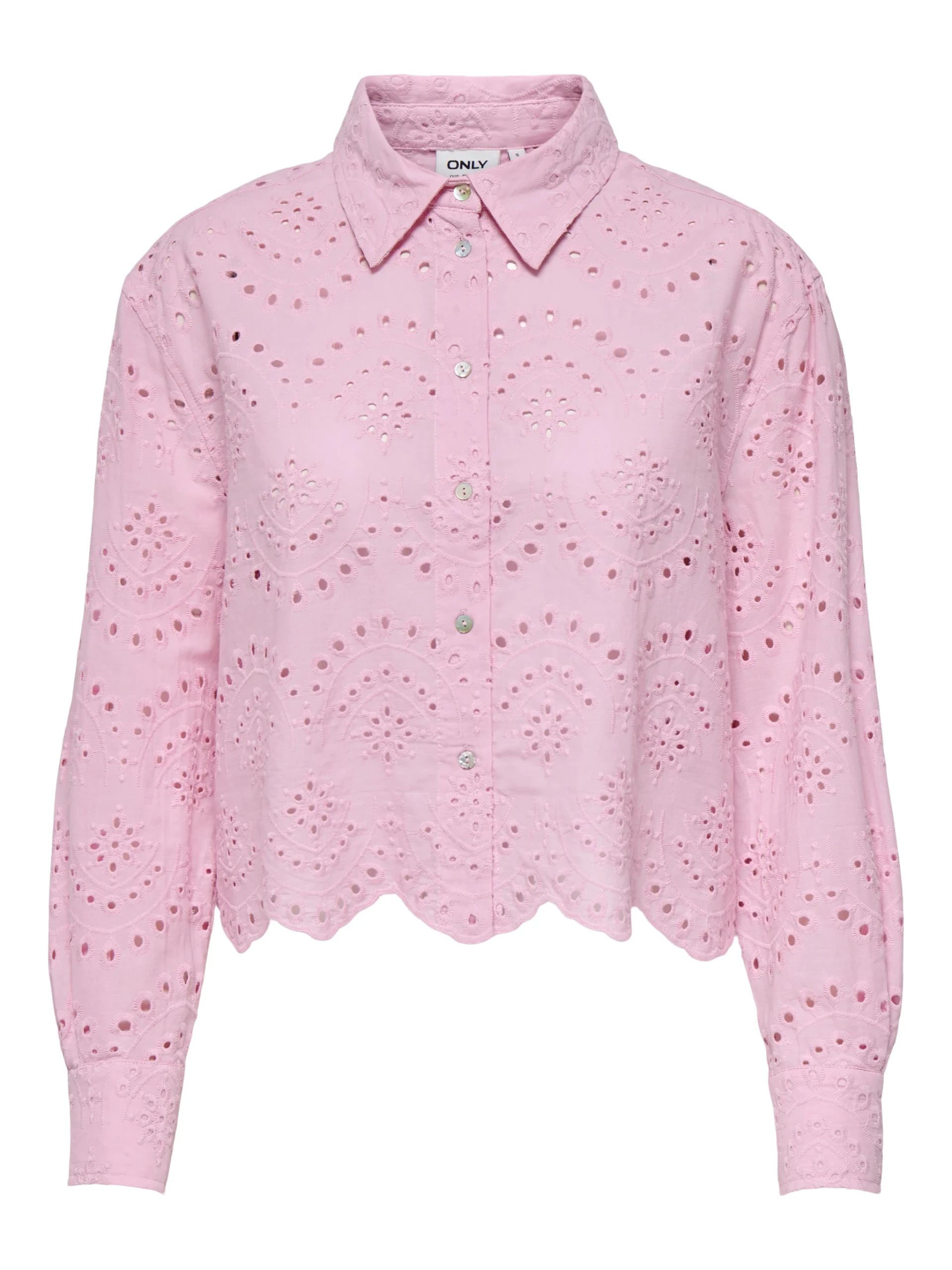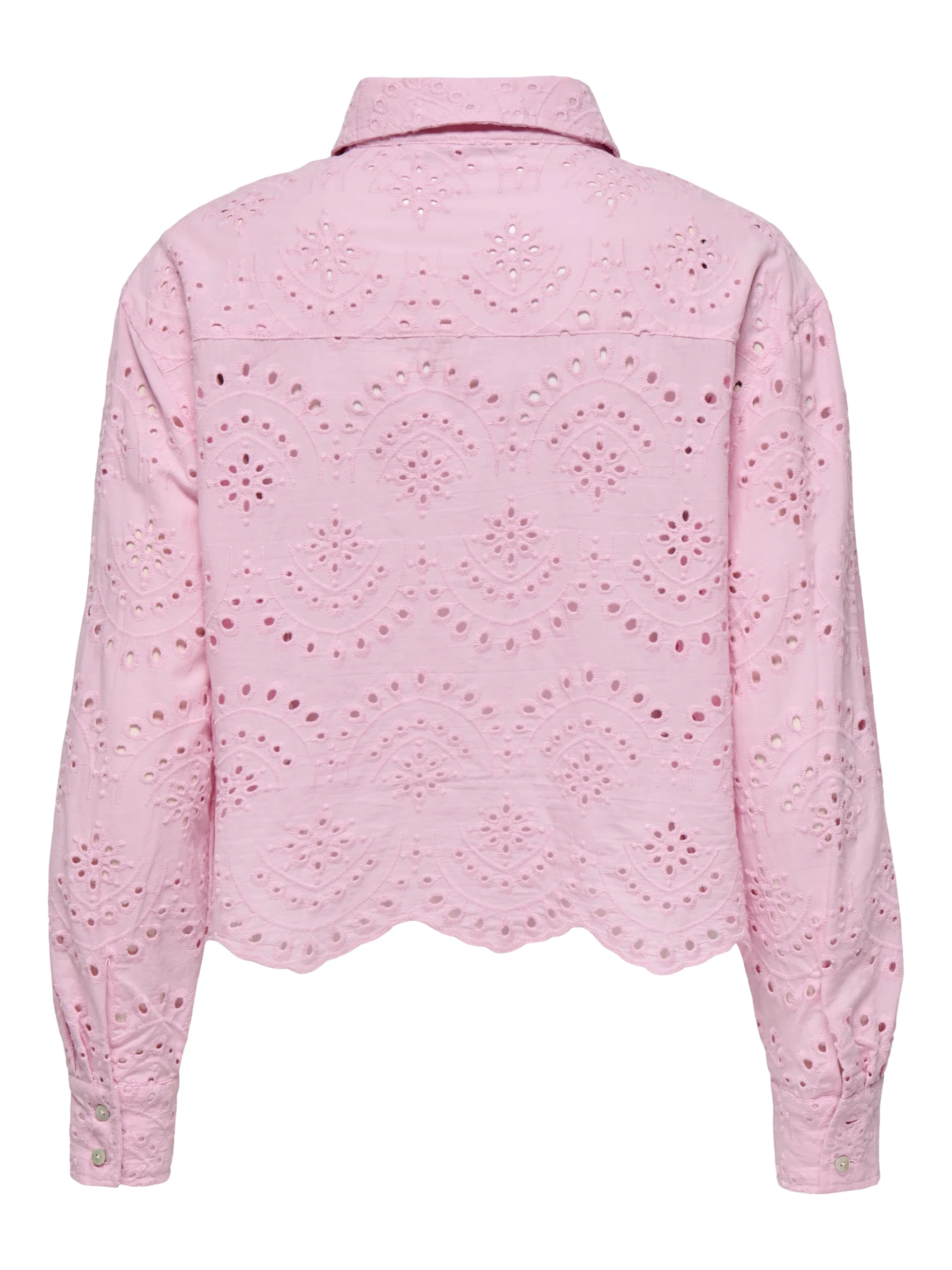 Camisa em bordado inglês, manga comprida com punho. Detalhe de recorte na base.