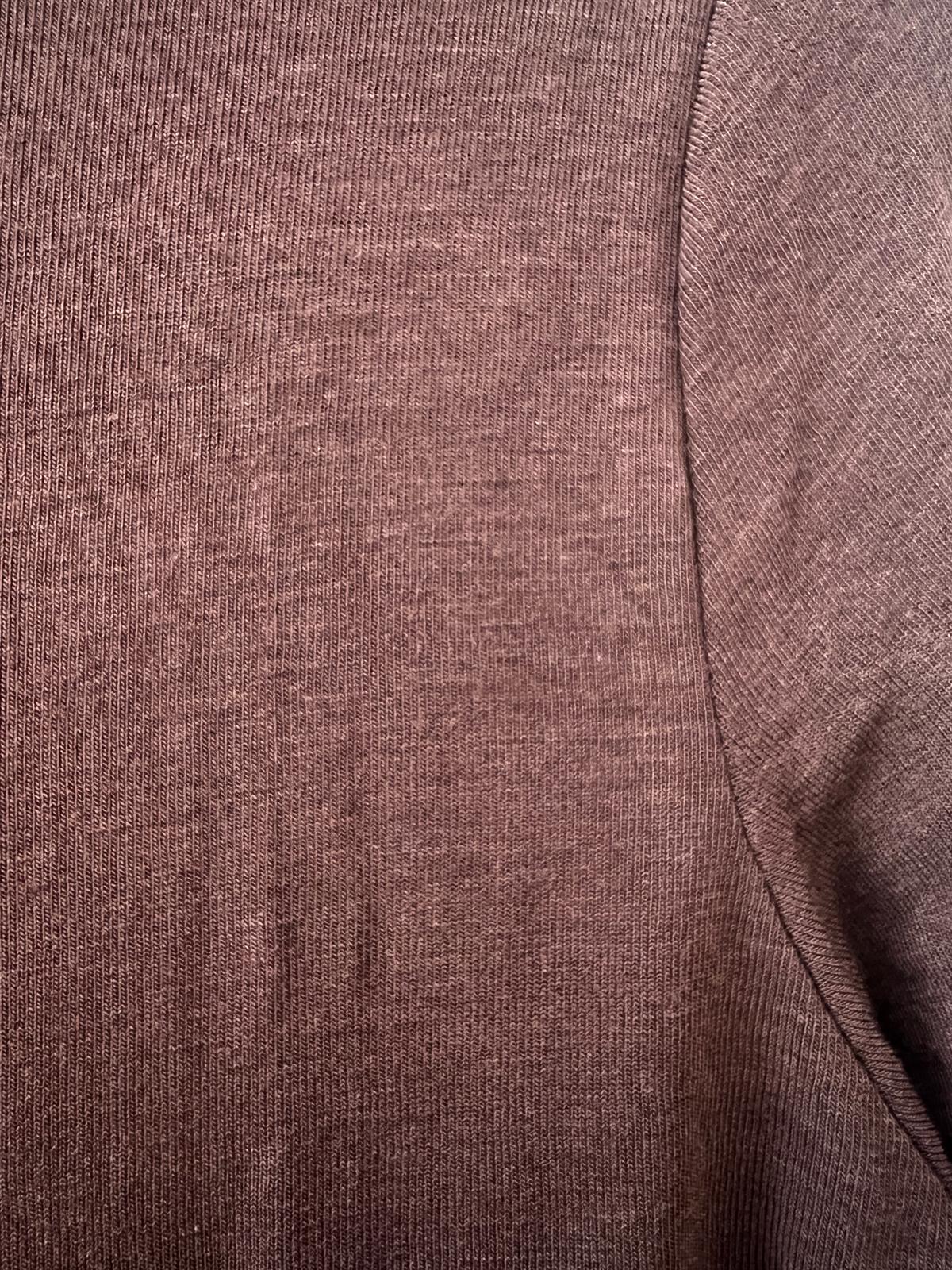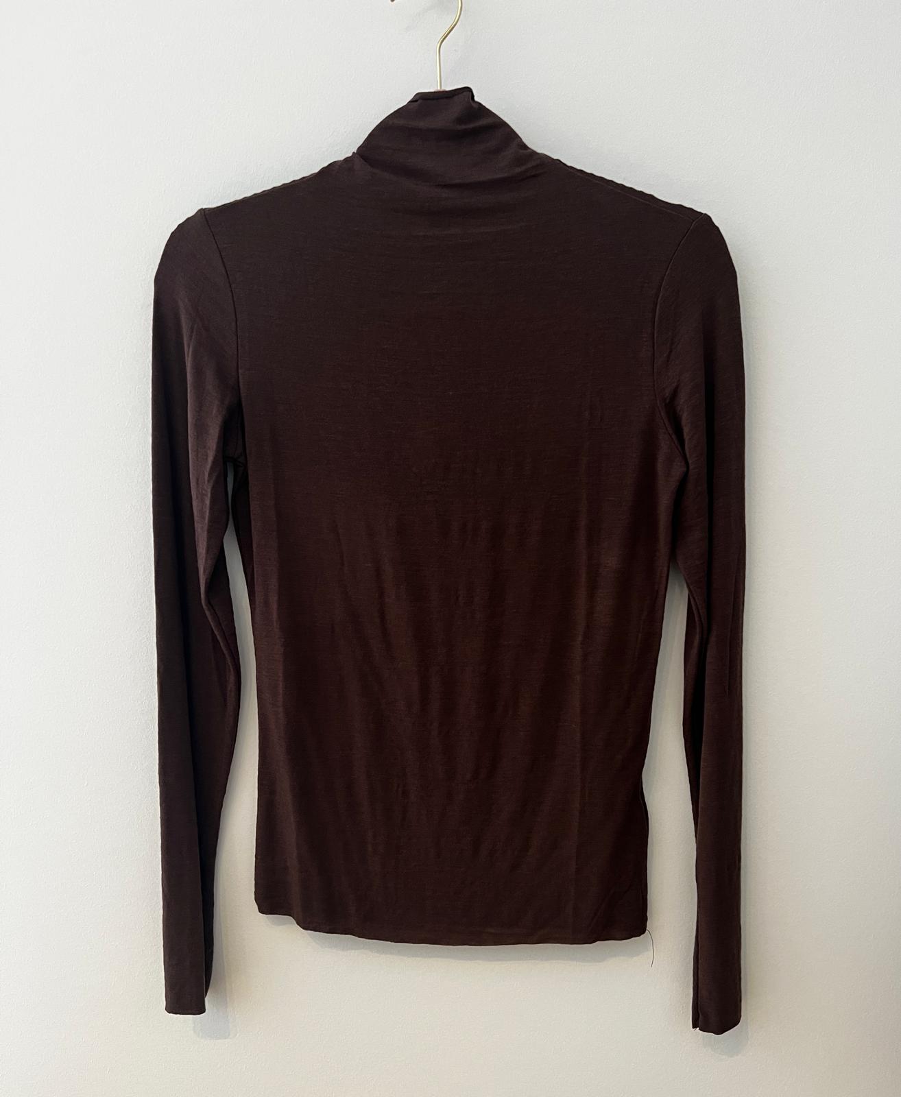 Camisola básica em microfibra suave, num tom castanho muito na moda. Apresenta uma meia gola e tem manga comprida.