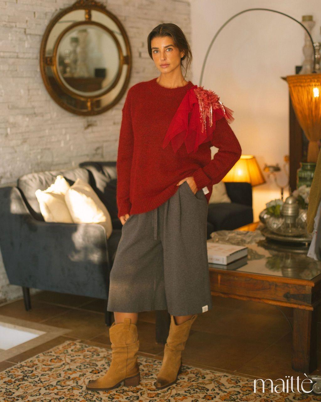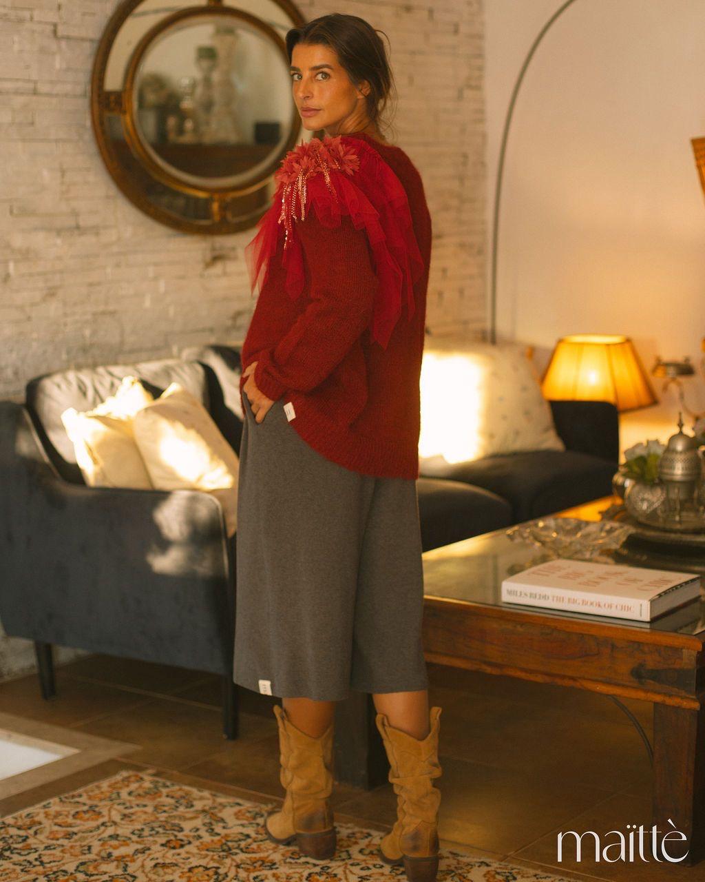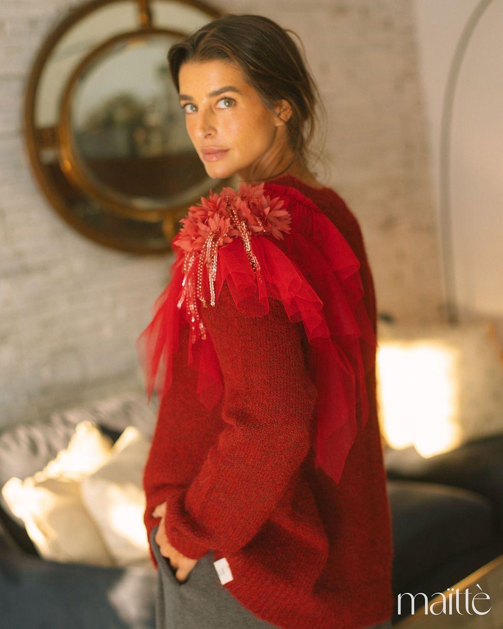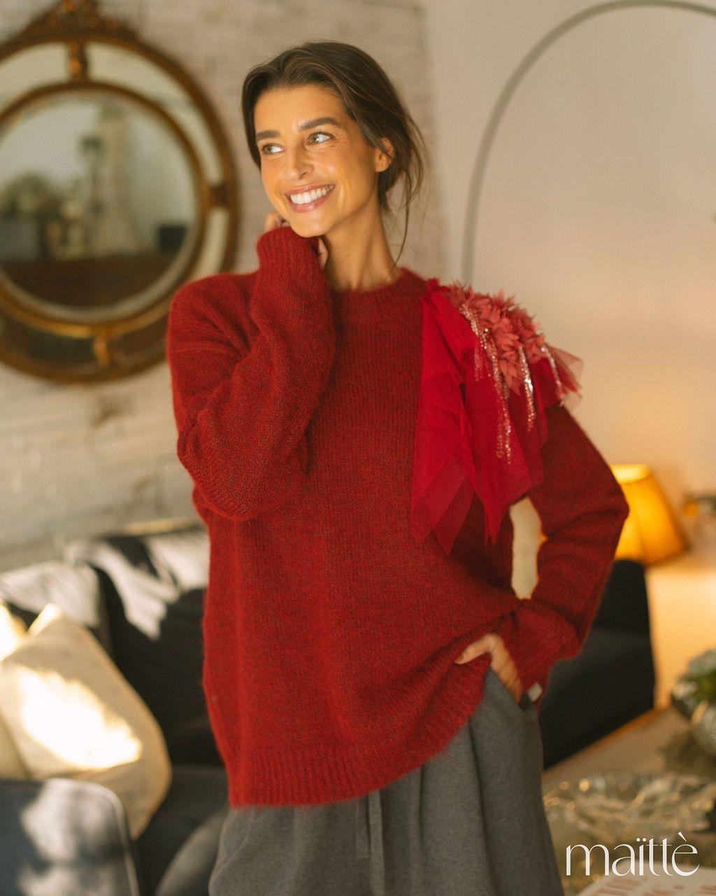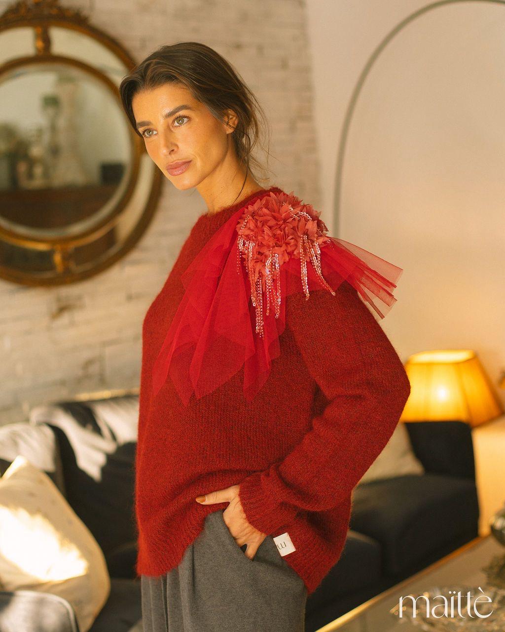 Camisola de lã, em tom vermelho profundo, de decote redondo subido, com detalhe em tule com flores sobre um dos ombros.