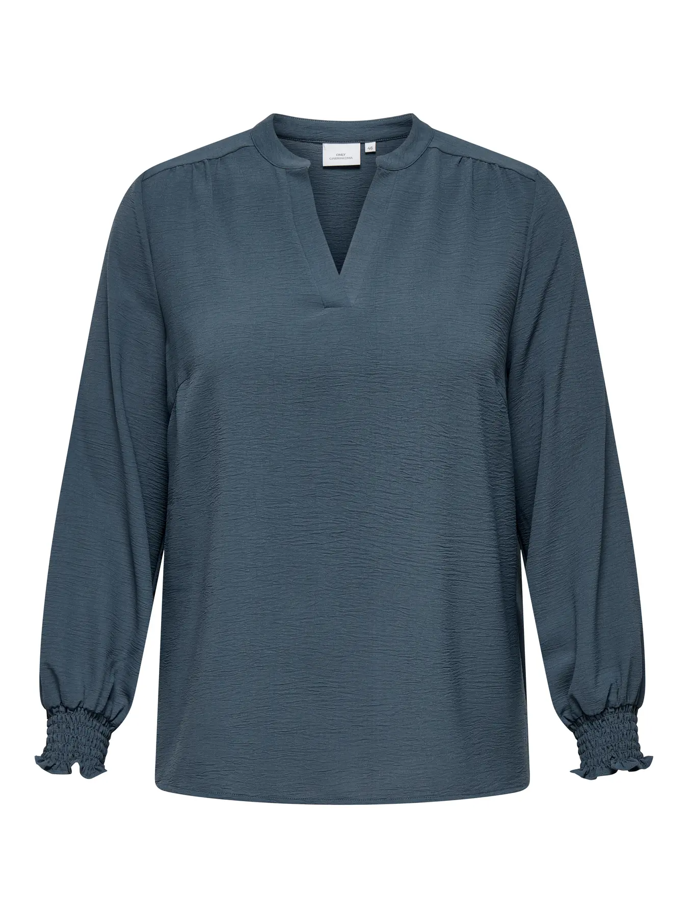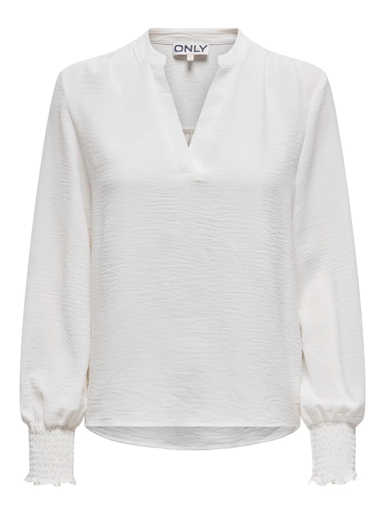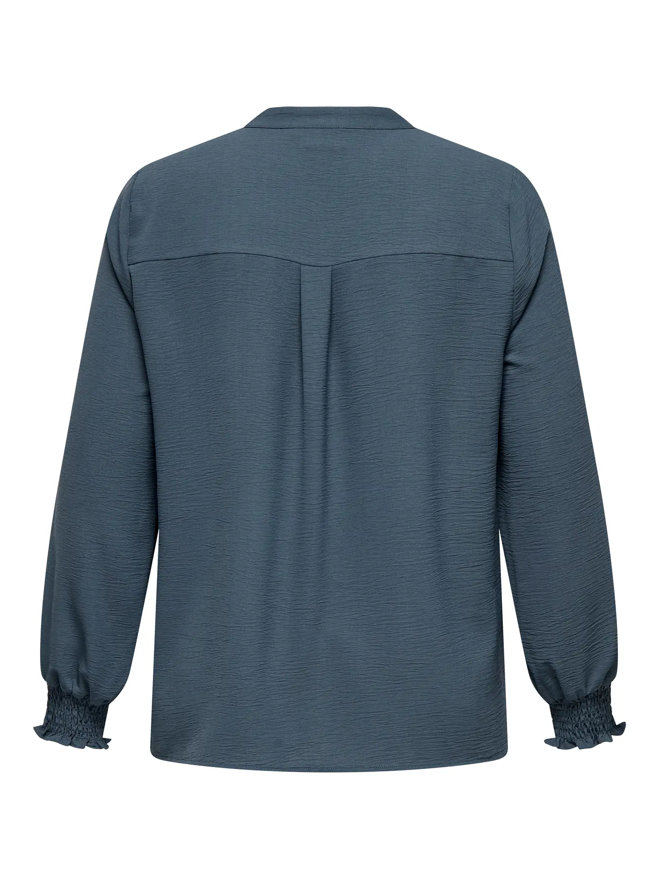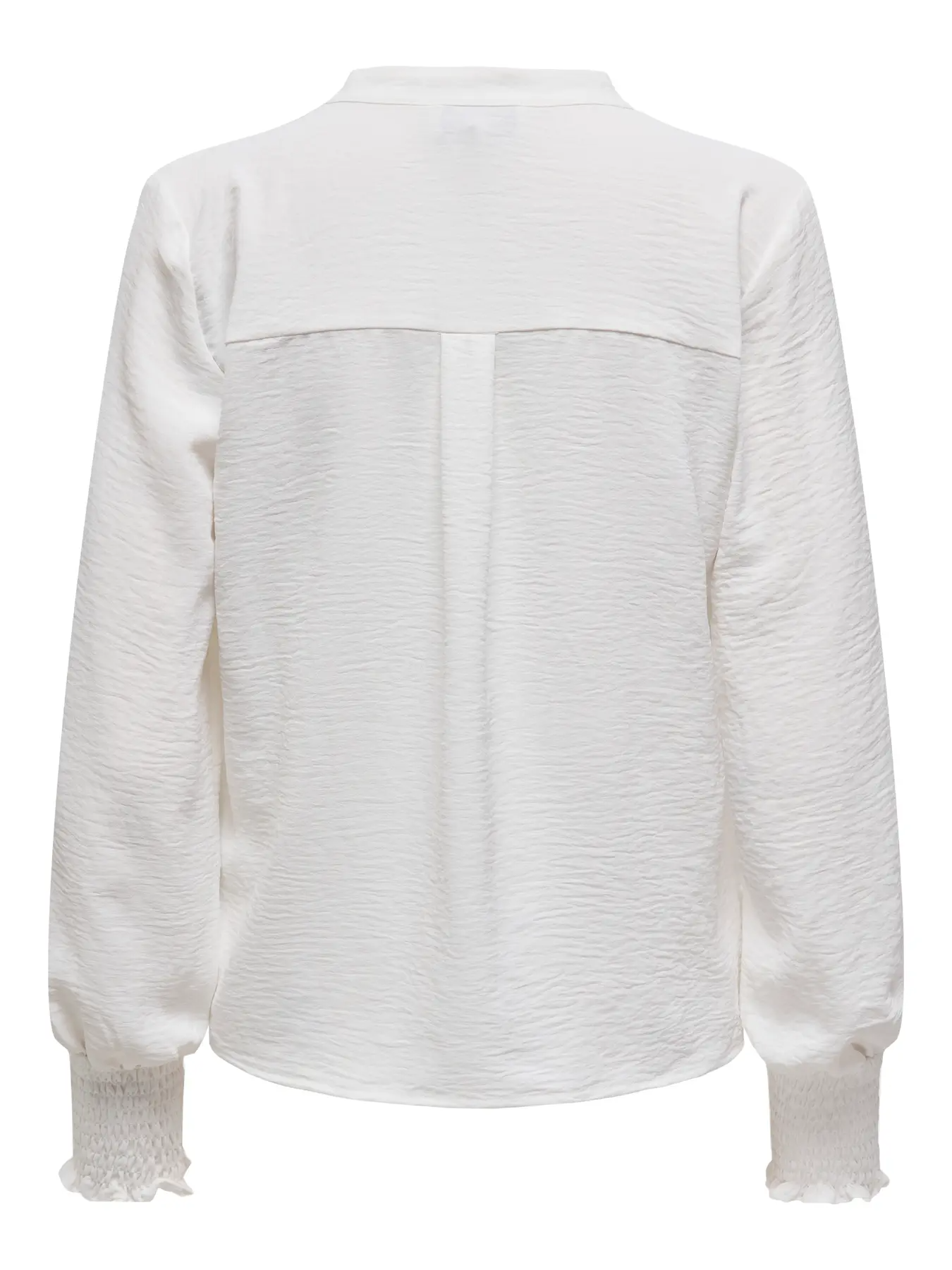 Blusa de manga comprida com punho elástico, em tecido fluído, com gola “de padre” e decote em V.