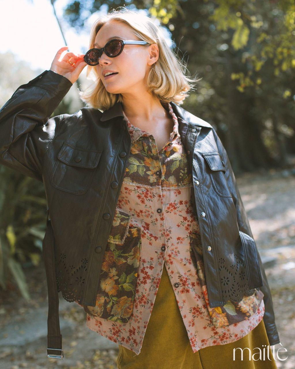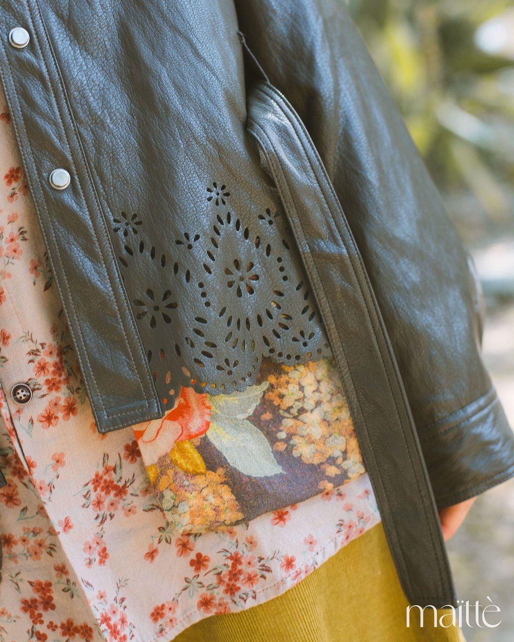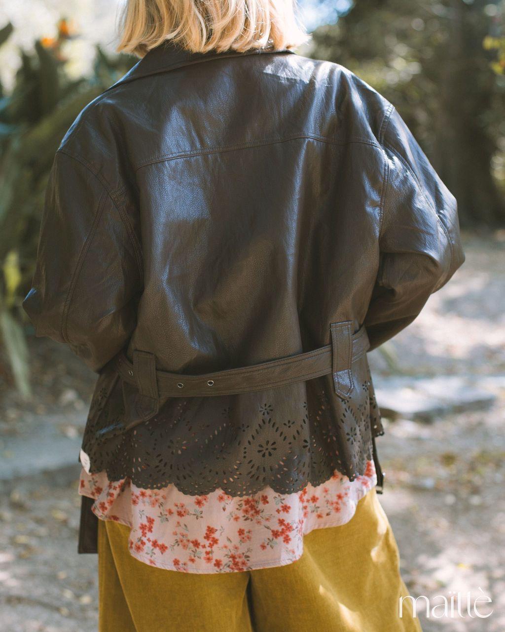 Casaco em ecopele castanha escura, mole, estilo enrugado. É recortado na base, com cinto incluído. Fecha com botões tipo mola de pressão, forrados com o mesmo tecido.