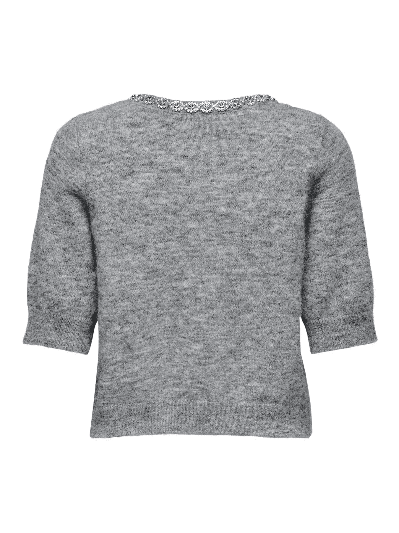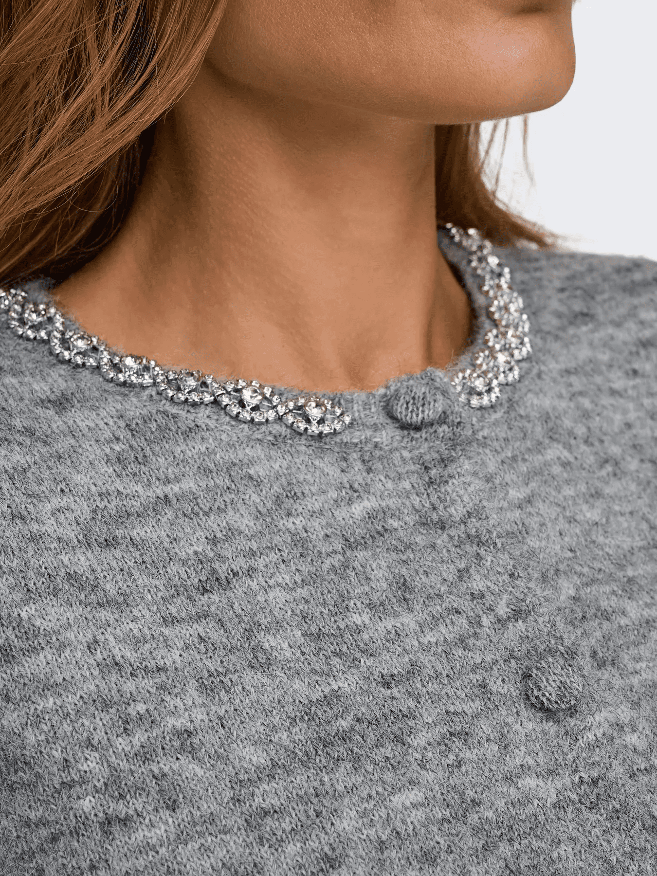Casaco de malha, com lã, em tom cinza, com manga pelo cotovelo.  Decote redondo com aplicações prateadas. Botões frontais forrados no mesmo tom.