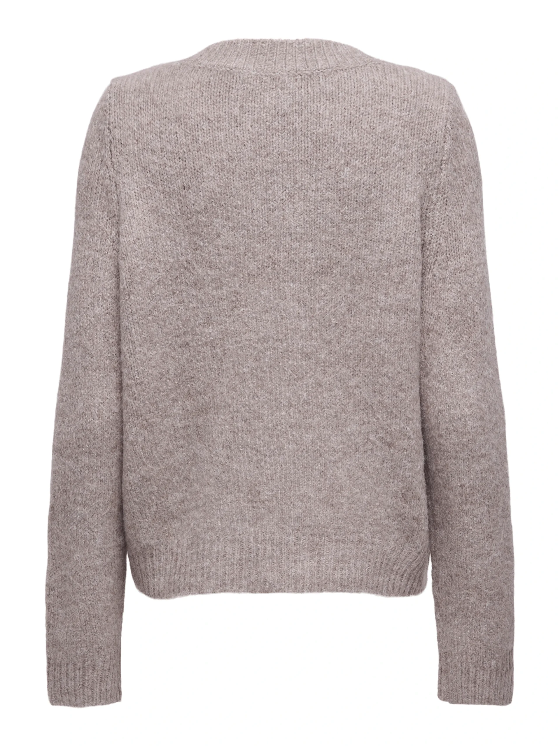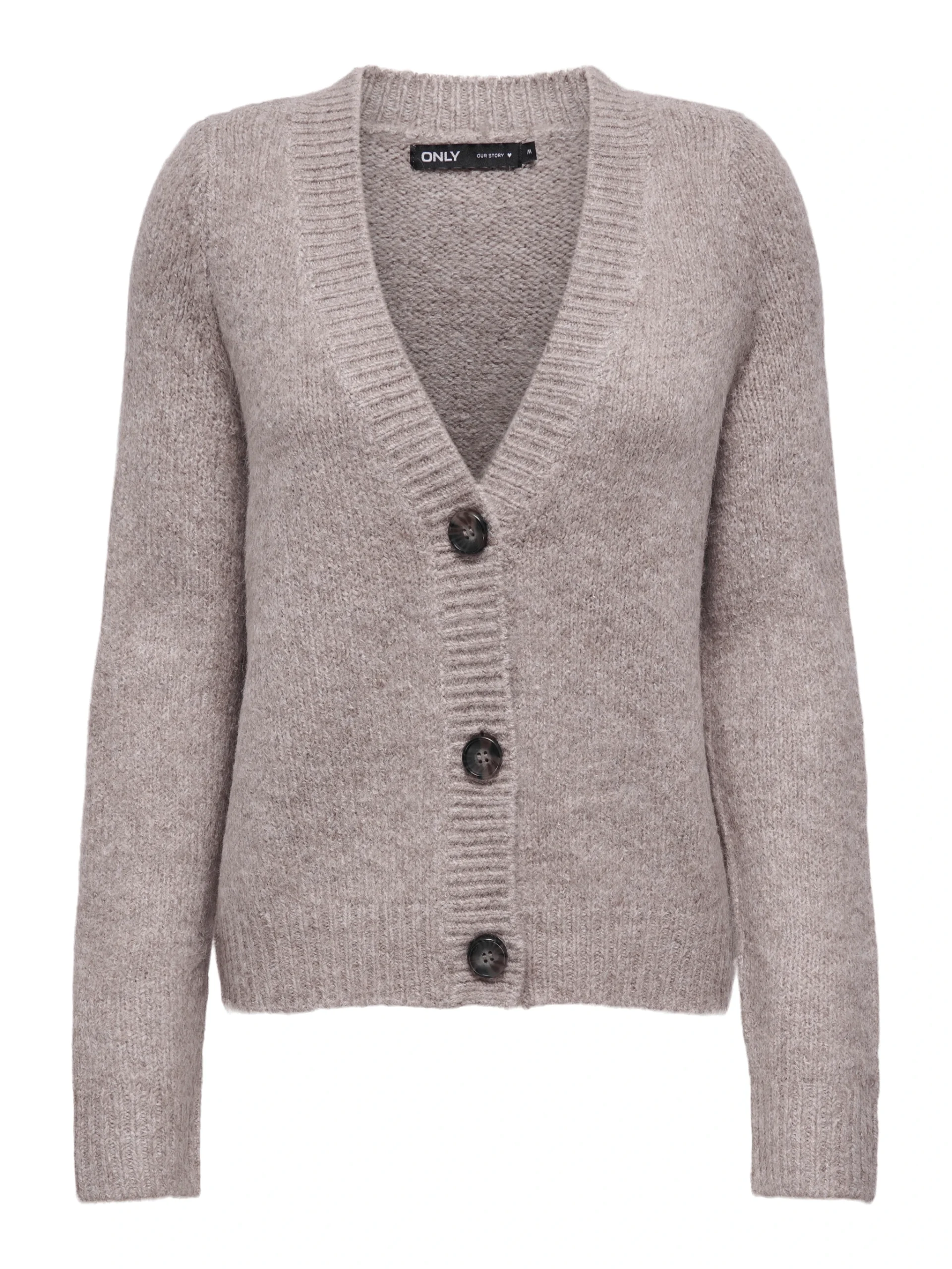 Casaco de malha, cor areia. Abotoa à frente com três botões castanhos.