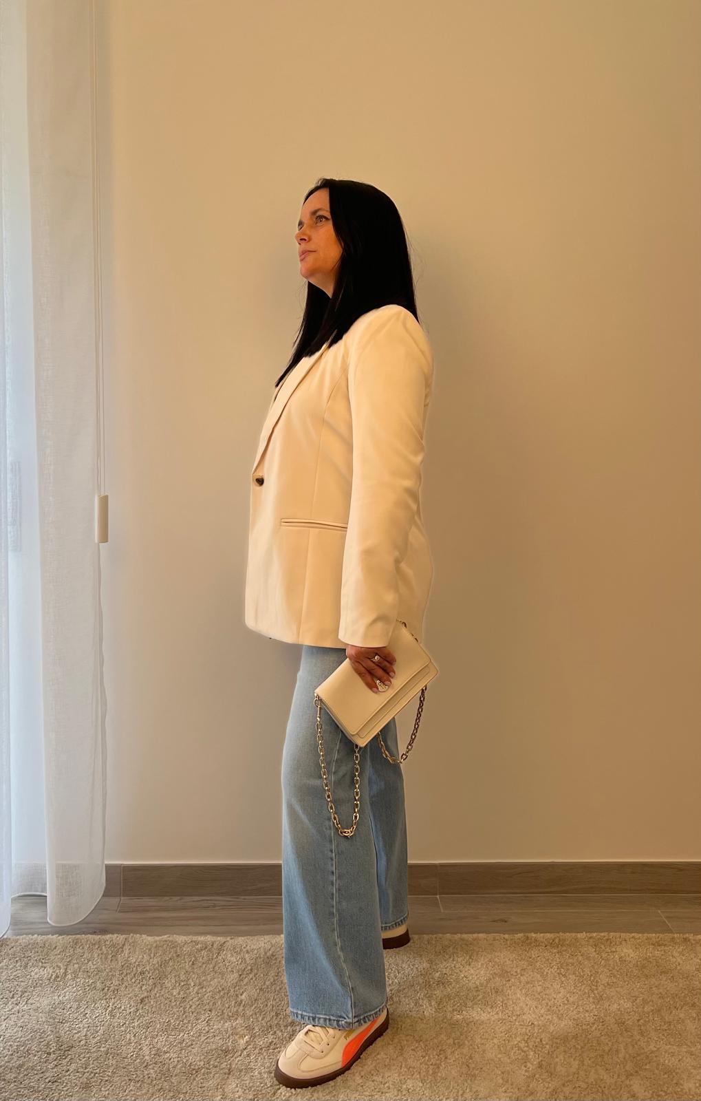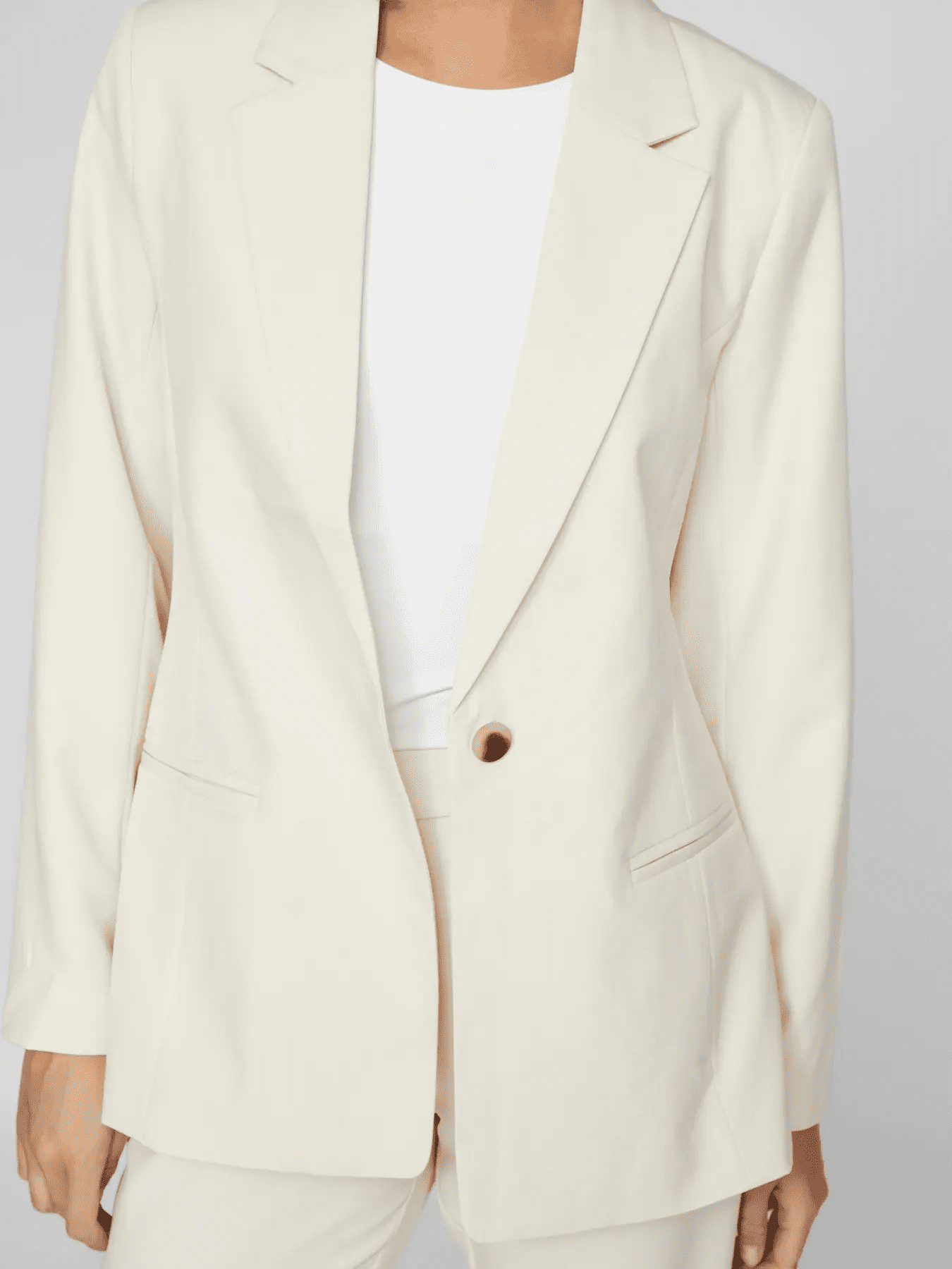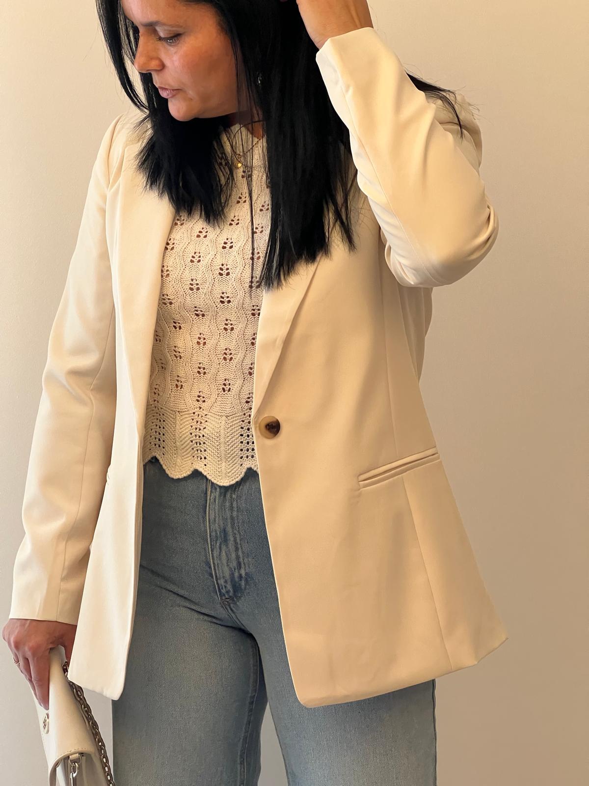 Blazer bege claro, estruturado, ligeiramente cintado. Comprimento pela anca. Aperta um um botão frontal. Caimento perfeito.
