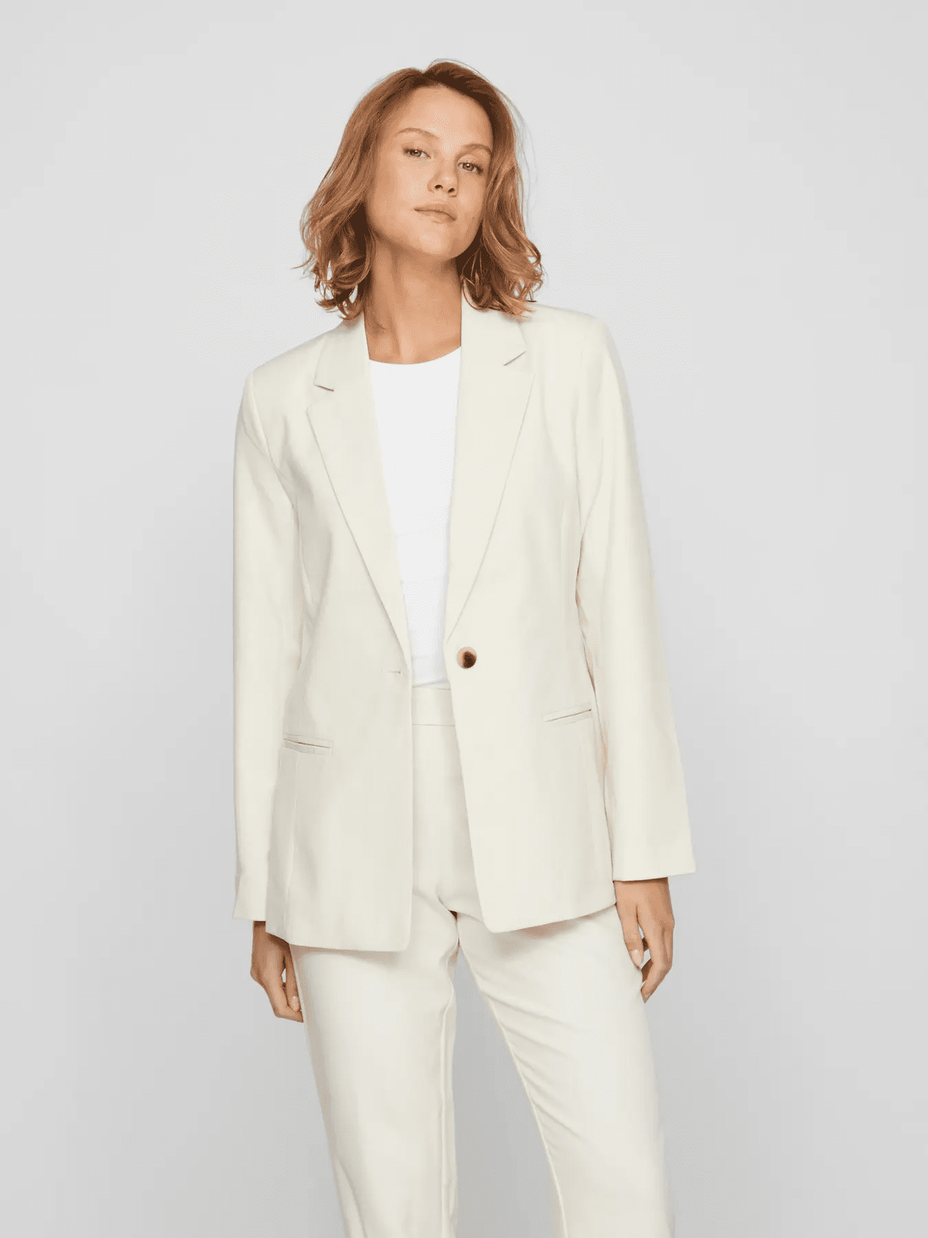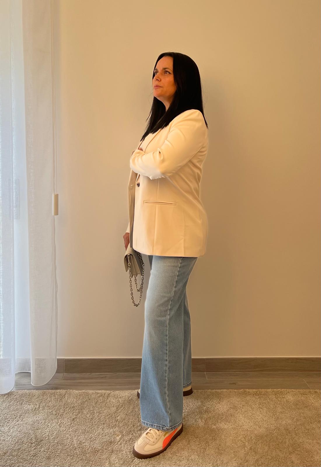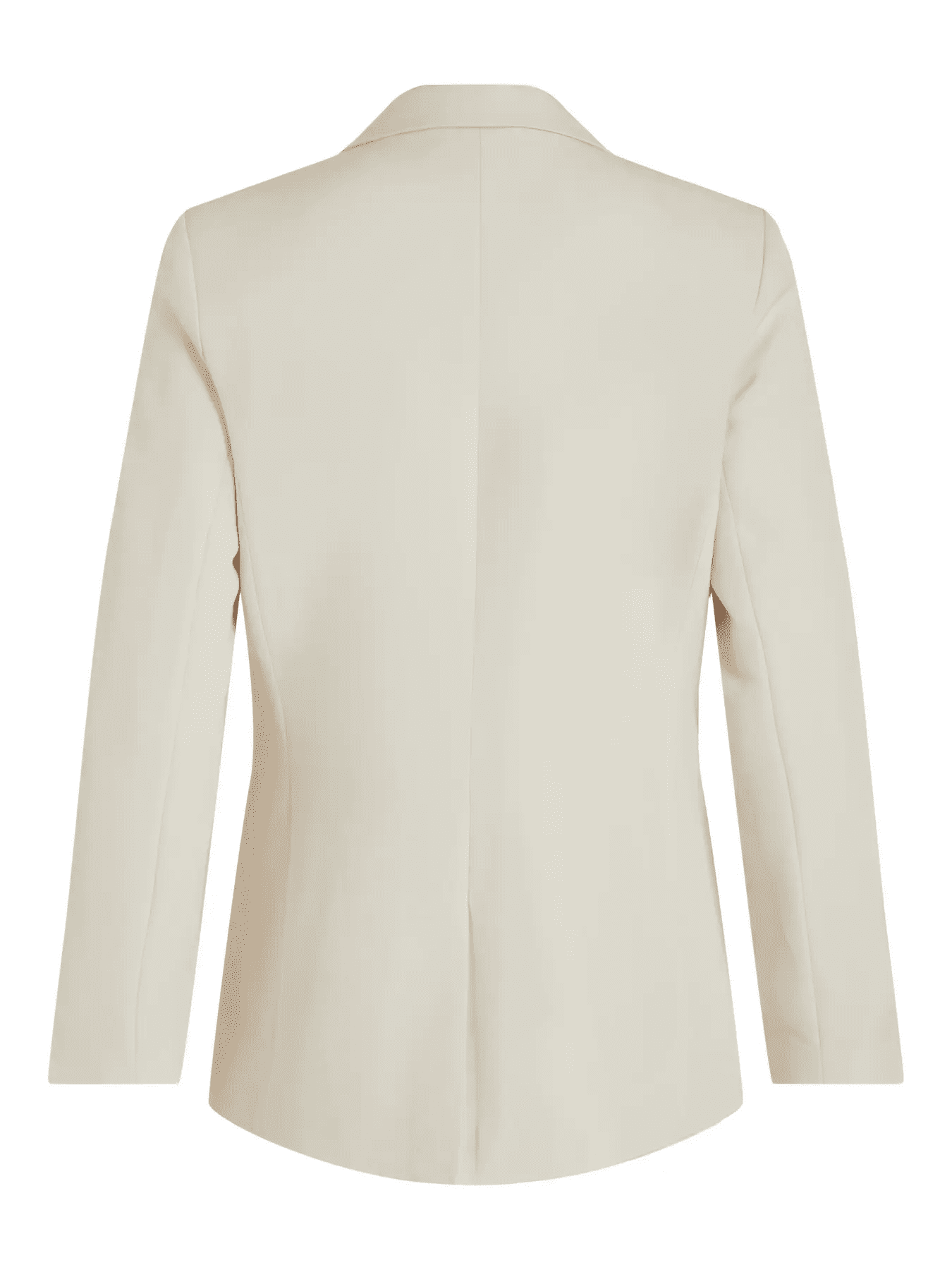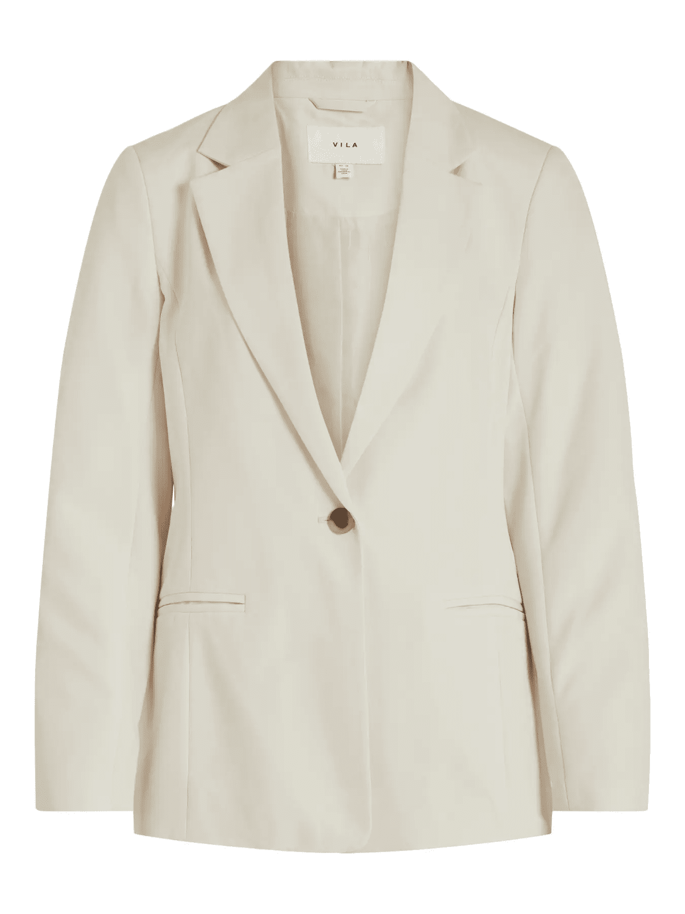 Blazer bege claro, estruturado, ligeiramente cintado. Comprimento pela anca. Aperta um um botão frontal. Caimento perfeito.