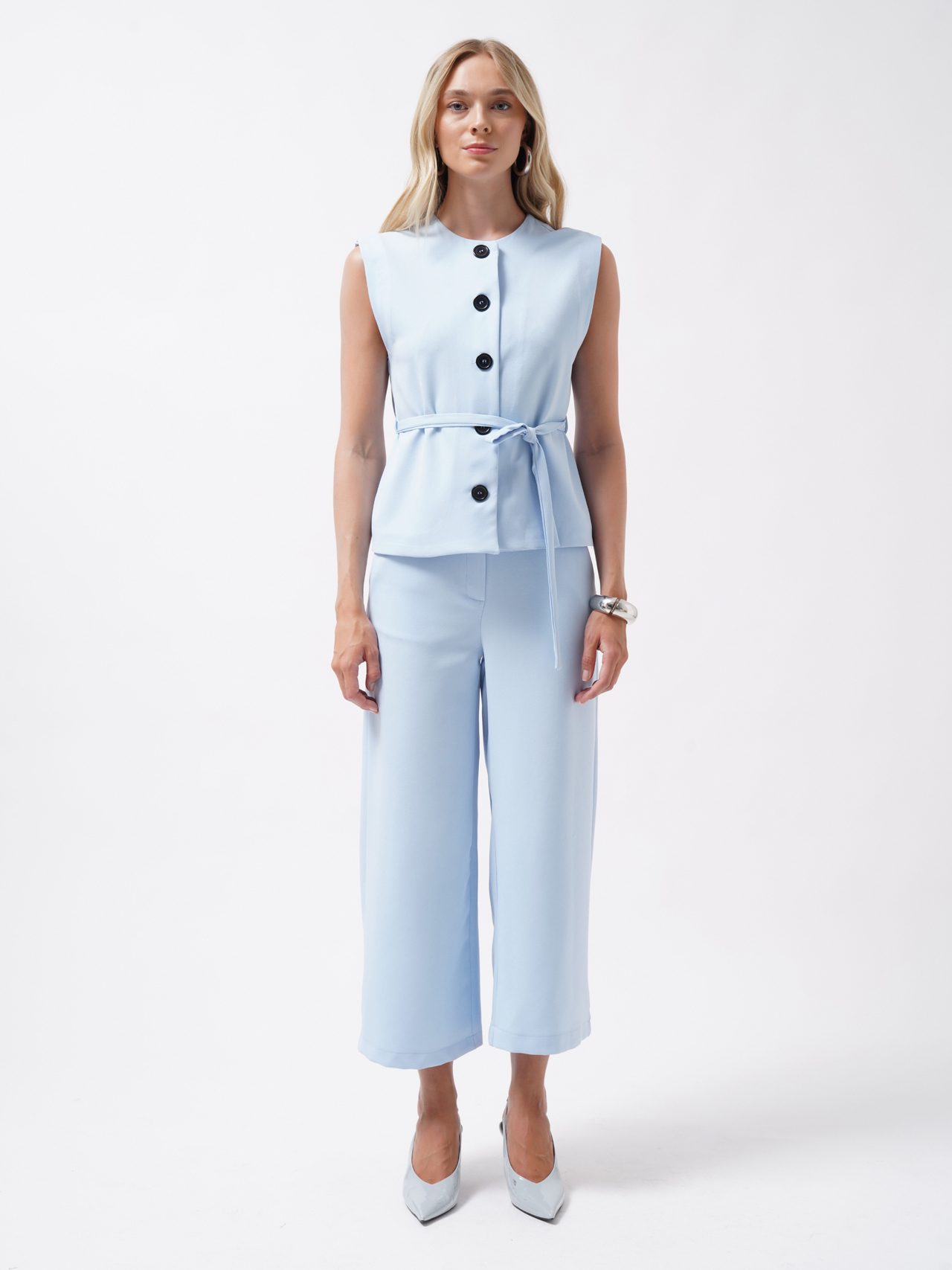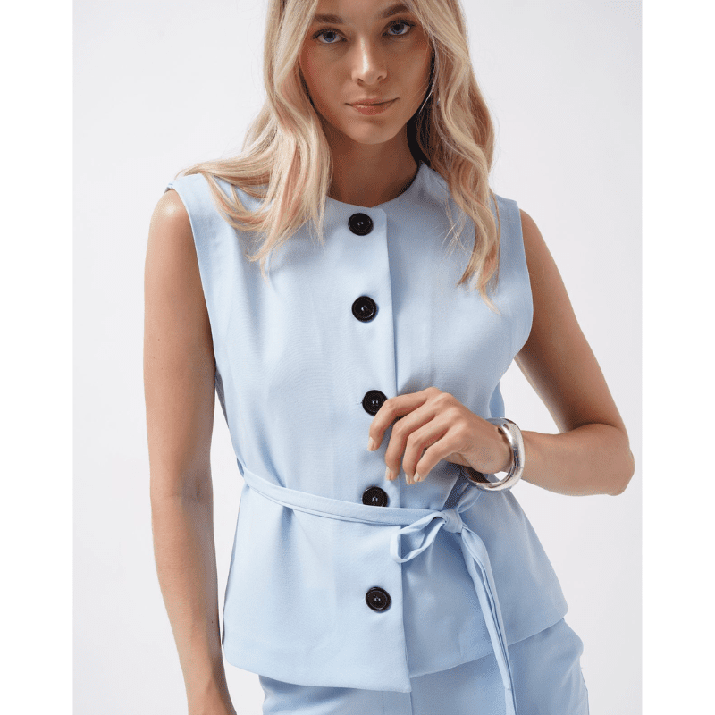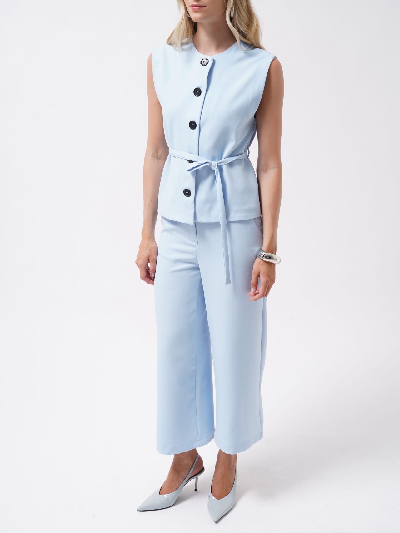Colete de fato, decote subido, redondo, corte direito pela altura da anca. Cinto incluído no mesmo tecido. A combinar com a calça igual.