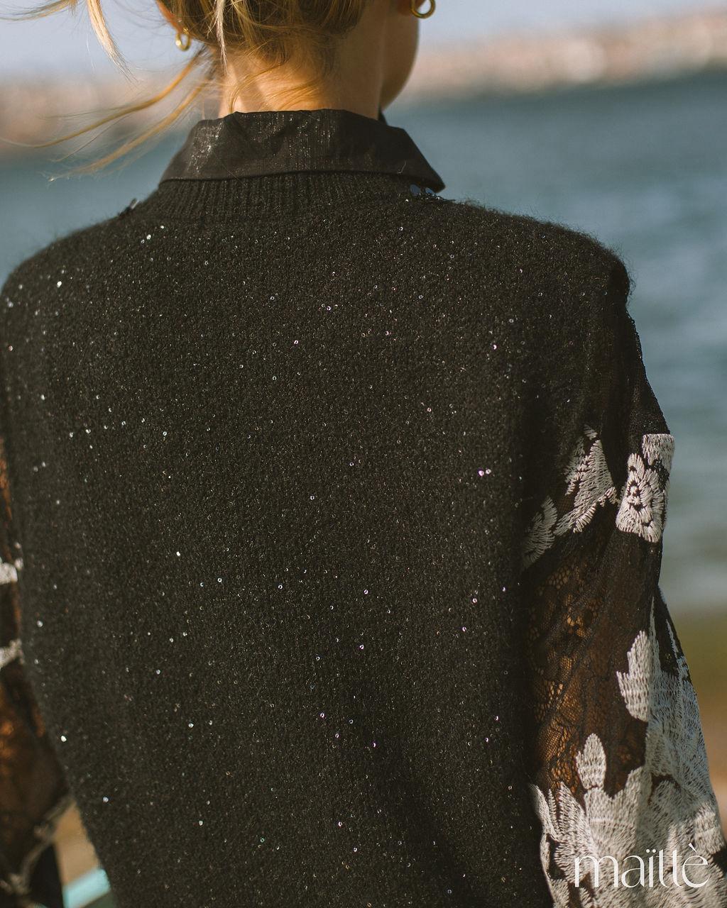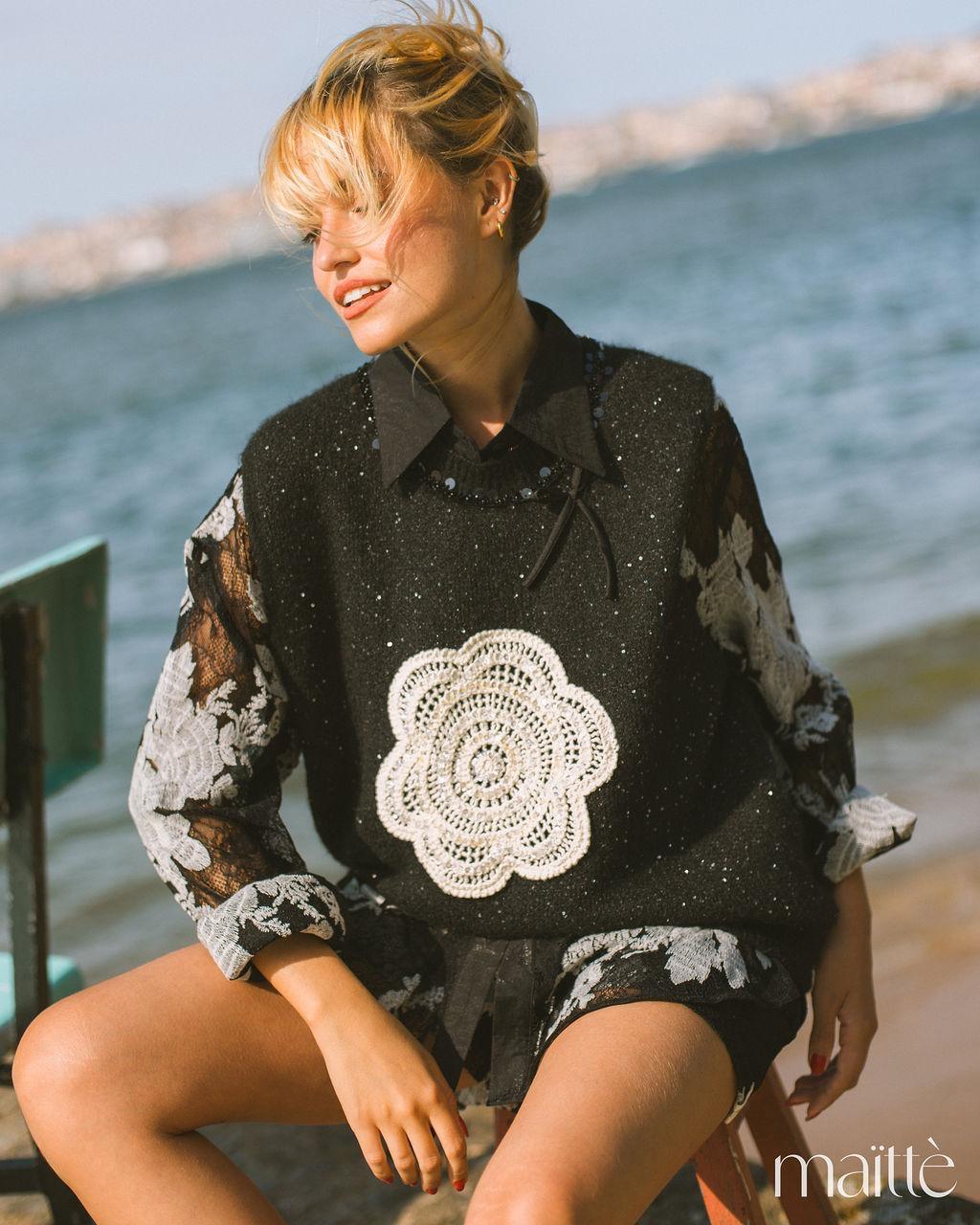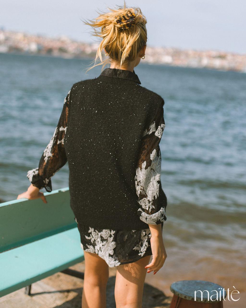 Colete de malha com brilho, na cor preto, com flor maxi branca na frente. Decote redondo, subido.