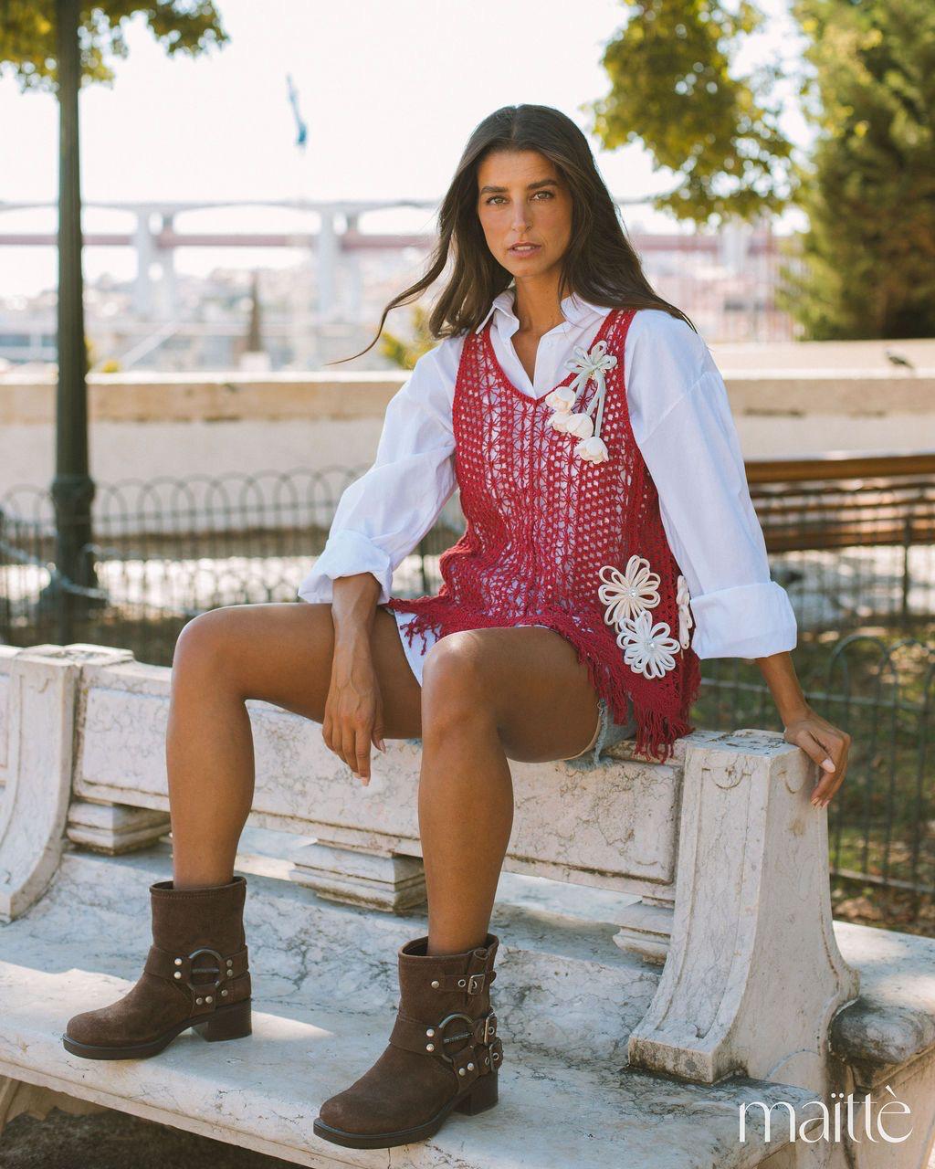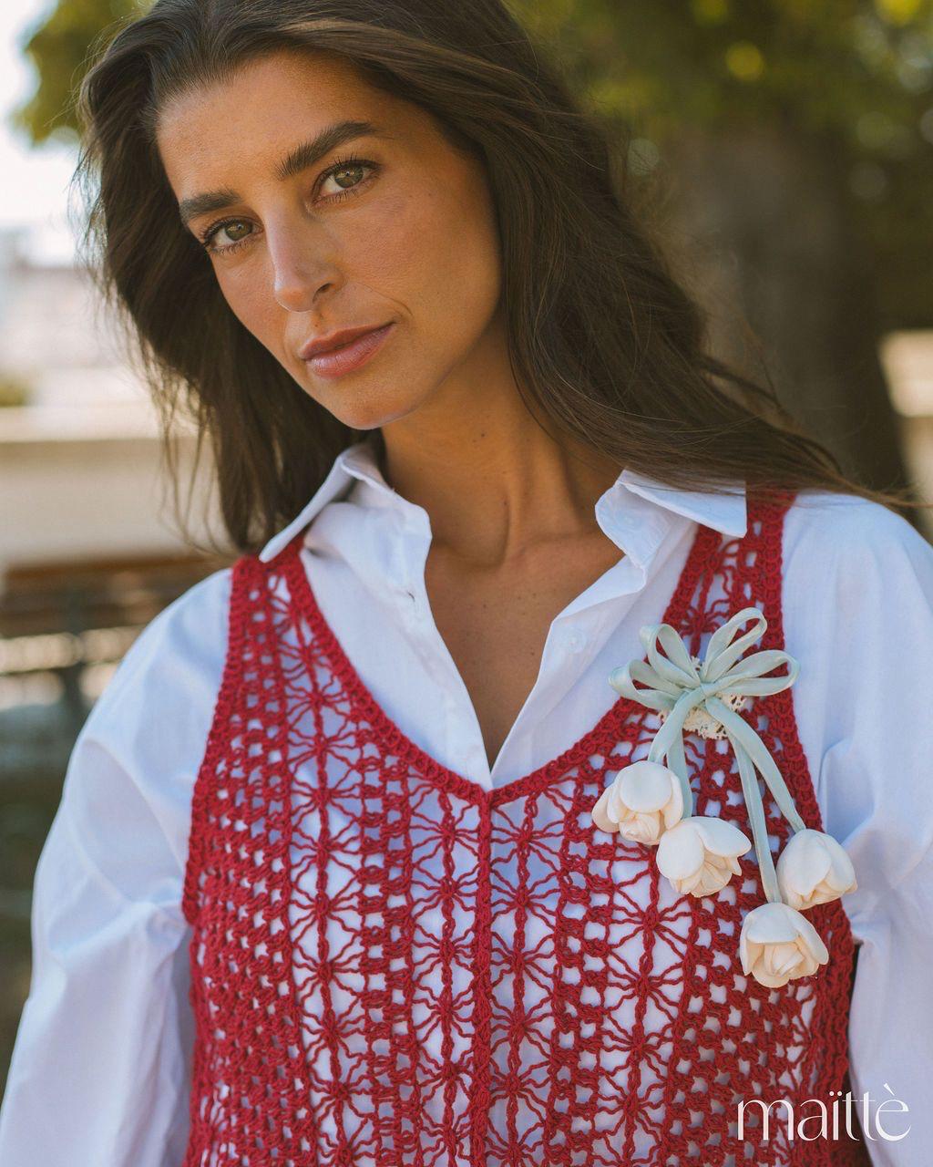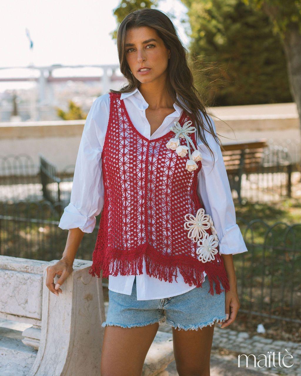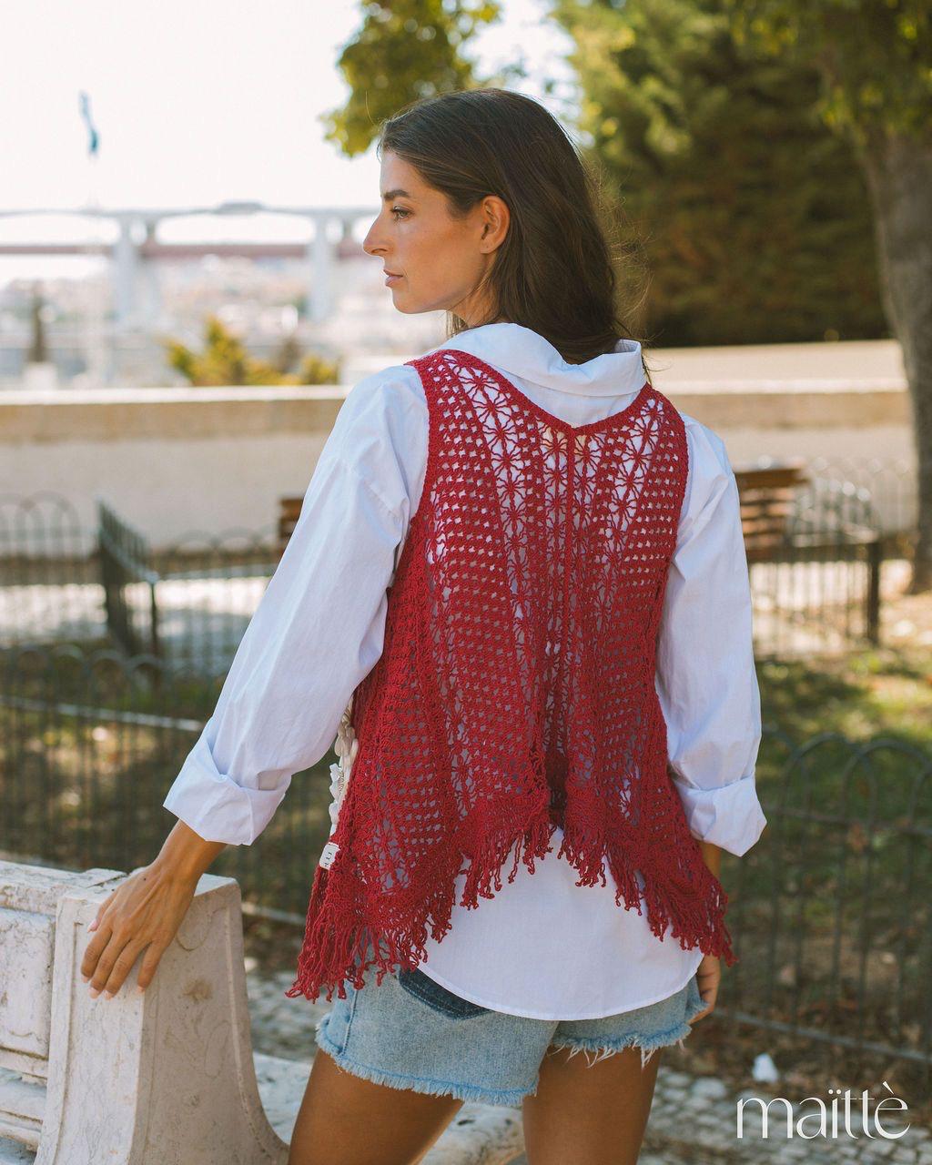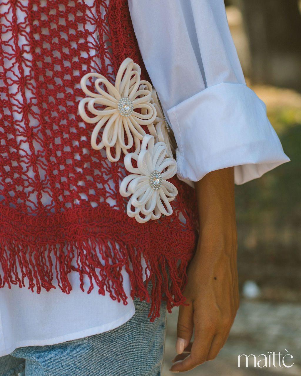 O colete, em renda perfurada, está cheio de detalhes fixos e tem também um alfinete amovível.