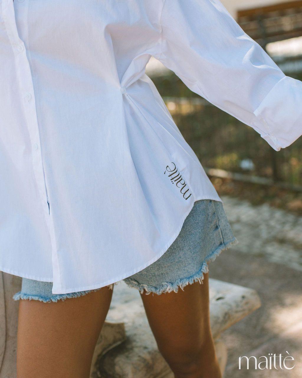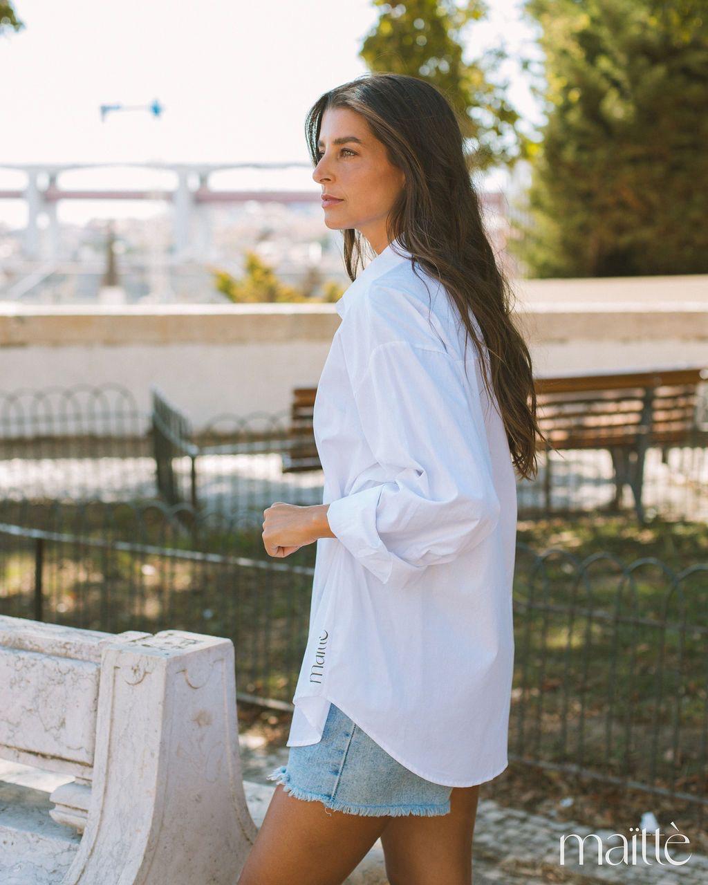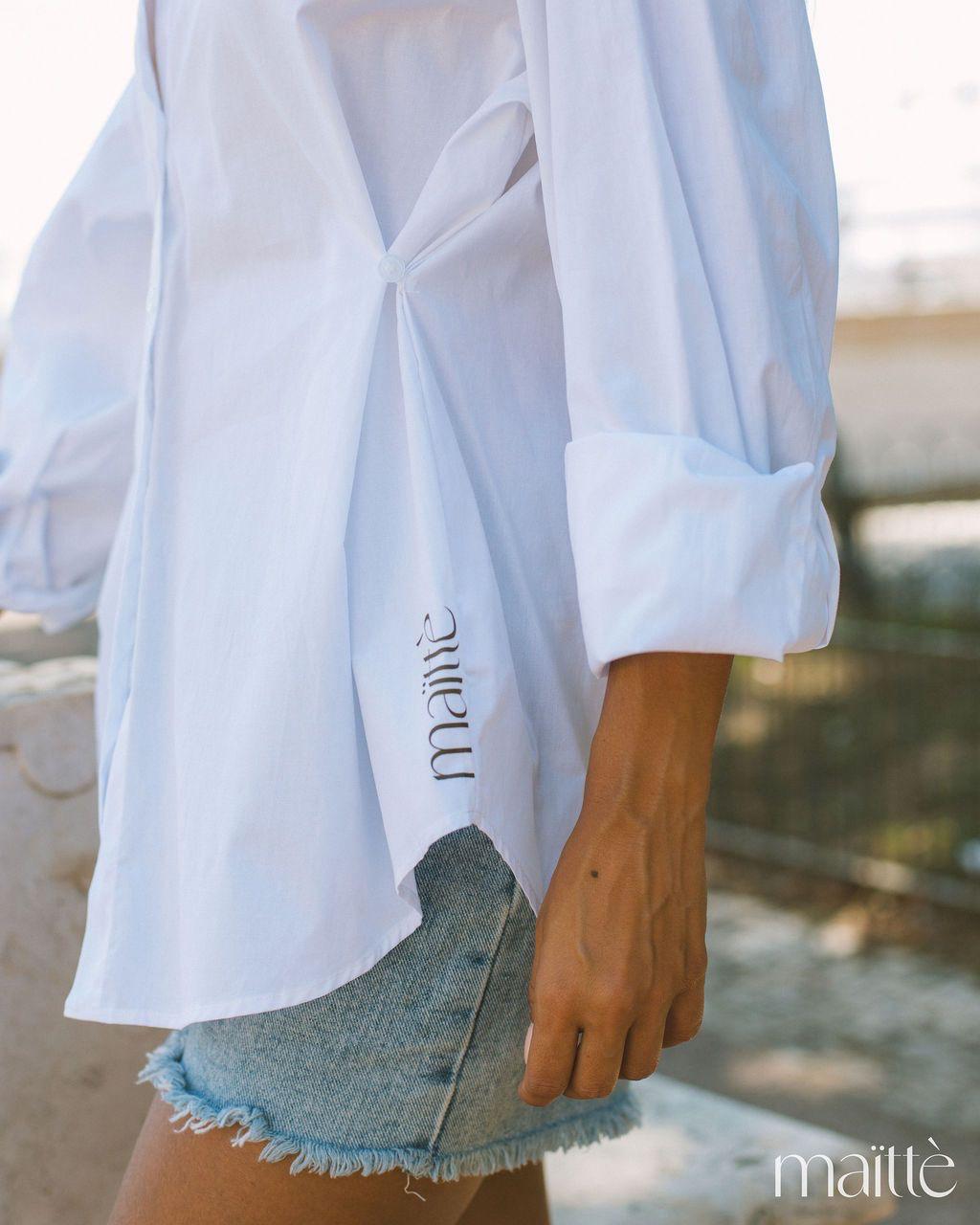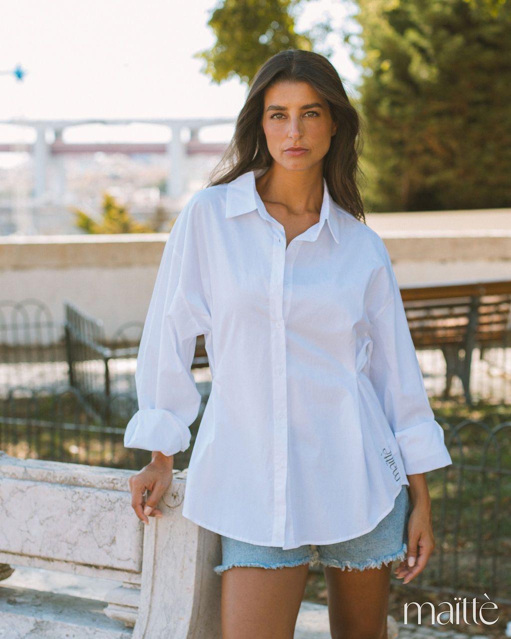 A camisa, um essencial branco, tem além do logo da marca um detalhe de repuxado frontal, dando-lhe uma unicidade linda e romântica. Pode ser usada sozinha e conjugada com outra peça.