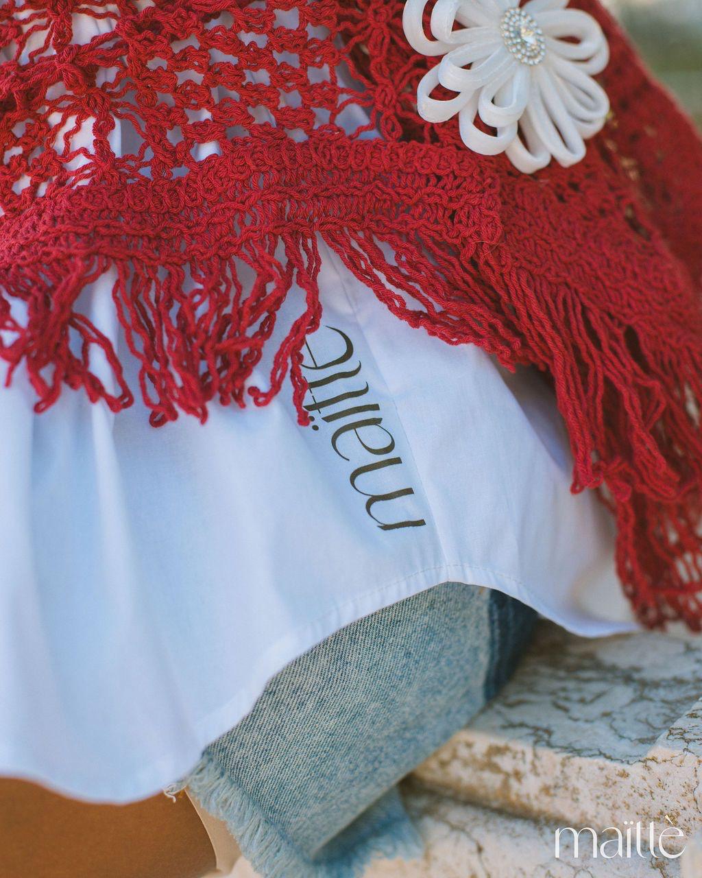 Conjunto composto por camisa branca e colete vermelho.