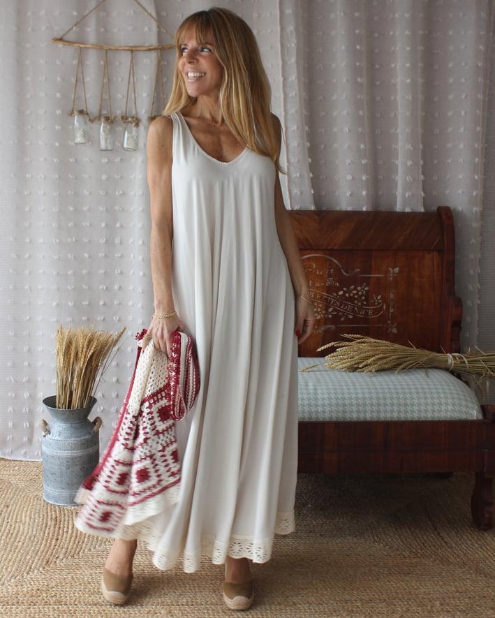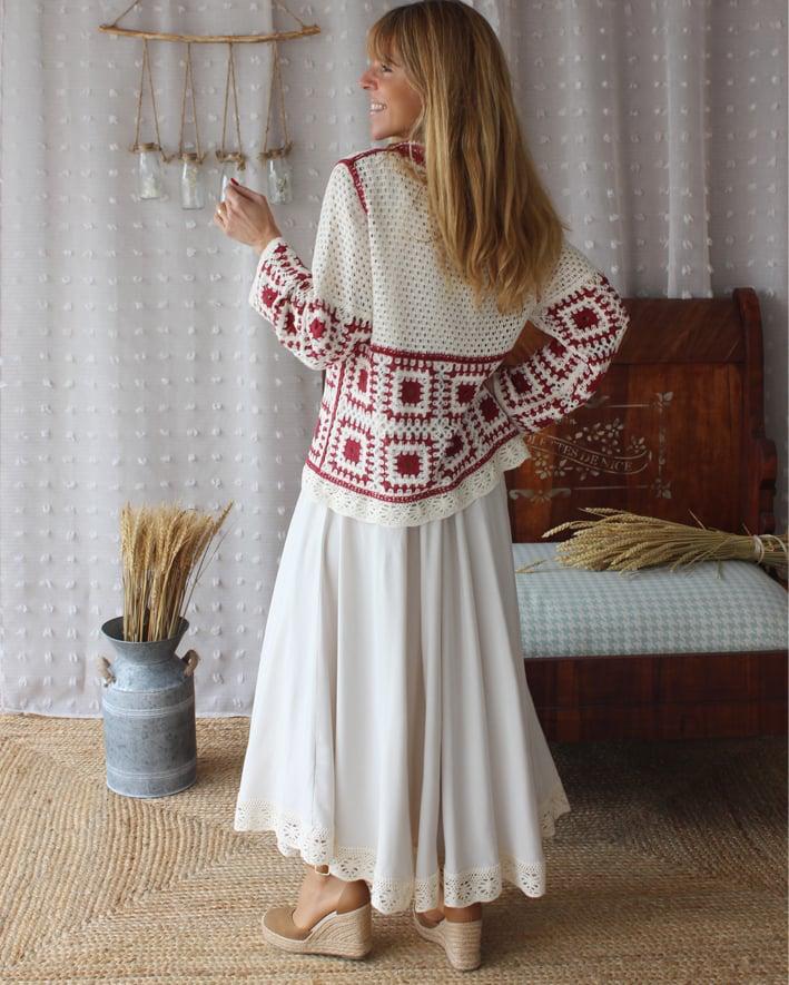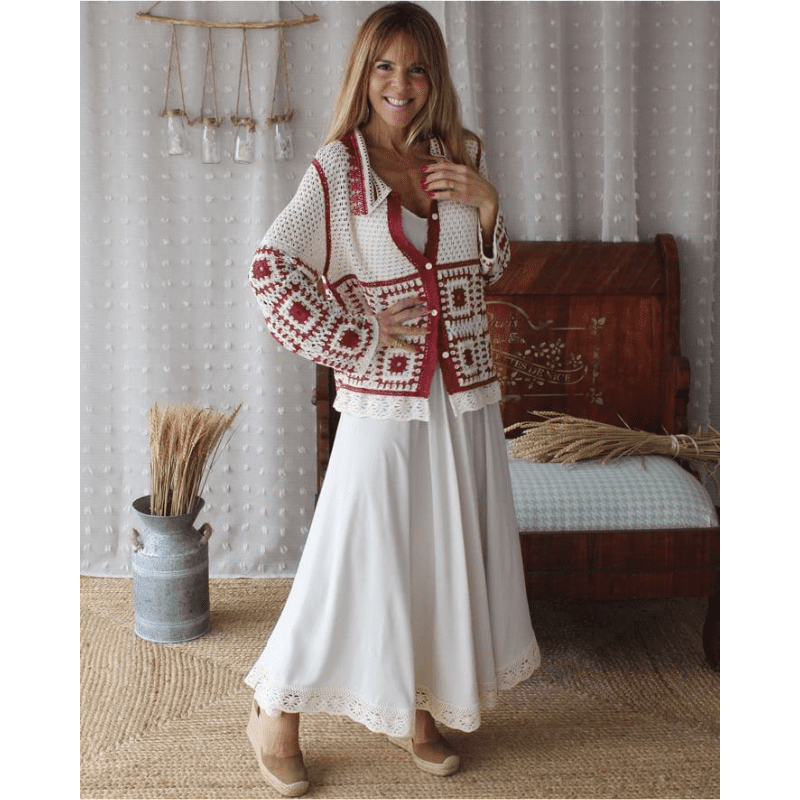 CONJUNTO VESTIDO COMPRIDO CRU E CASACO RENDA VERMELHO MARIA CATITA – TAM U