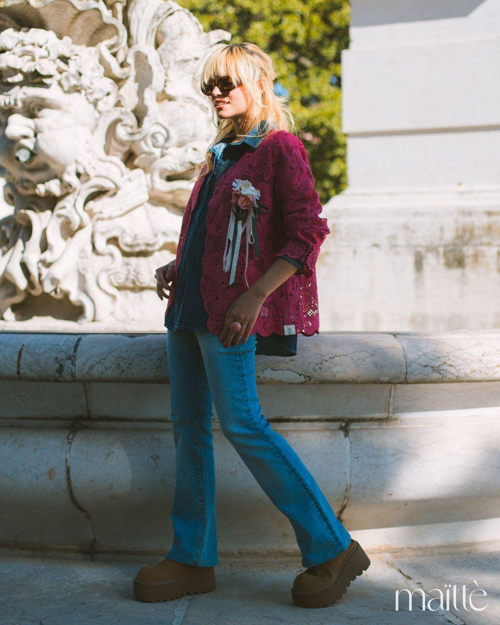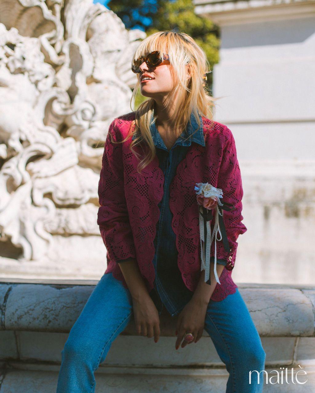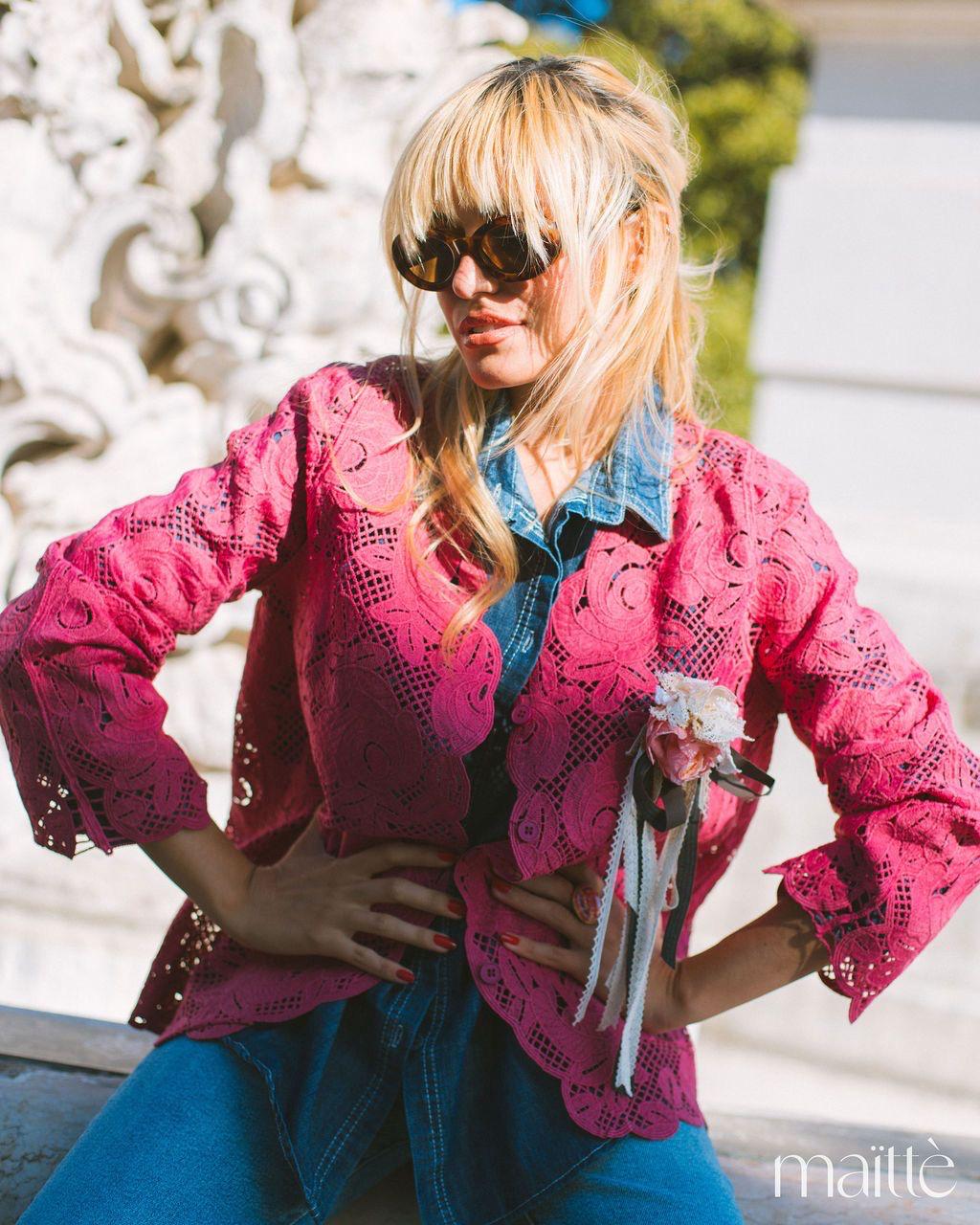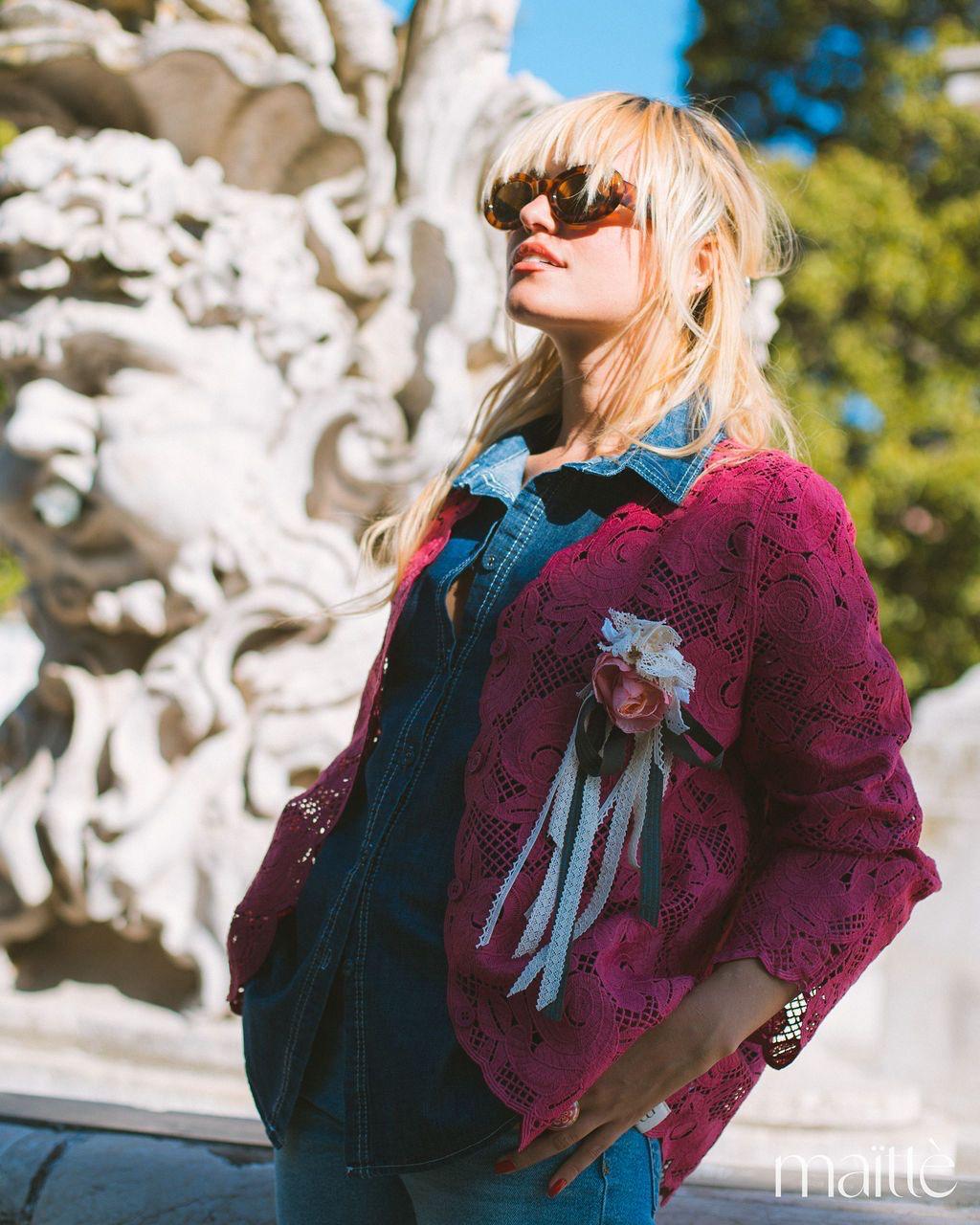 Jaqueta rendada, num tom de rosa escuro, com alfinete com detalhes amovível. Fecha com botões no mesmo tom.