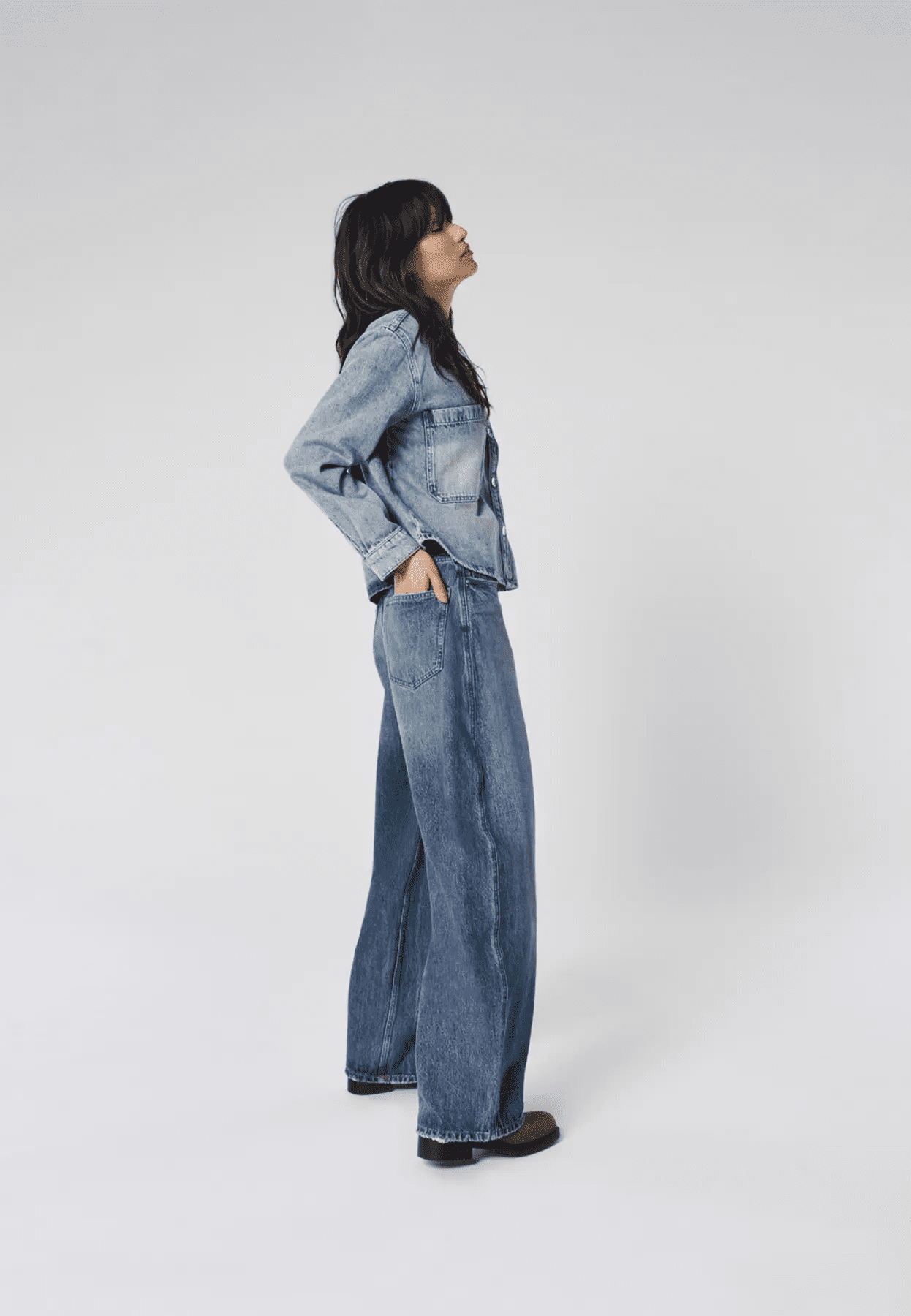 Calça jeans azul médio, corte balão – a grande tendência desta estação – de cintura bem subida.