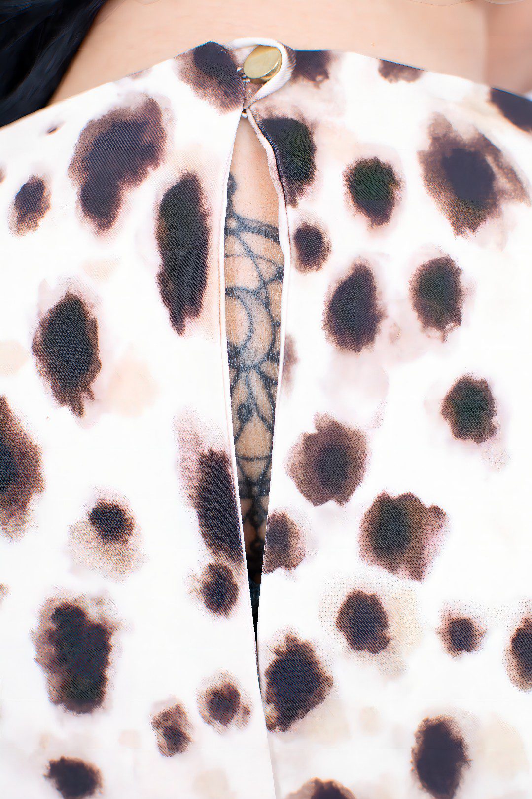 Macacão animal print, manga comprida com punho. Abertura nas costas com fecho e botões em ouro velho.