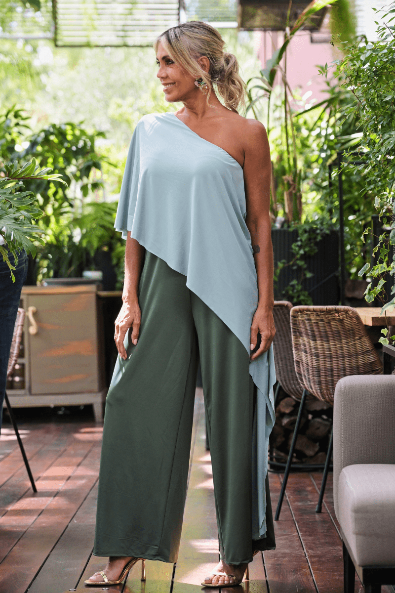 Macacão em lycra premium, com topo assimétrico, em dois tons de verde.