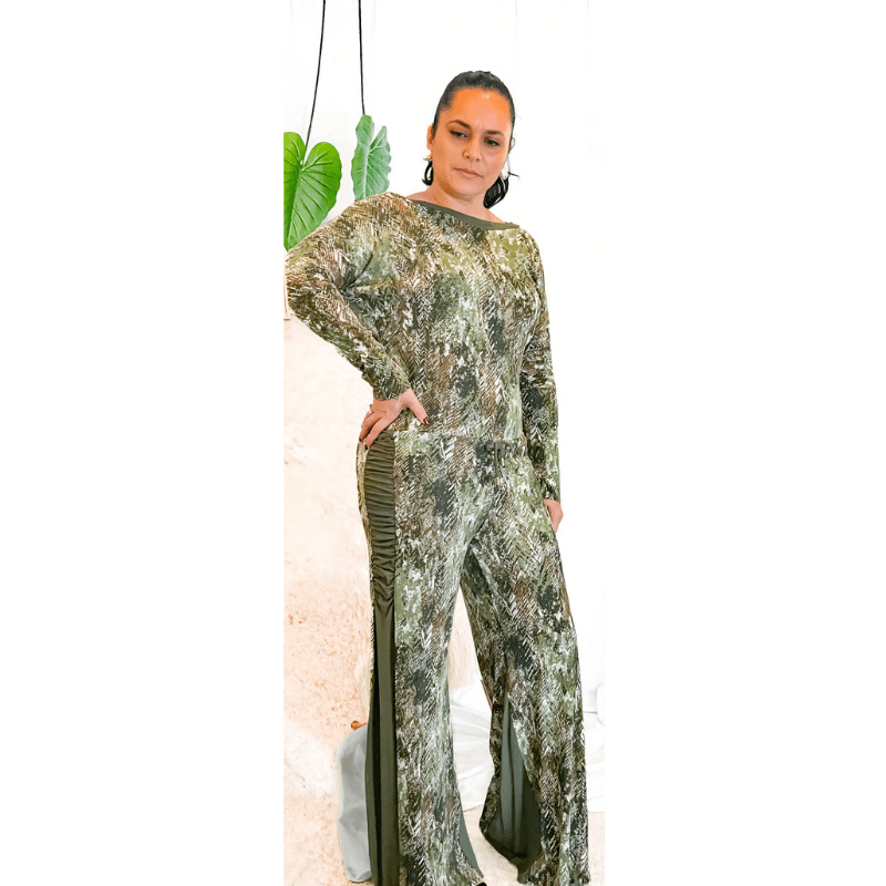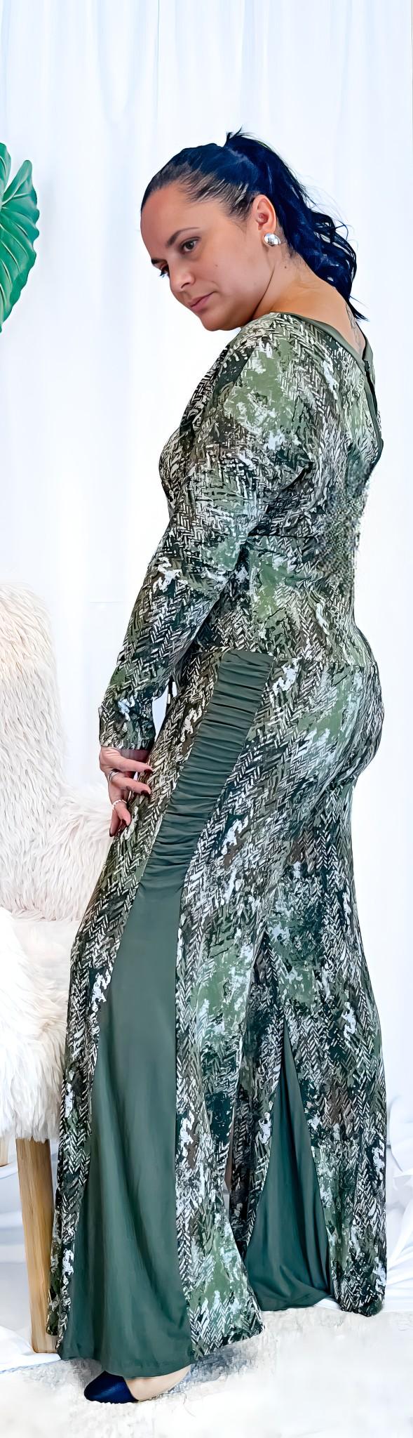 Macacão de lycra, estampado em fundo verde. Manga comprida com com lista lateral. Abertura atrás com botão. Atilho na cintura.