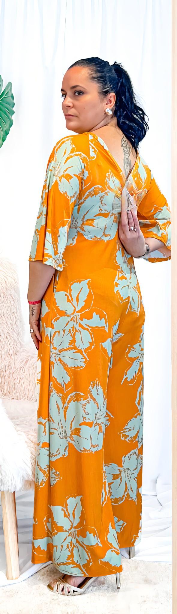 Macacão em malha fria, com bolsos. Decote em V na frente e nas costas. Manga a 3/4 évasé.