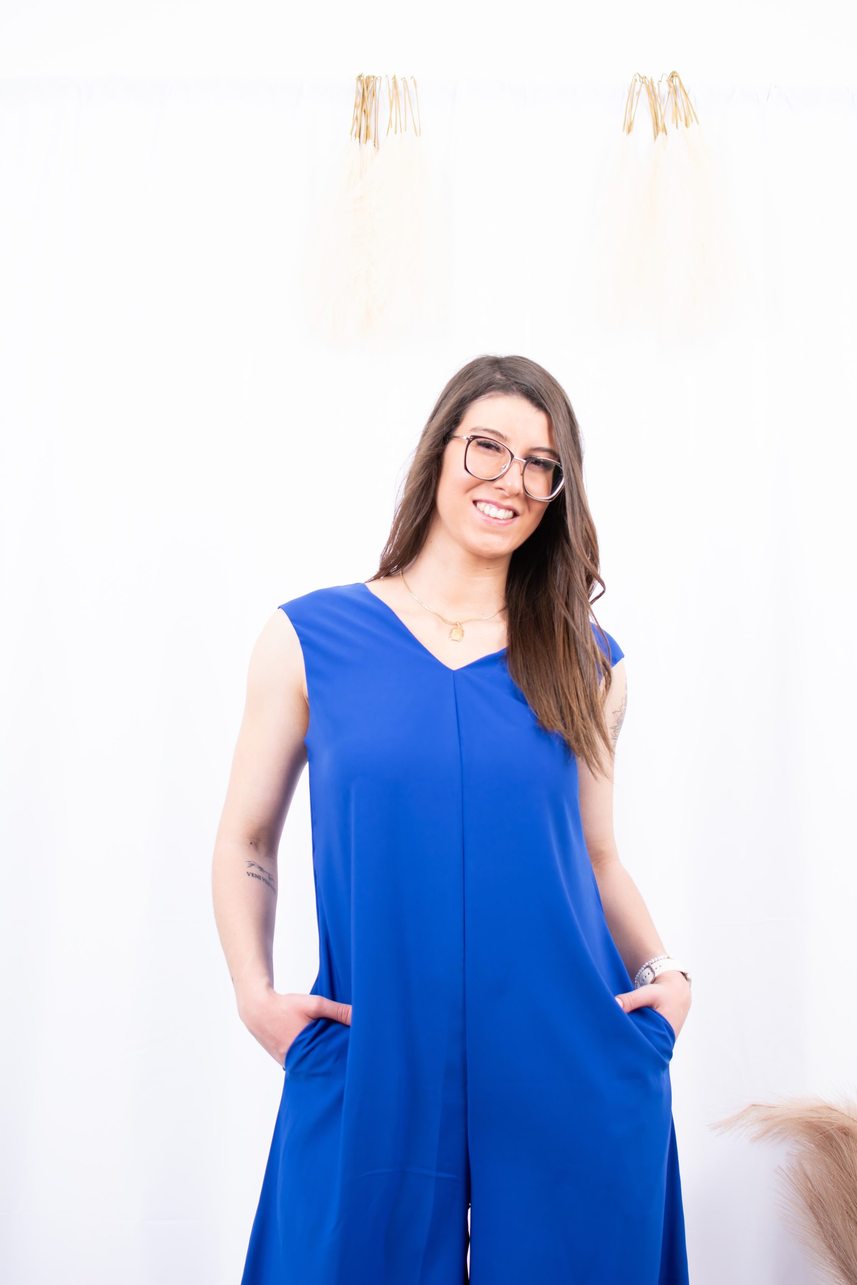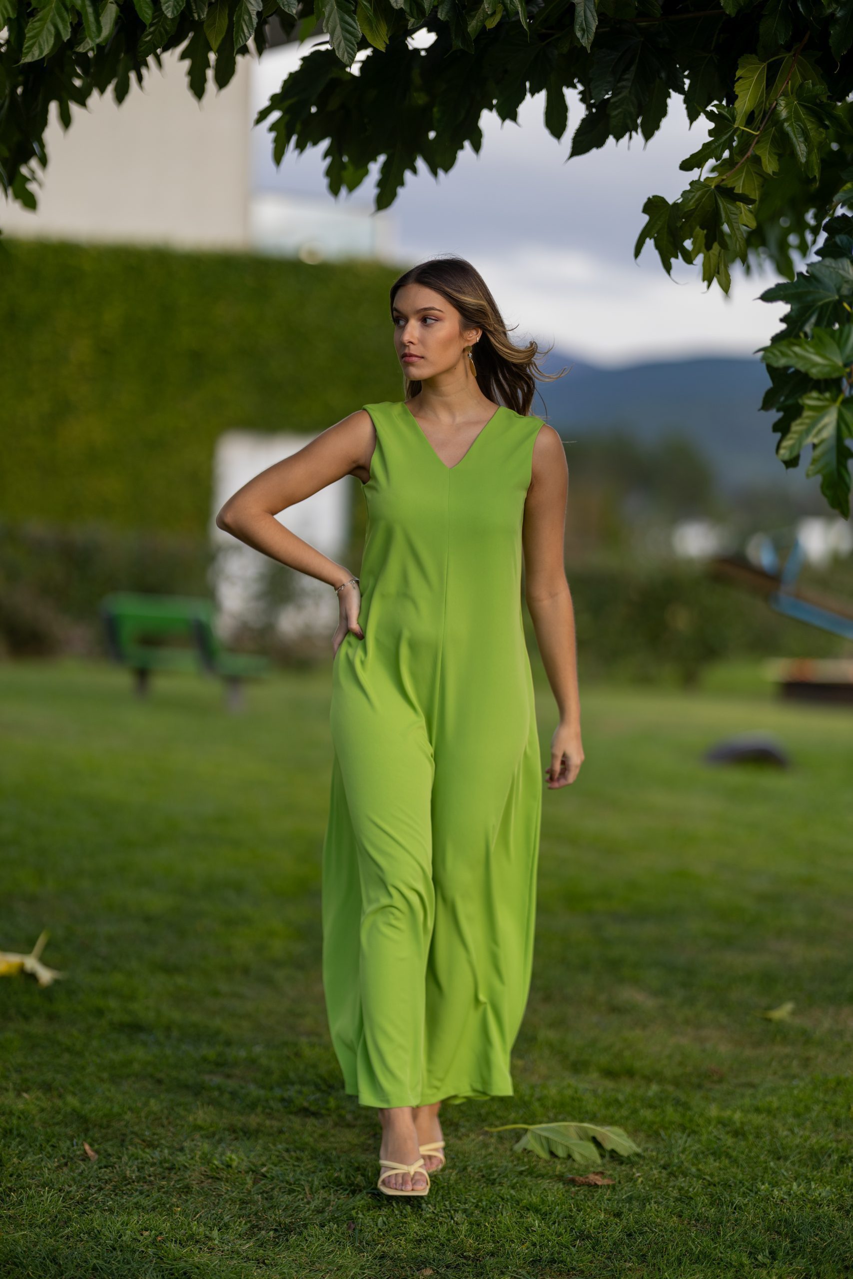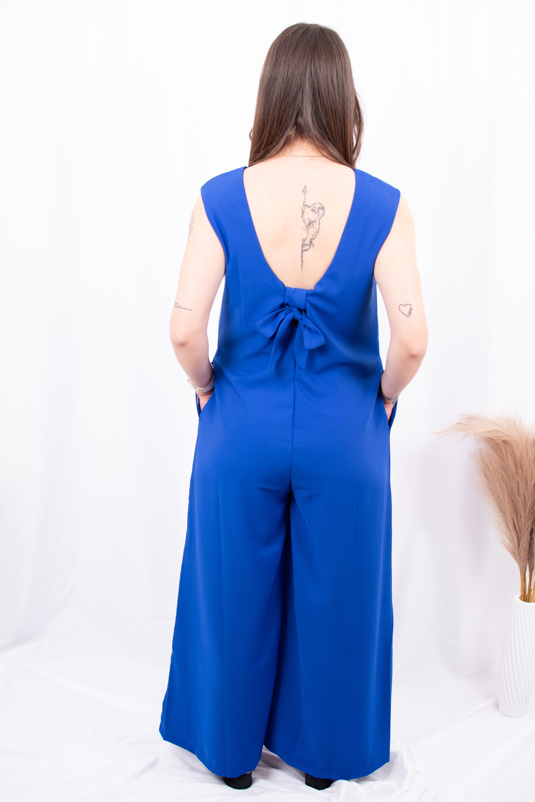 Macacão oversize, decote em V na frente. Ata nas costas com laço. Sem mangas. Bolsos laterais.