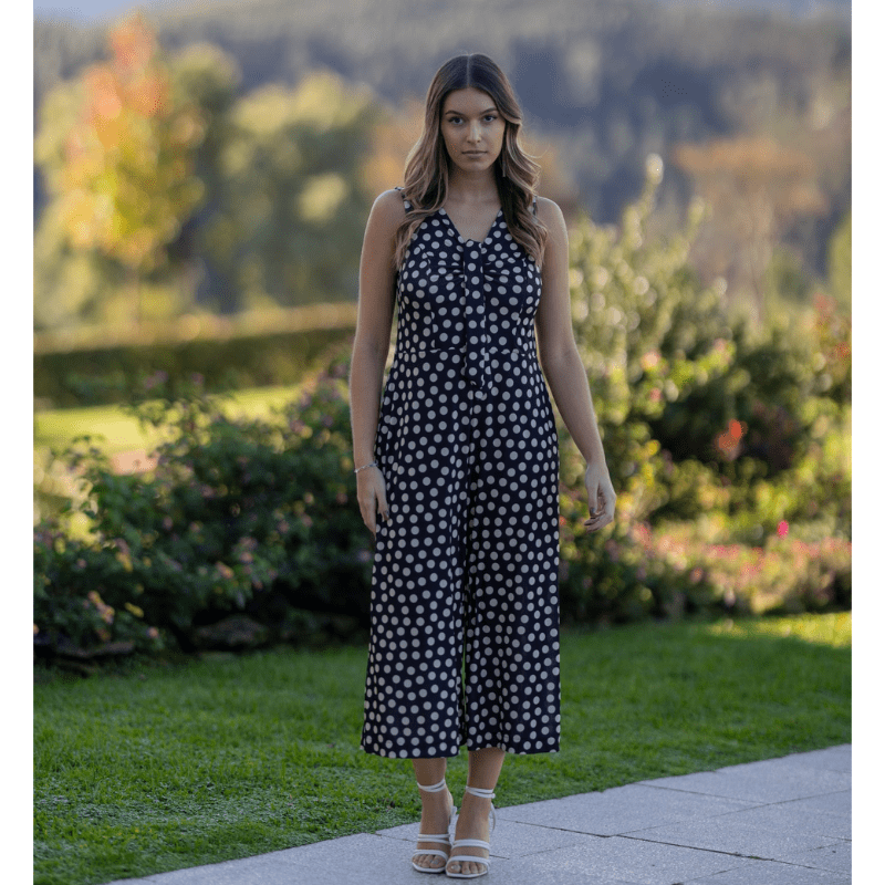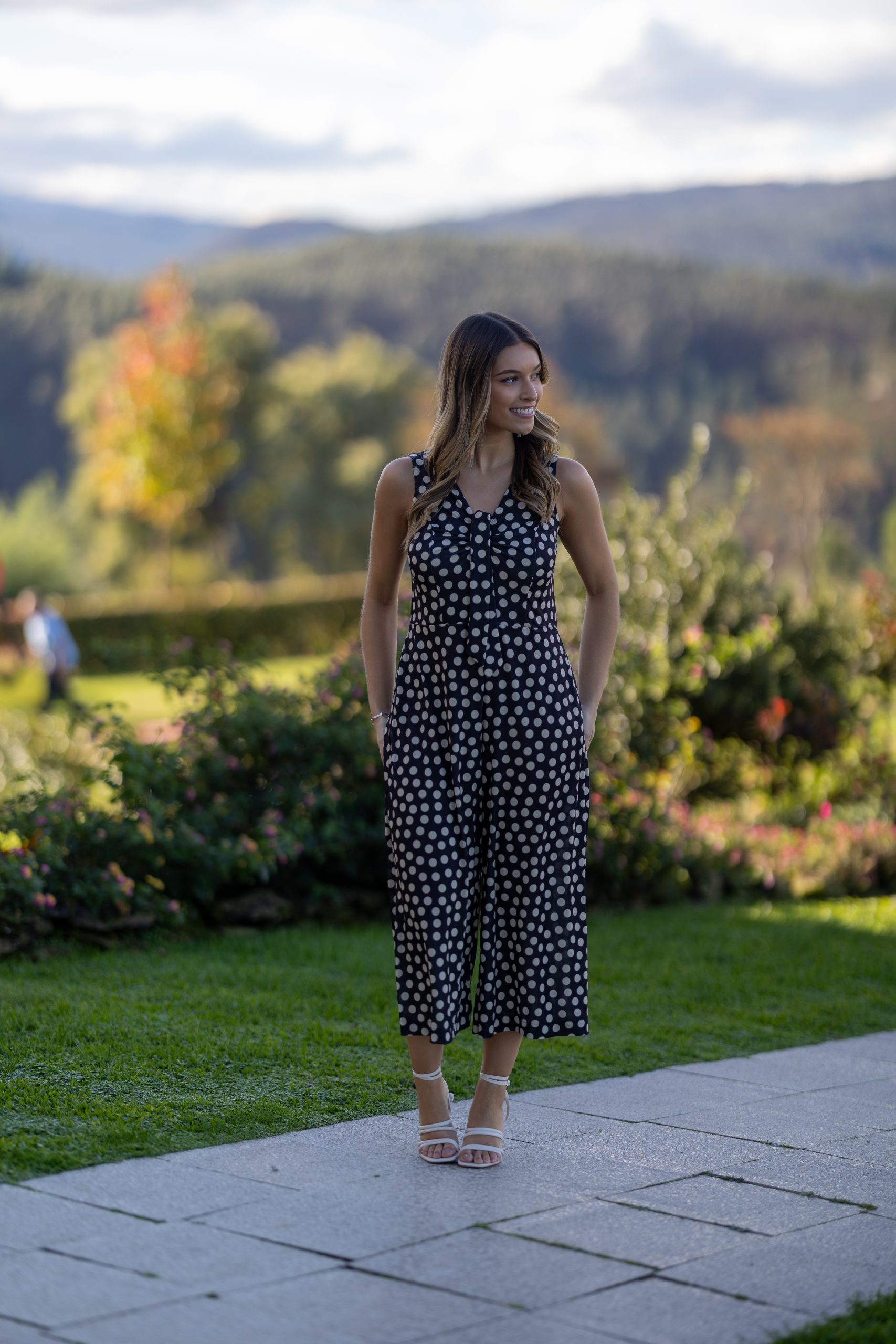 Macacão preto em malha fria, com bolas beges. Decote em V. Sem mangas. Bolsos laterais.