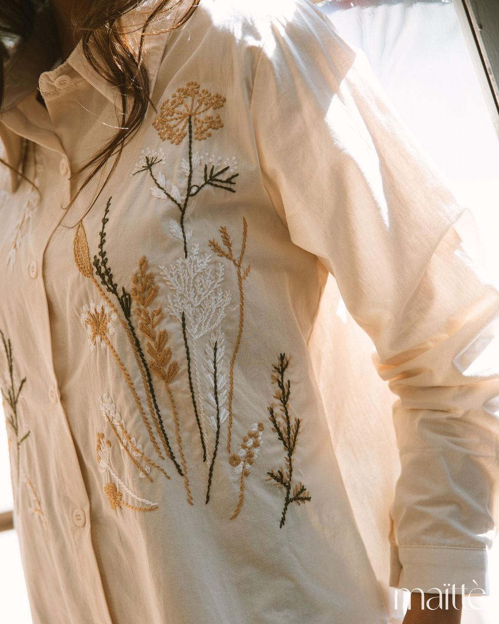 Camisa de manga comprida, em tom cru com flores bordadas em tons camel e verde.