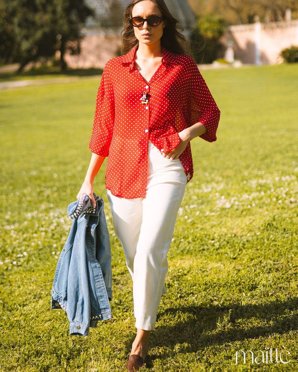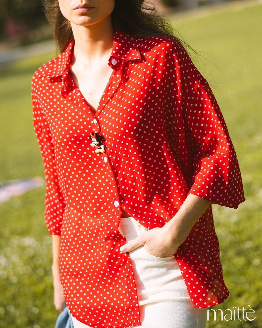 Camisa em viscose, polka dots vermelho e branco, leve e linda! Comprimento ao nível da anca, manga comprida e ligeiramente transparente. Detalhe de @minie amovível.