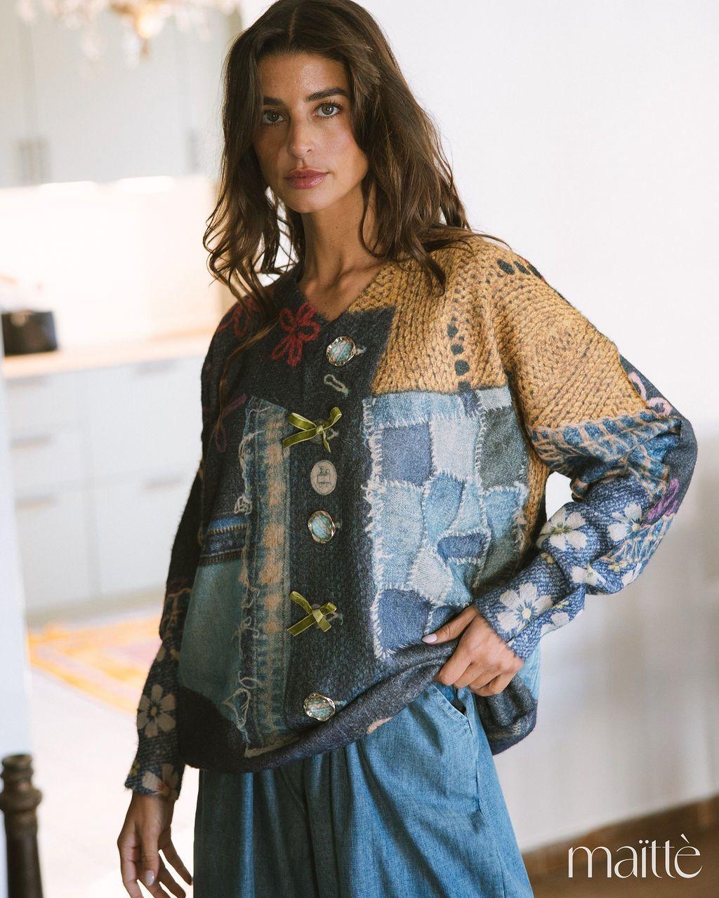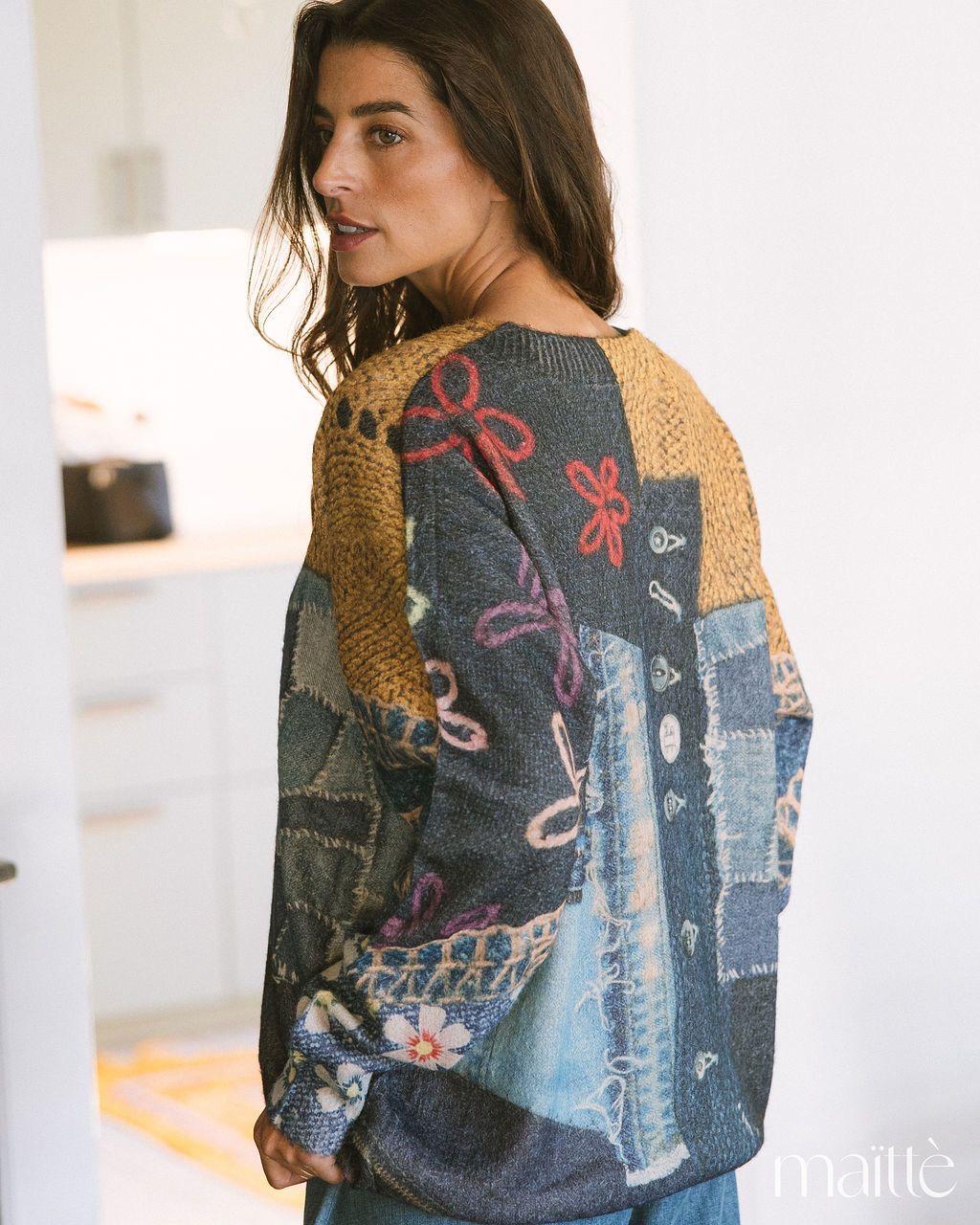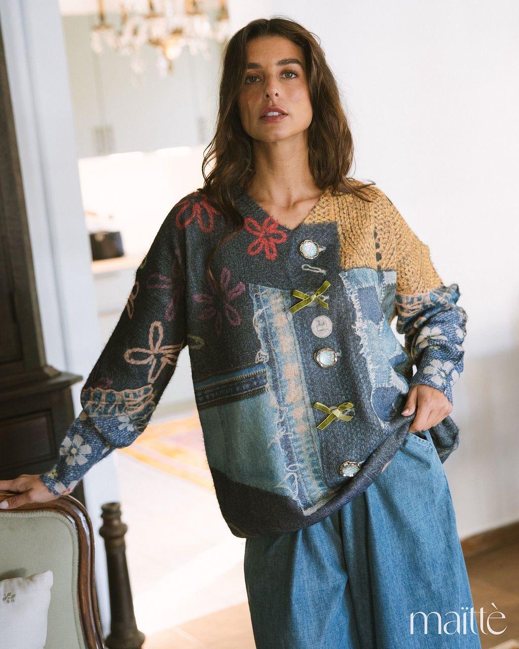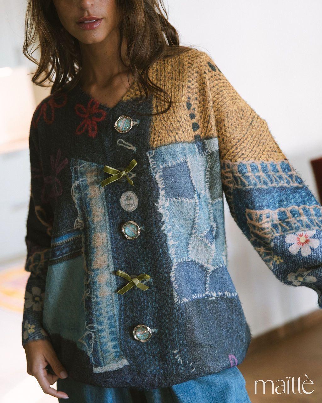 Camisola de lã em tons de camel e azuis ganga, cheia de detalhes.