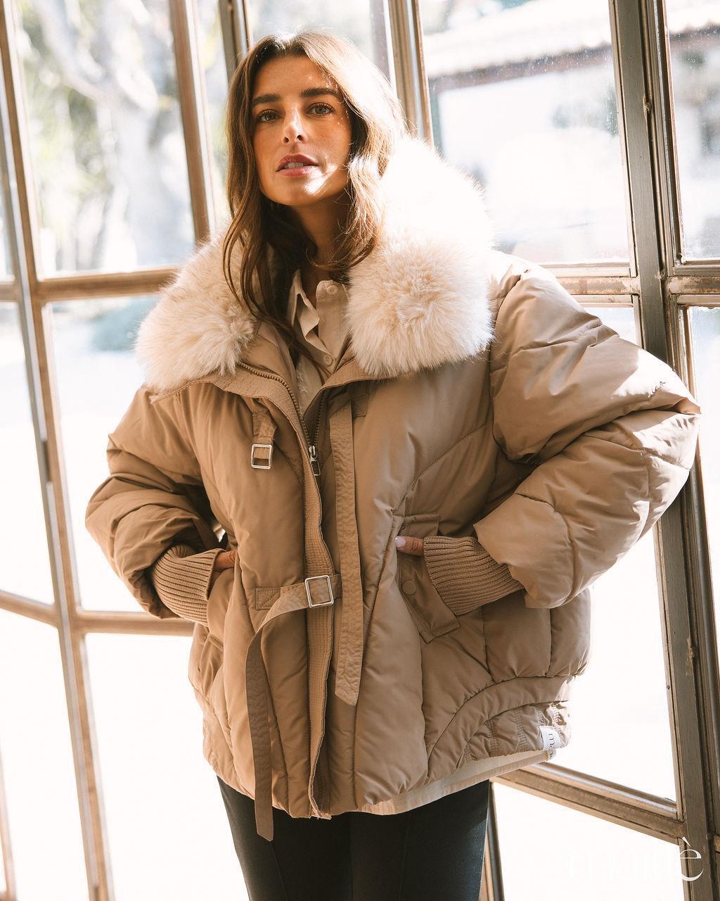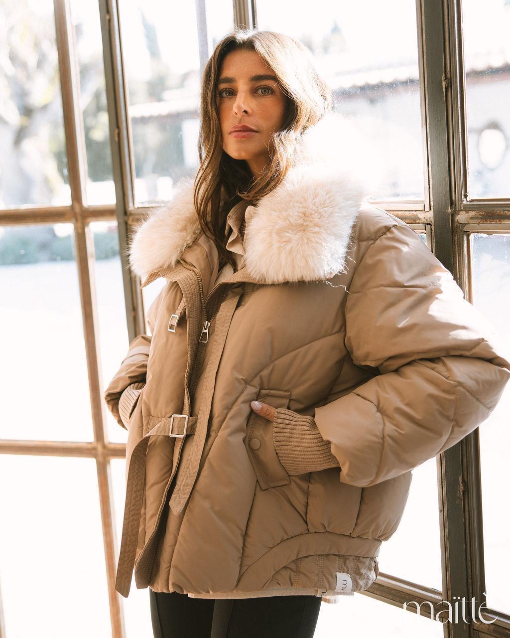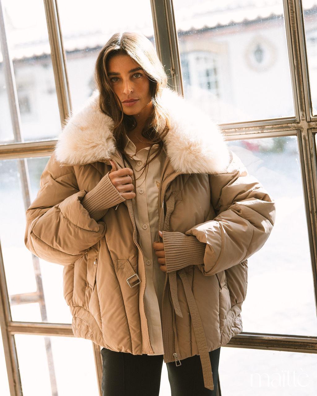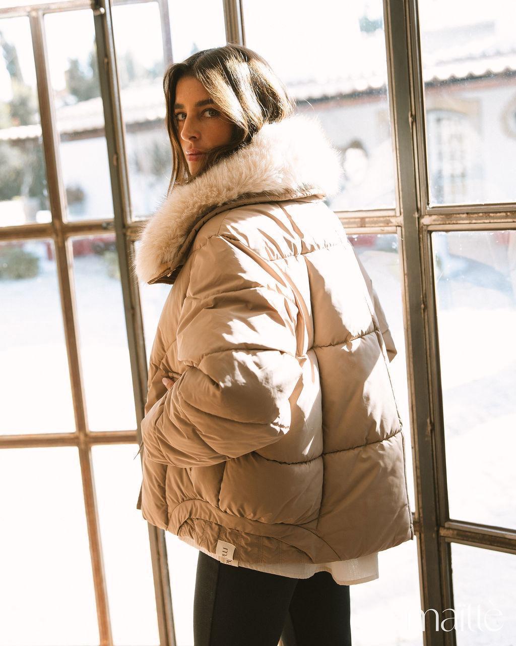 Casaco estilo Kispo, ligeiramente oversize, em tom bege com gola amovível em tom cru. Punhos em malha elástica.