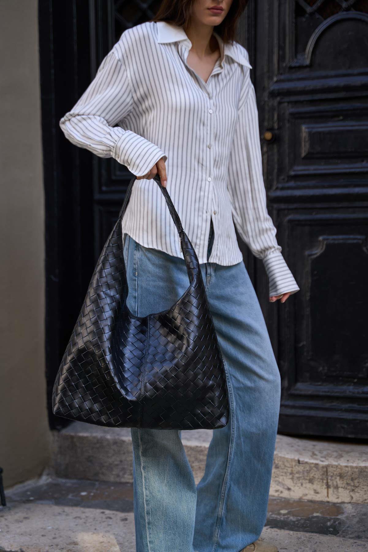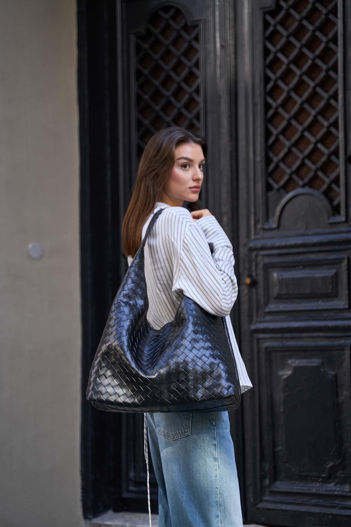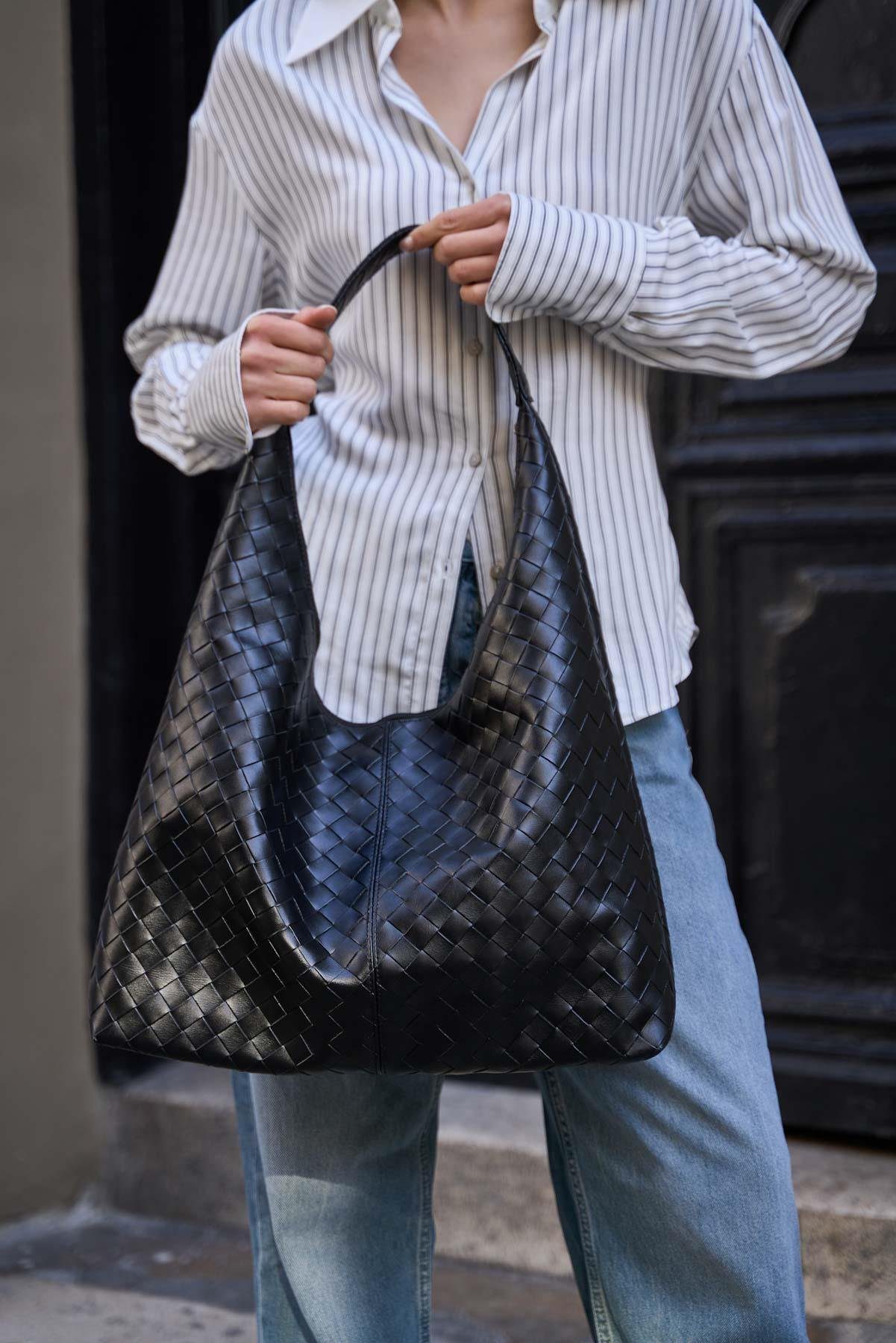 Mala de ombro, maxi size, em simili encanastrado, com detalhe único em cada uma delas.