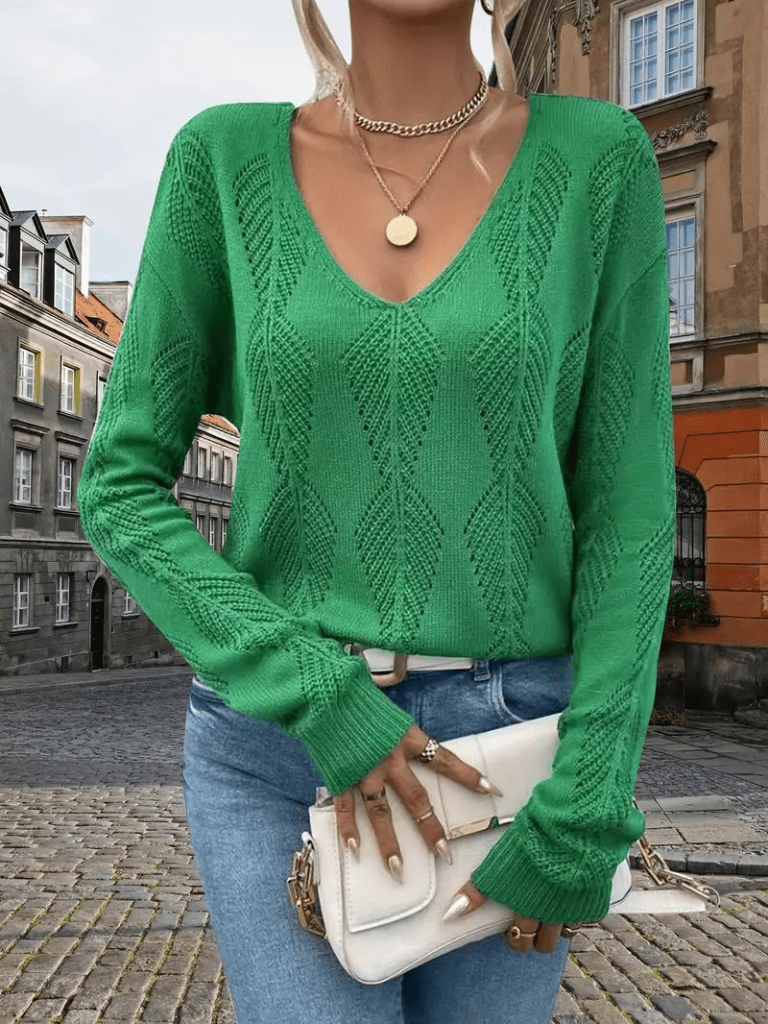 Malha trabalhada verde, decote em V à frente e atrás, com botões brancos nas costas.