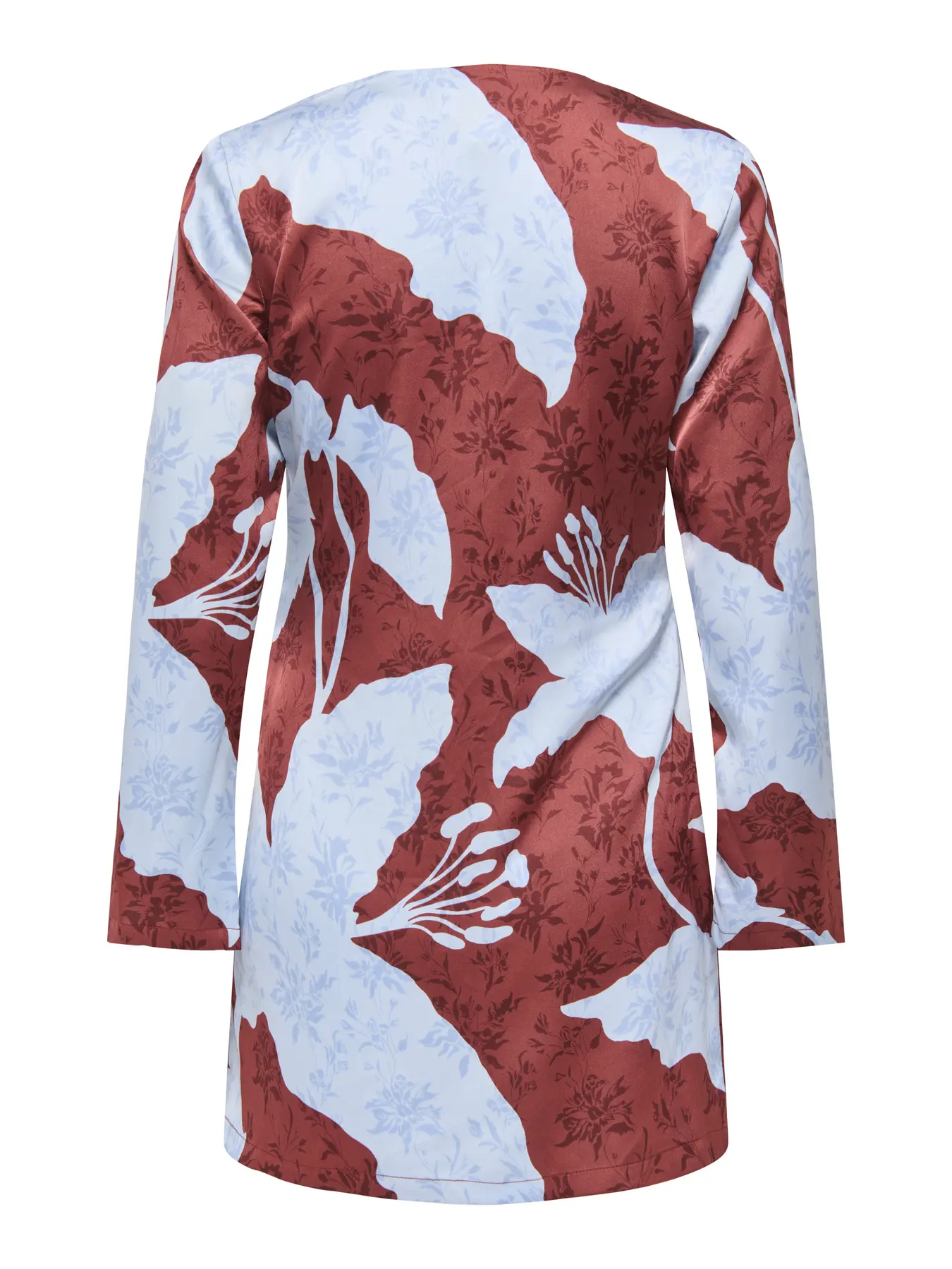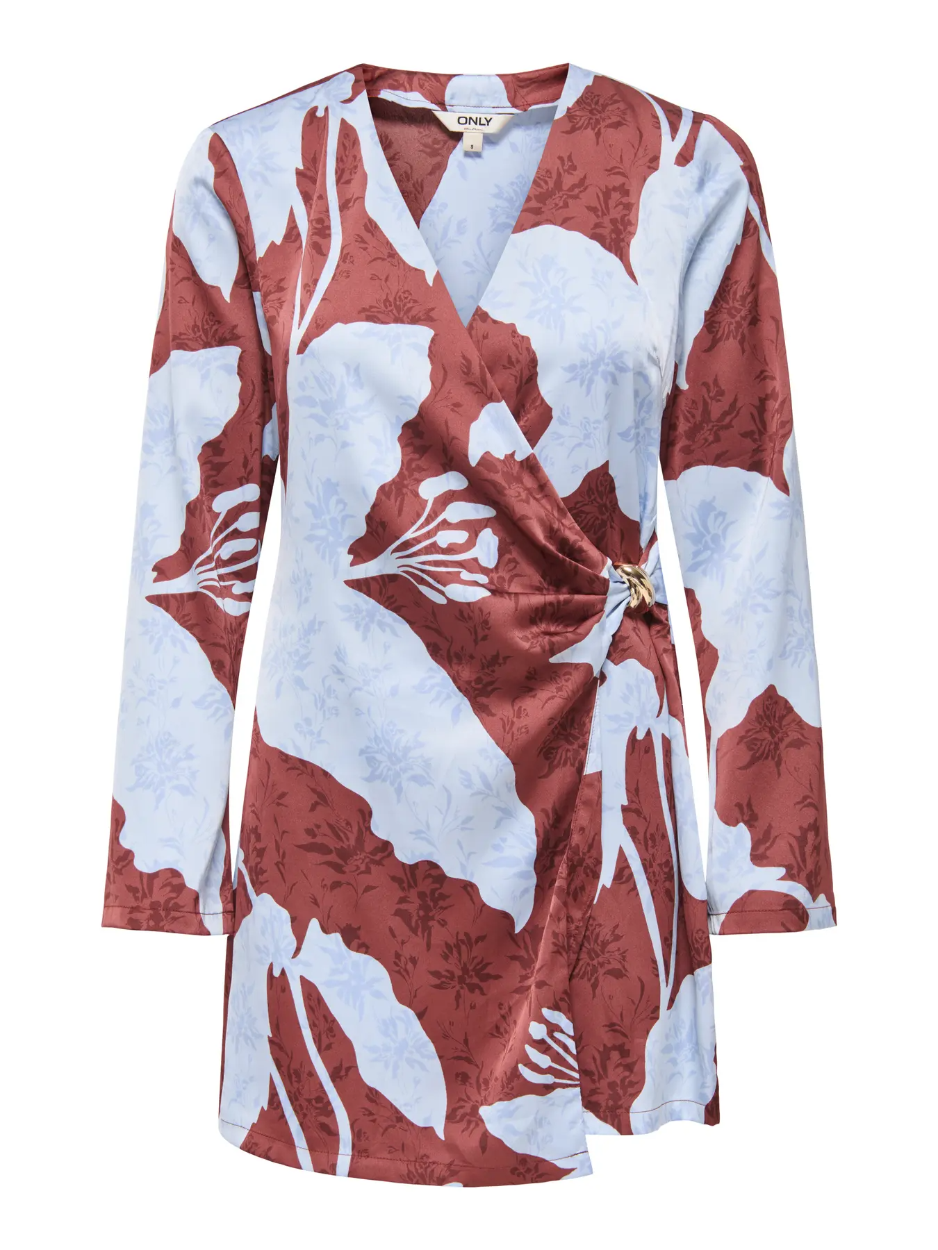 Vestido curto, em tecido acetinado com estampa dupla azul pastel e castanho (a ir para um terracota) – “Hot Chocolate Mega Iris”. A manga é comprida, solta e ligeiramente em asa. O decote é em V. Vestido cruzado, atando de lado com aplique dourado.