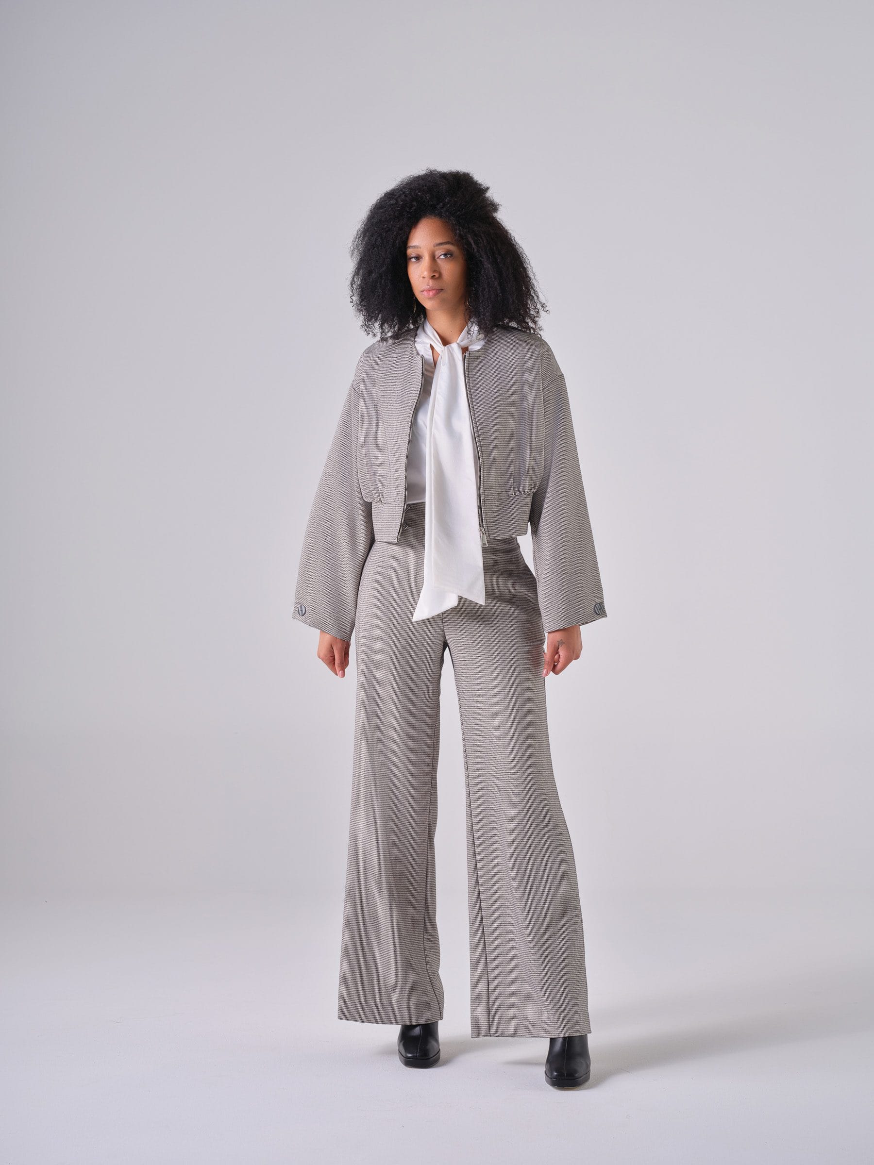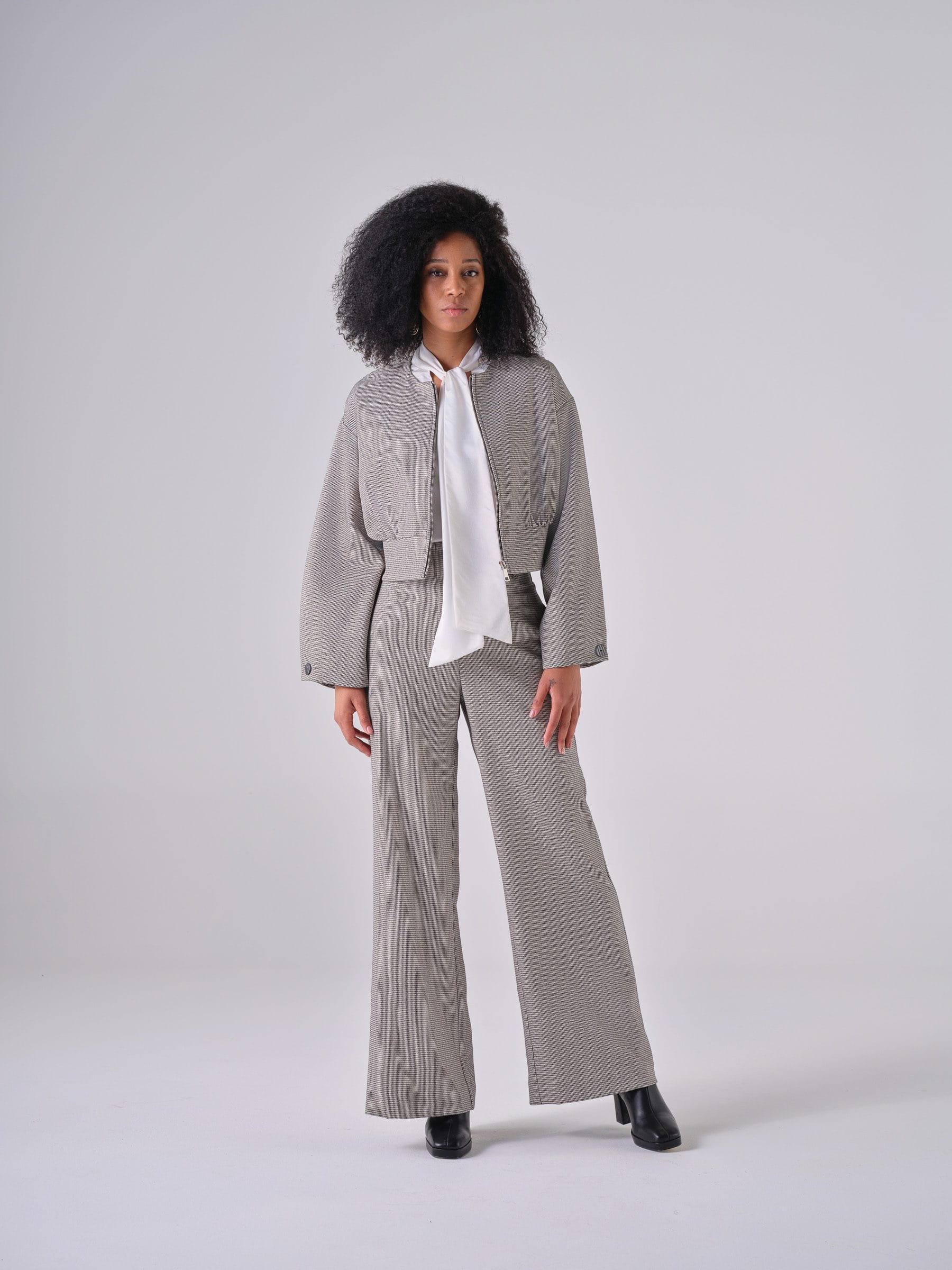 Calça estilo pantalona, “pata de galo”, de cintura subida com bolsos laterais.